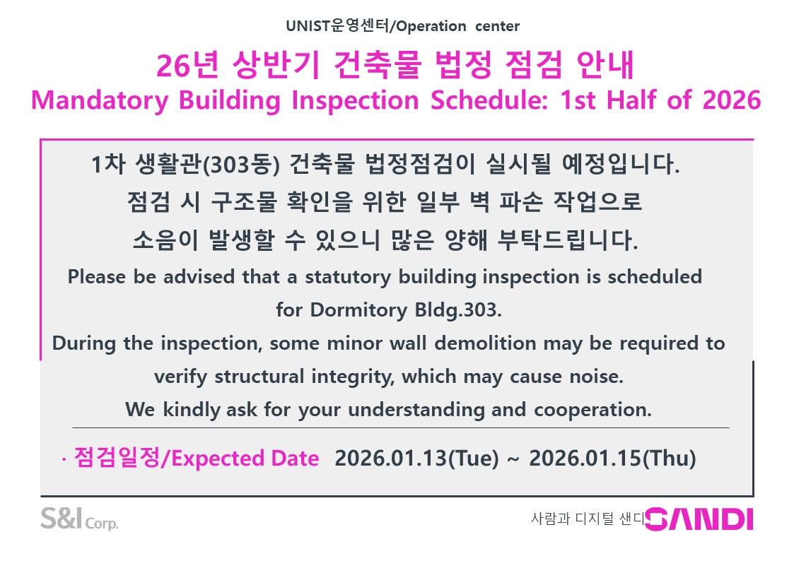 | 공지 | 26년 상반기 건축물 법정 점검 안내 / Mandatory Building I.. | 2026-01-09 | 203 |