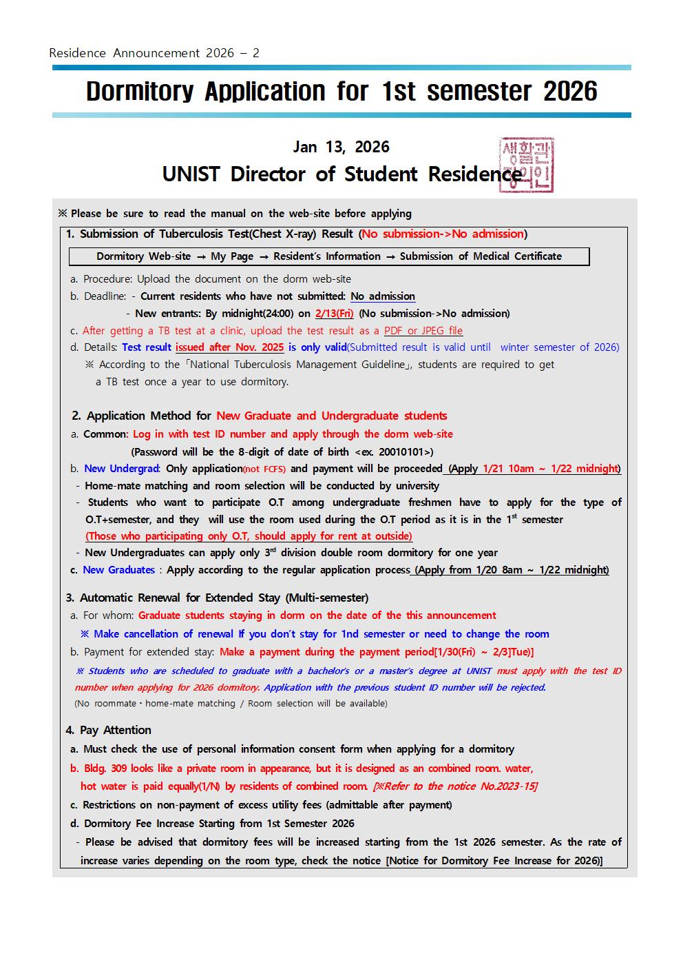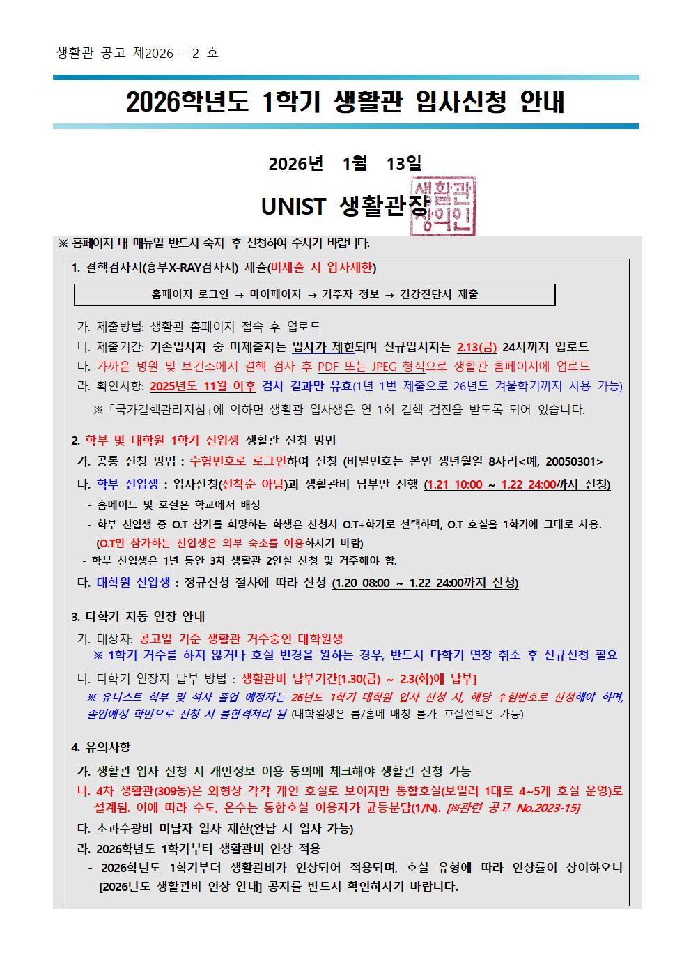 | 공지 | 2026학년도 UNIST 생활관 주요일정(Main Schedule of UNIST .. | 2025-12-16 | 3492 |