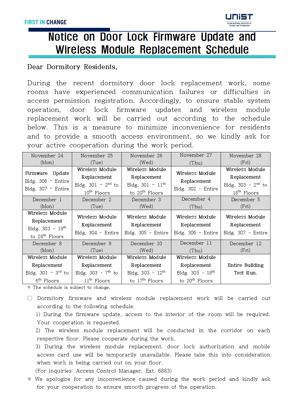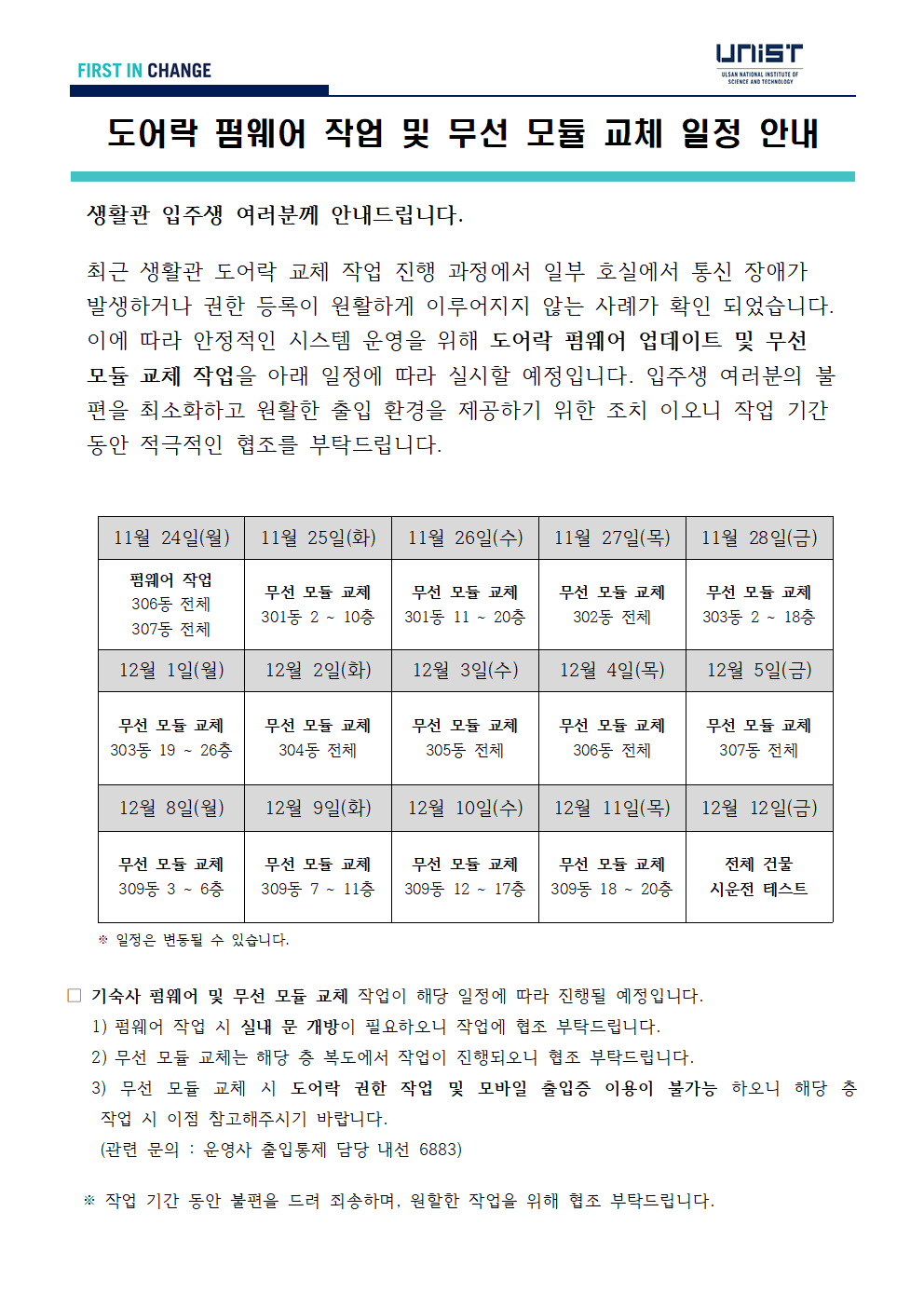 도어락 펌웨어 작업 및 무선 모듈 교체 일정 안내(Notice on Door Lock Firmware Update and Wireless Module Replacement Schedule)