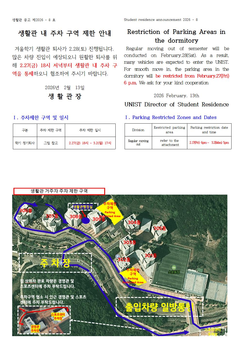 [No.2026-8] 생활관 내 주차 구역 제한 안내(Restriction fo Parking Areas in the dormitory)