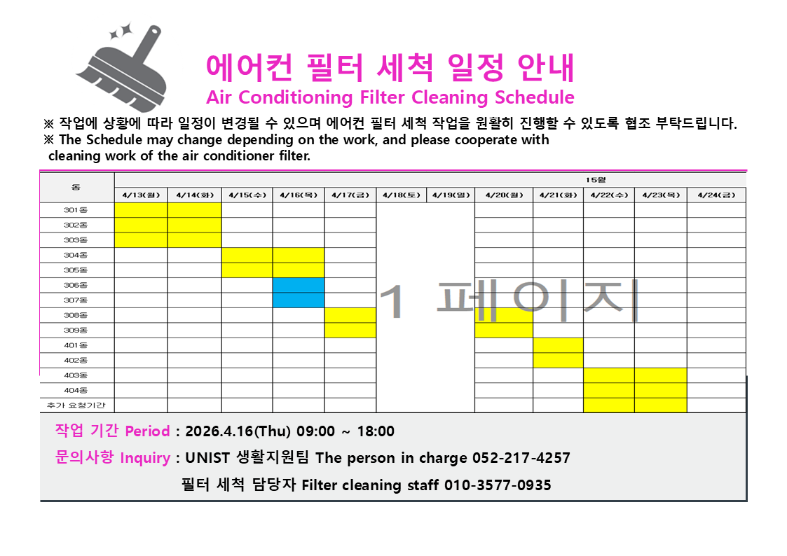 울주학사 에어컨 필터 세척 일정 안내 (Air Conditioning Filter Cleaning Schedule in building 306,307))