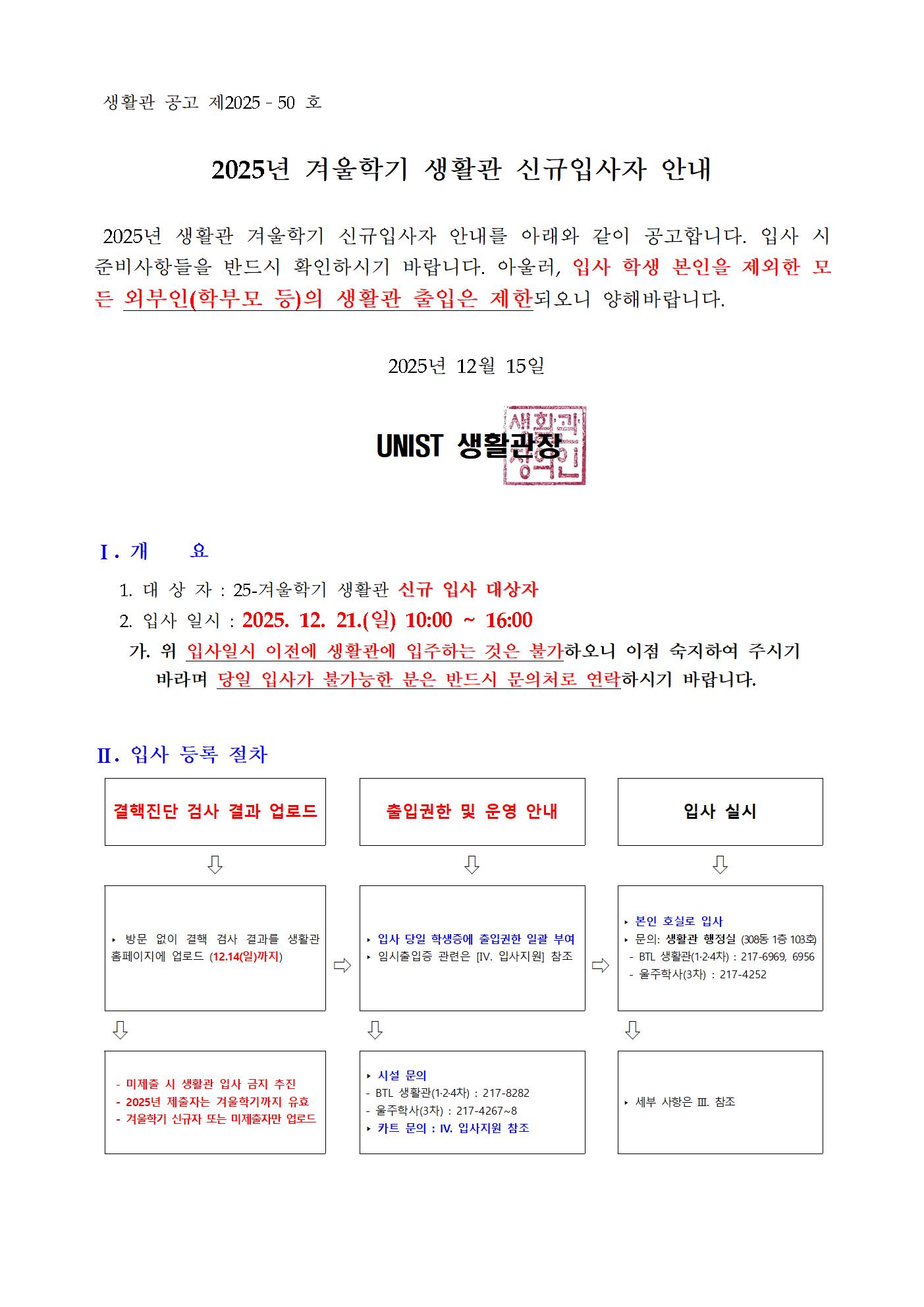 | 공지 | [No.2025-50] 2025년 겨울학기 생활관 신규입사자 안내(Noti.. | 2025-12-15 | 159 |
