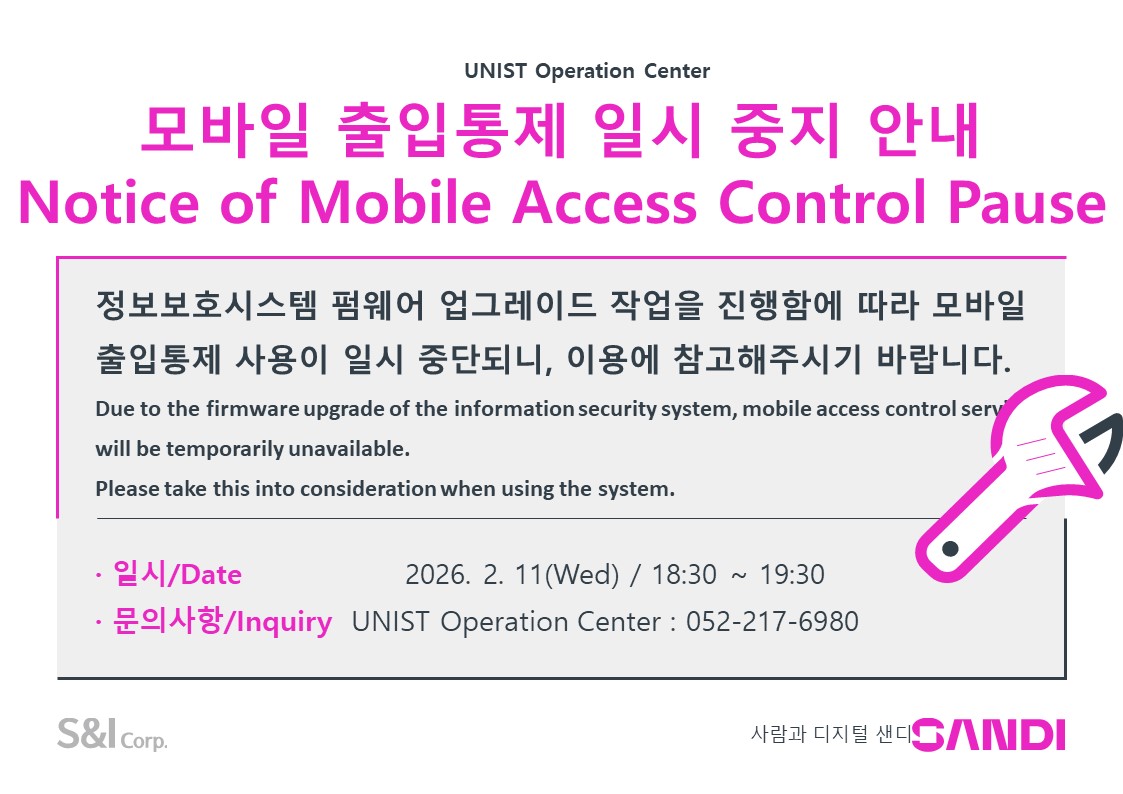 | 공지 | 모바일 출입통제 일시 중지 안내(Notice of Mobile Access C.. | 2026-02-11 | 217 |