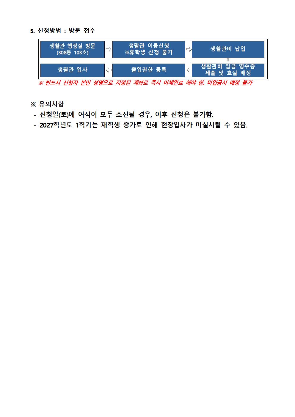 | 공지 | [No.2026-10] 2026년 1학기 생활관 신규입사자 안내(Notice .. | 2026-02-25 | 178 |