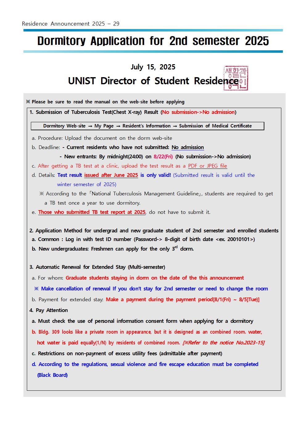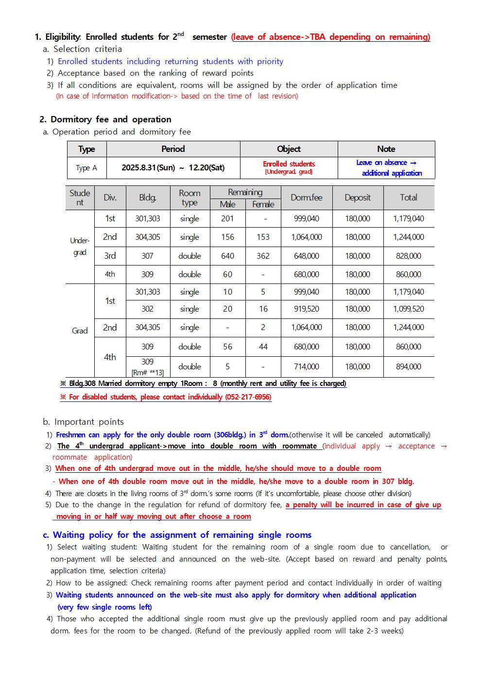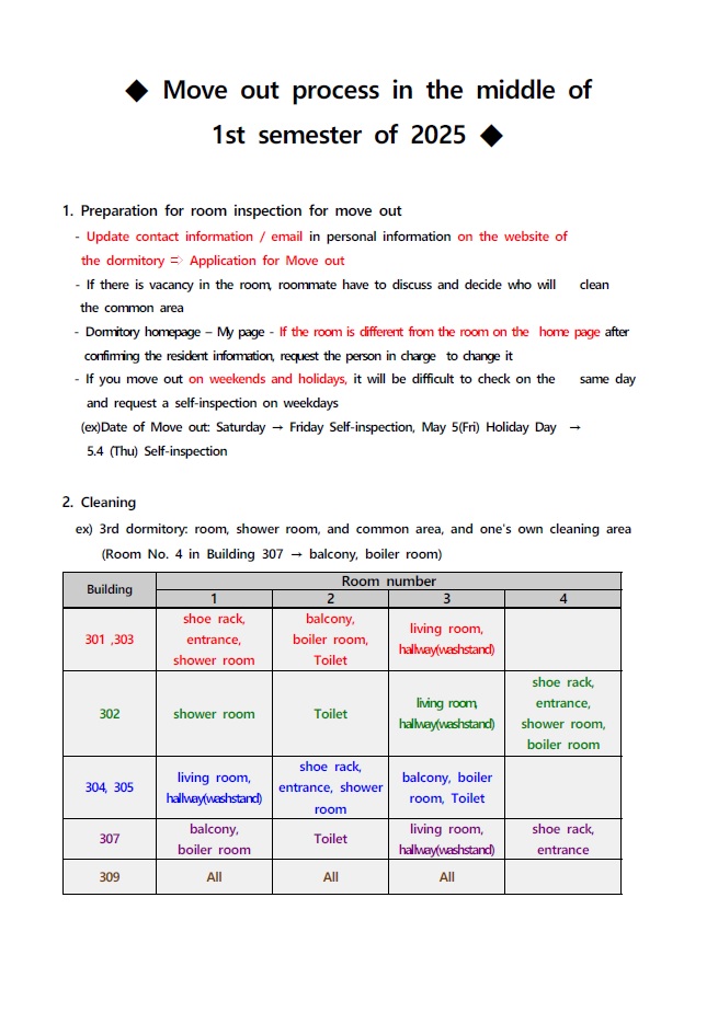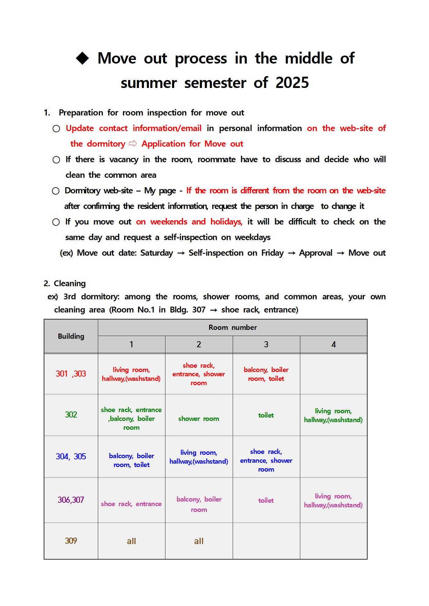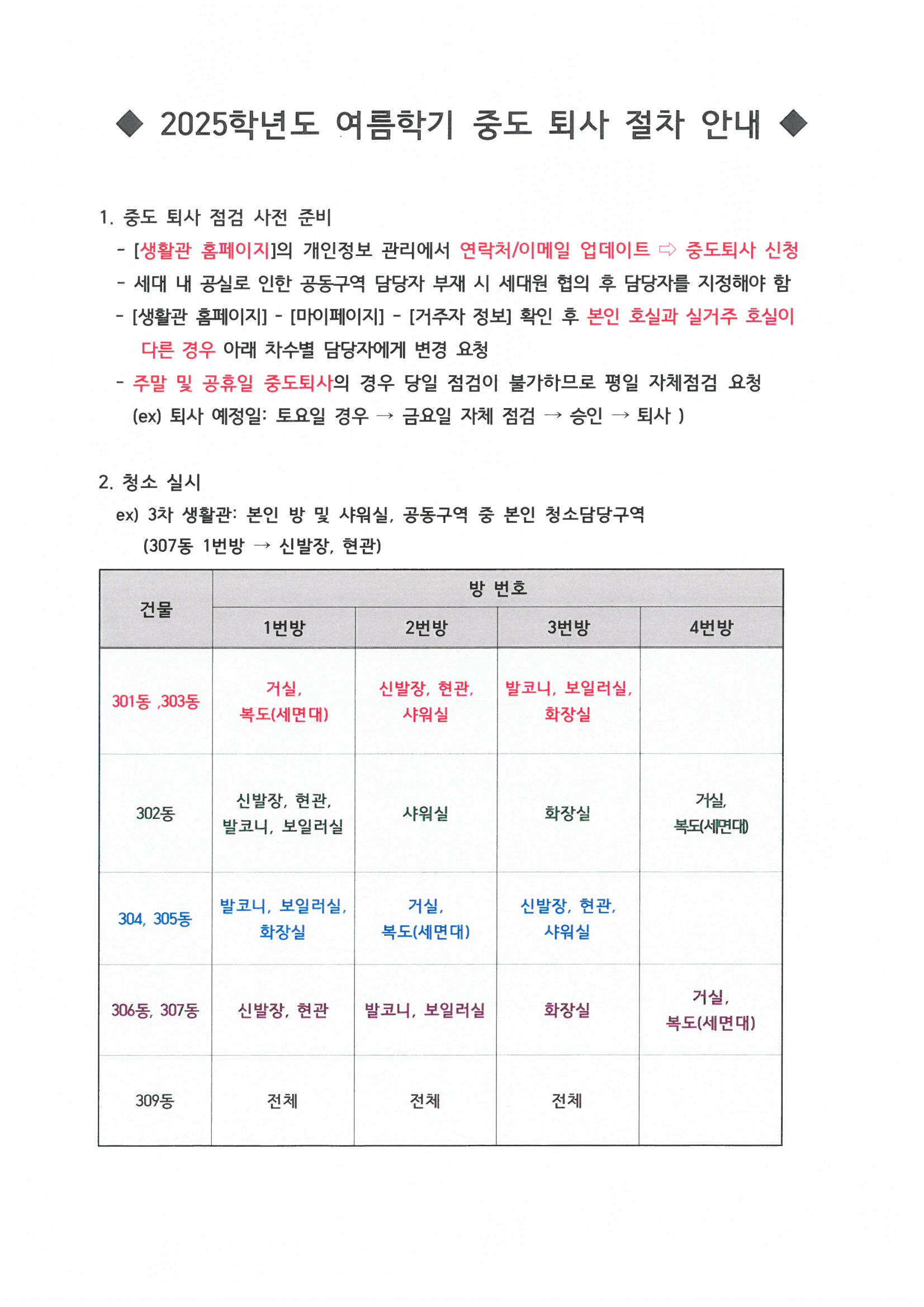 | 1026 | 2025학년도 1학기 중도 퇴사 절차 안내 (Move out process i.. | 2025-03-05 | 2303 |