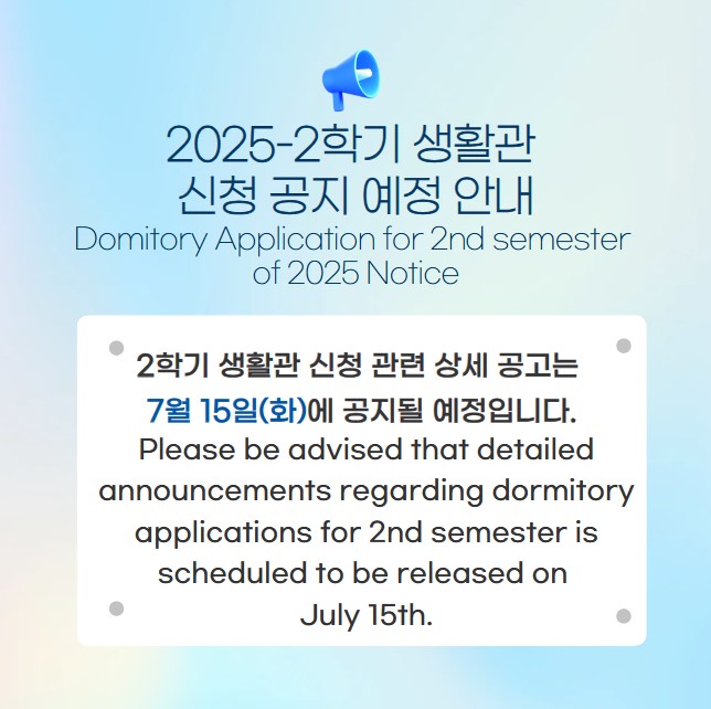 | 1033 | 2025-2학기 생활관 신청 공지 예정 안내 | 2025-07-07 | 1558 |