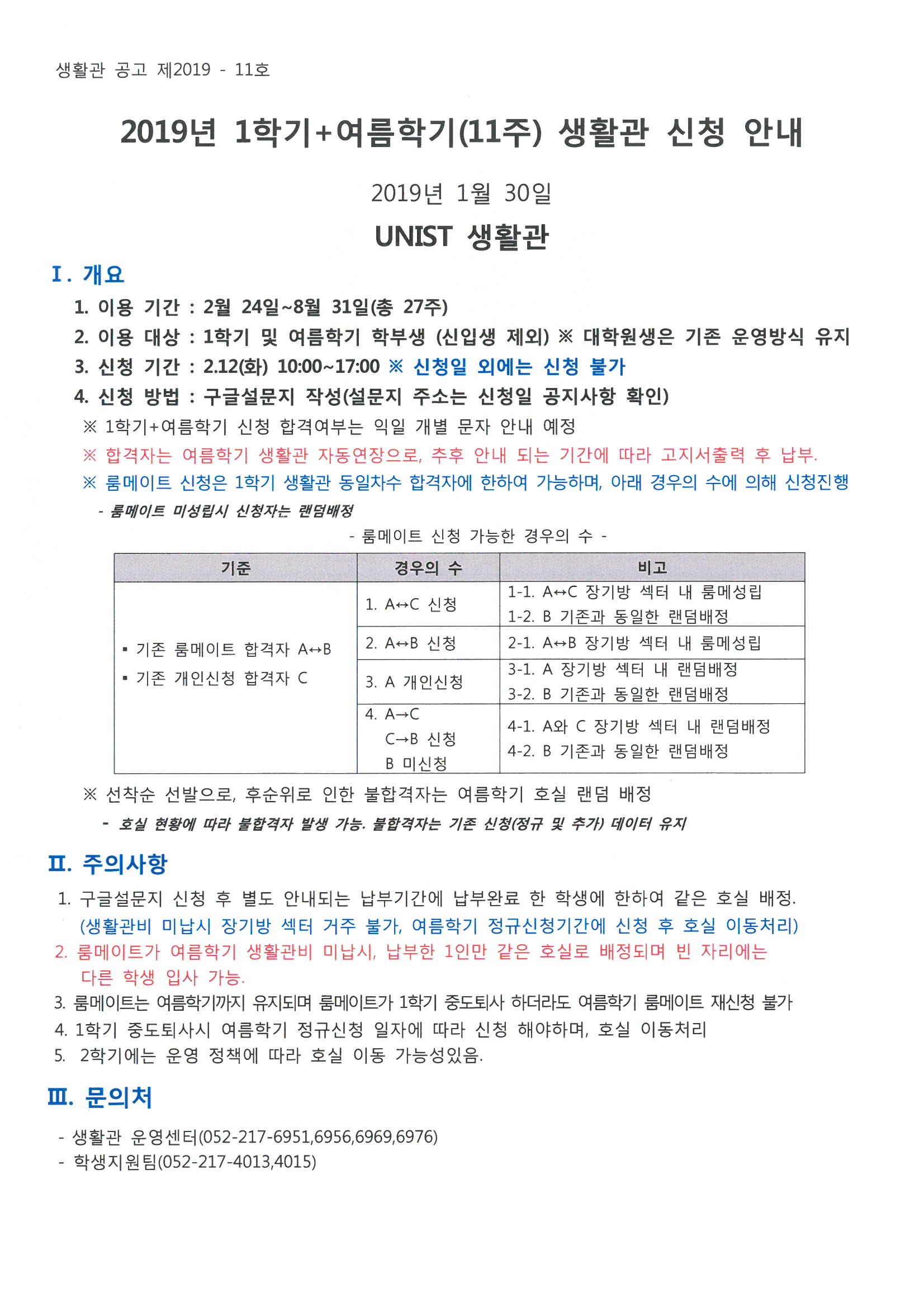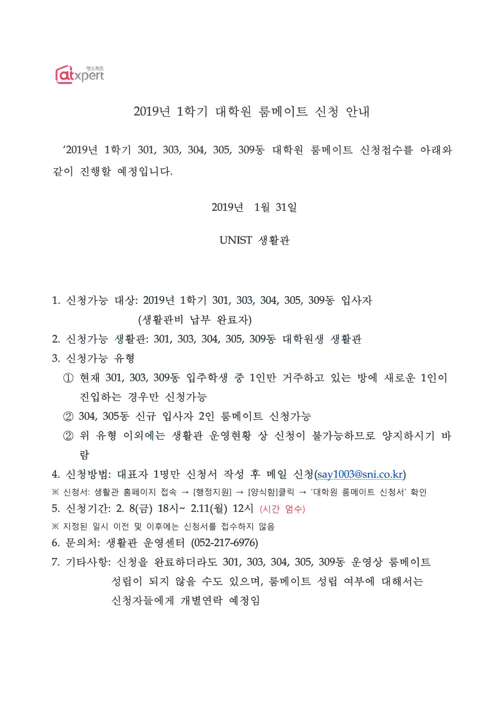 | 126 | 2019년 1학기 대학원 룸메이트 신청 안내(2019 1st semester.. | 2019-02-01 | 2119 |