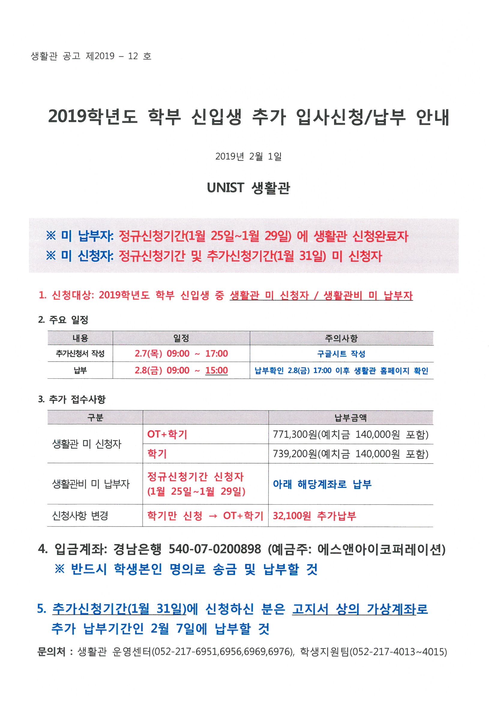| 128 | (No.2019-12) 2019학년도 학부 신입생 추가 입사신청/납부 .. | 2019-02-07 | 2100 |
