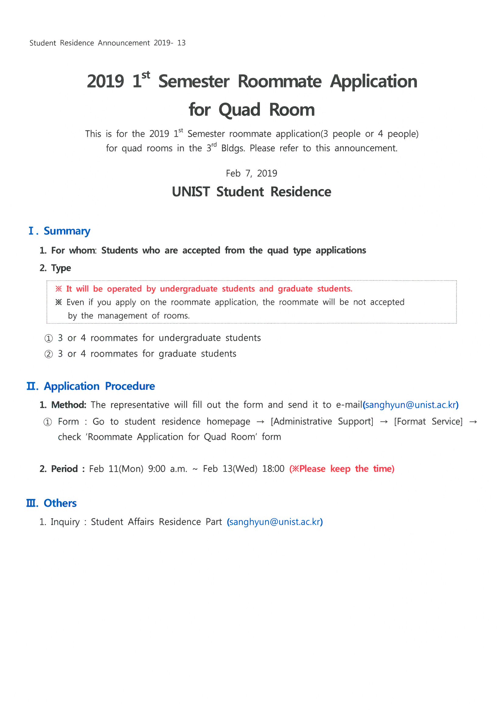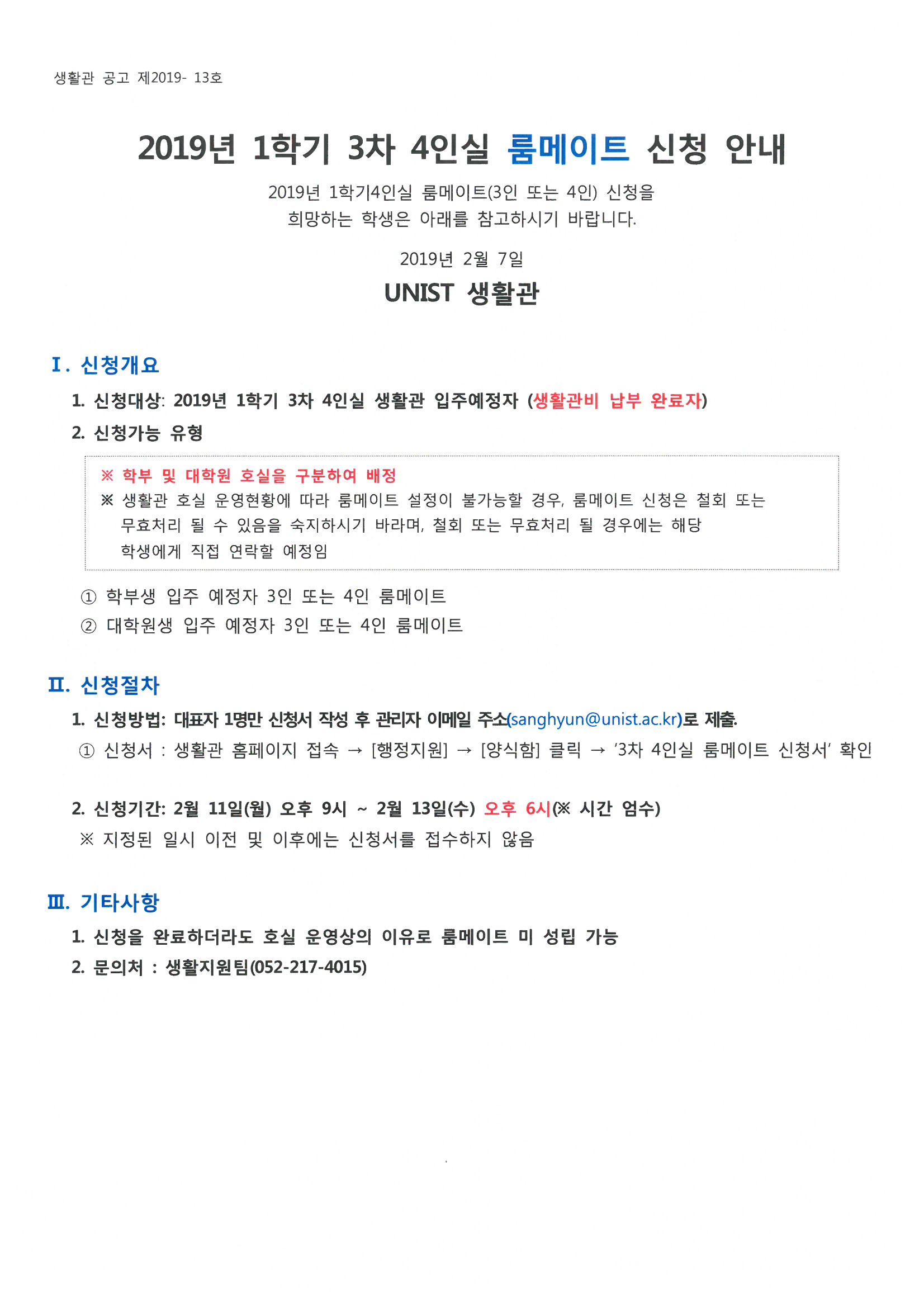 | 129 | (No.2019-13) 2019년 1학기 3차 4인실 룸메이트 신청 안내(2.. | 2019-02-08 | 1776 |
