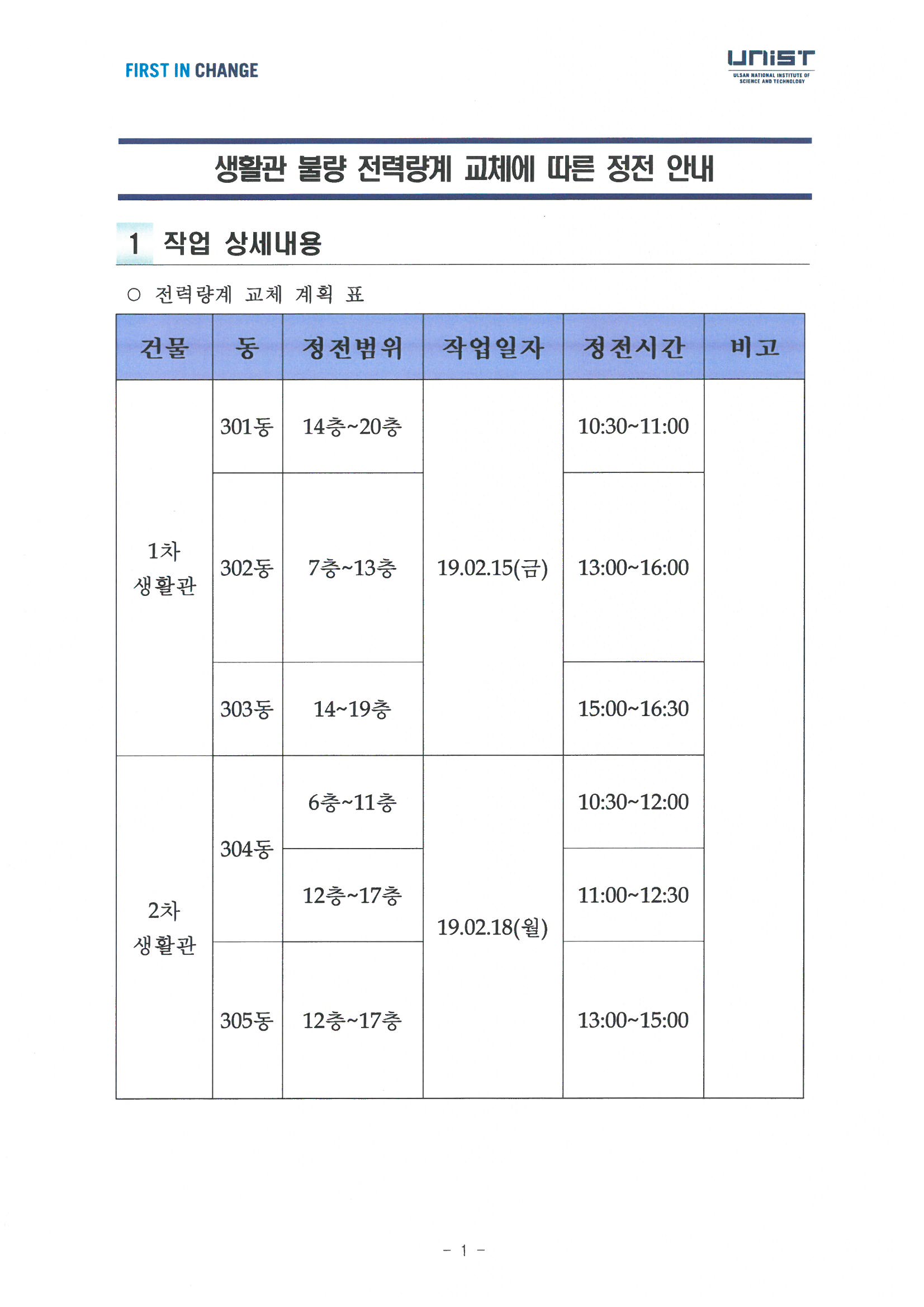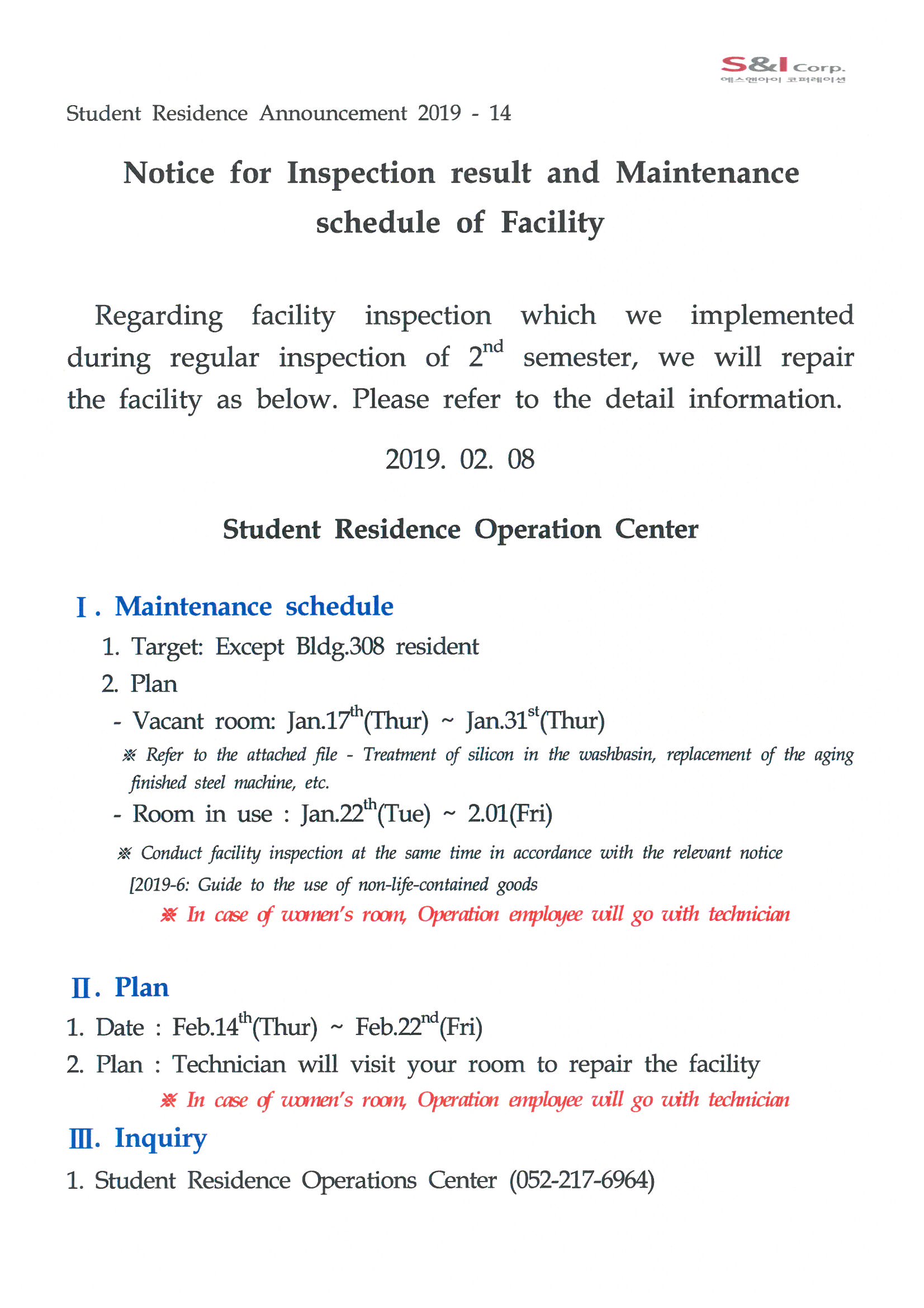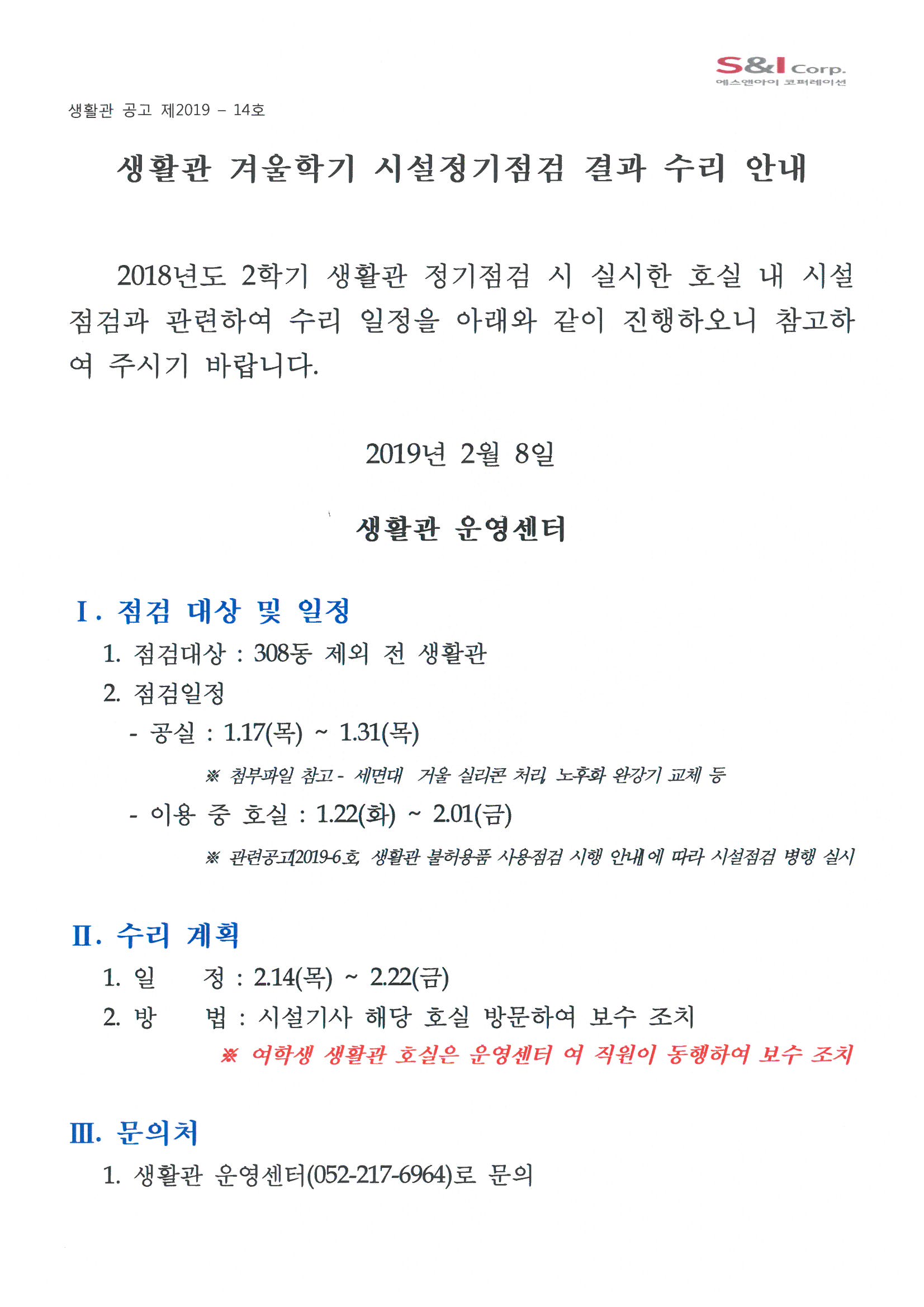 | 131 | (No.2019-14) 생활관 겨울학기 시설정기점검 결과 수리 안내.. | 2019-02-11 | 1417 |