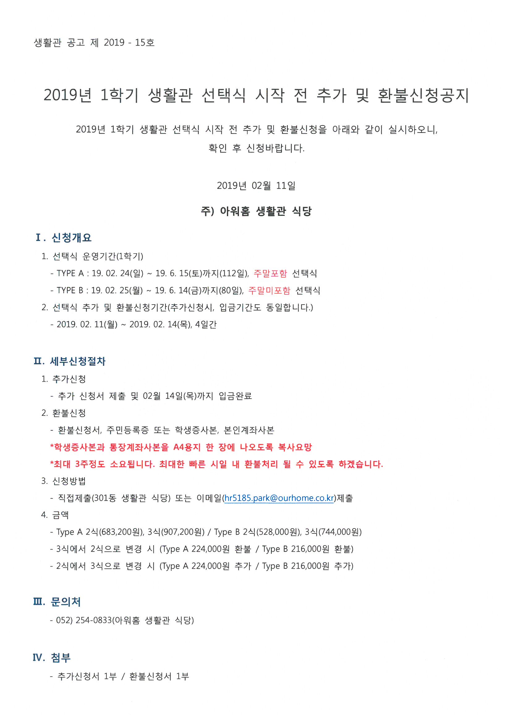 | 132 | (No.2019-15)2019년 1학기 생활관 선택식 시작 전 추가 및 .. | 2019-02-11 | 2632 |