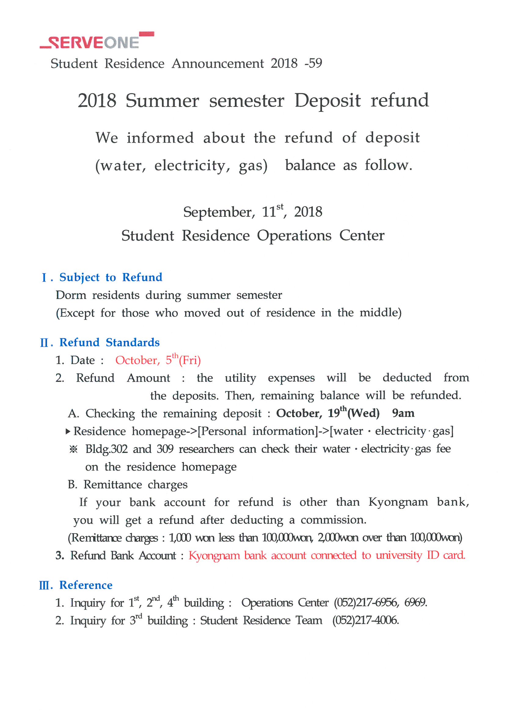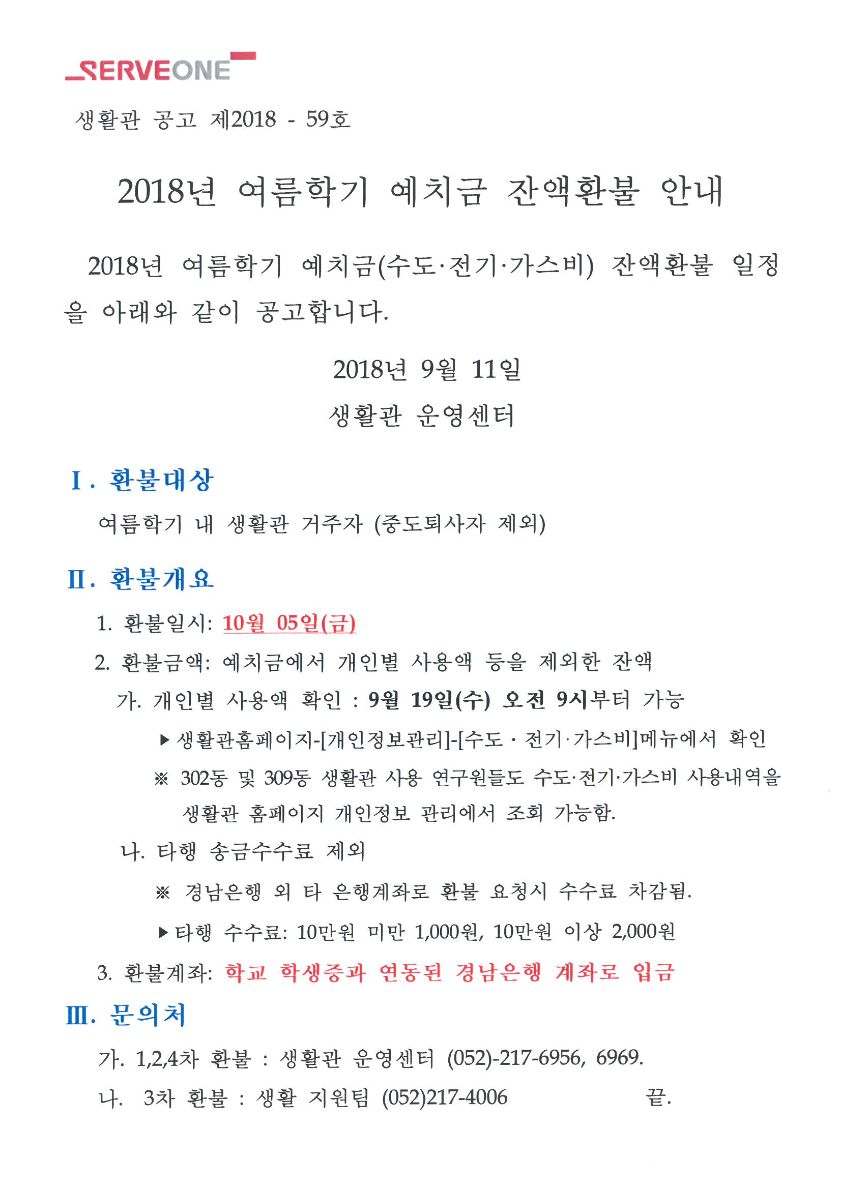 | 77 | (No.2018-59) 2018년 여름학기 예치금 잔액환불 안내(2018 S.. | 2018-09-12 | 2239 |
