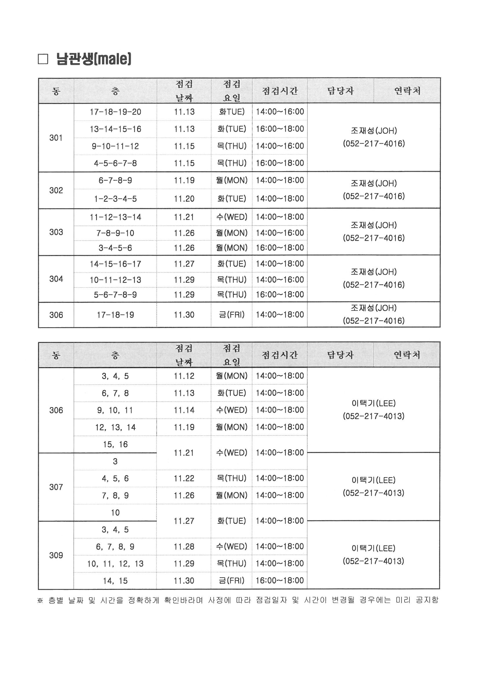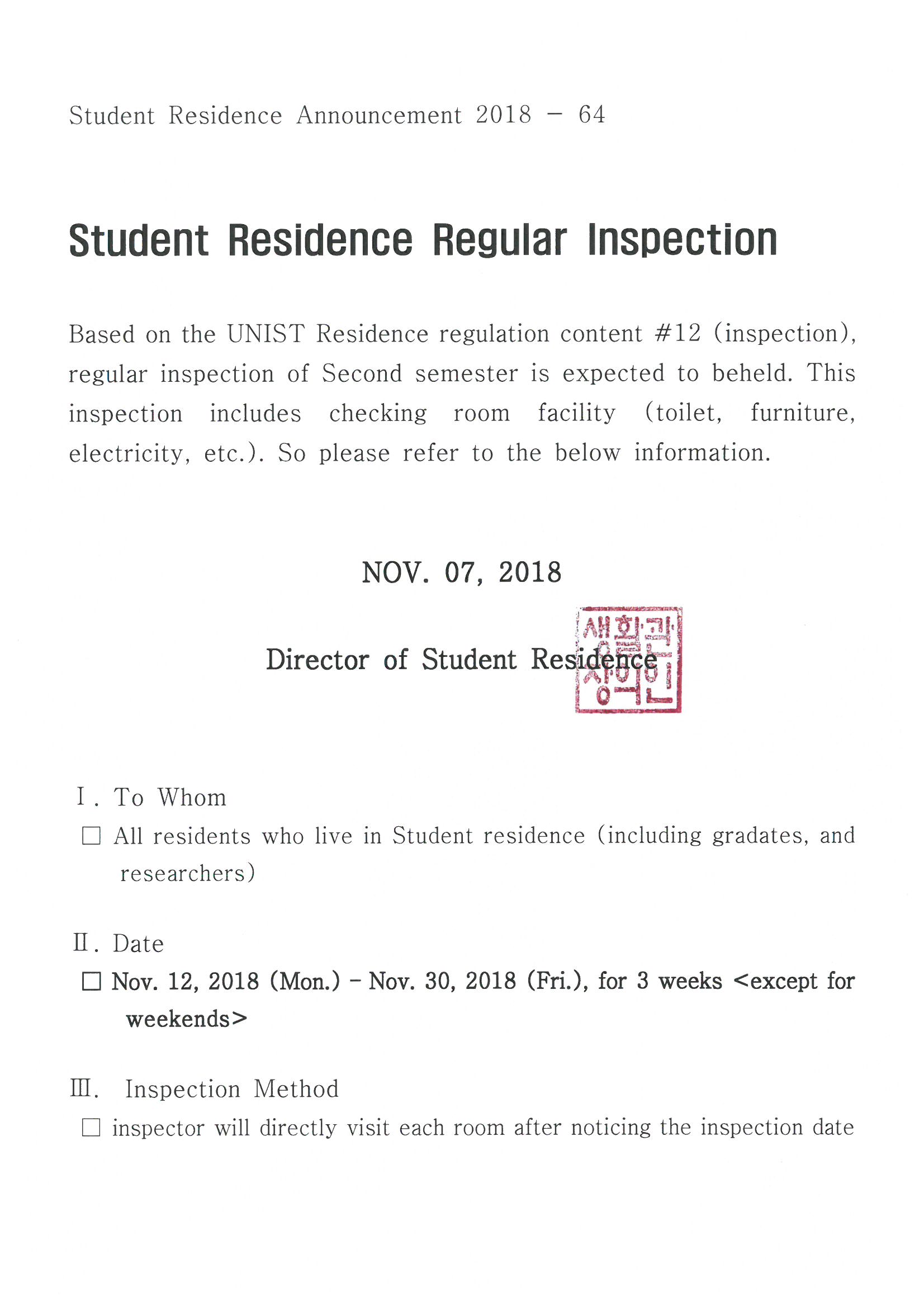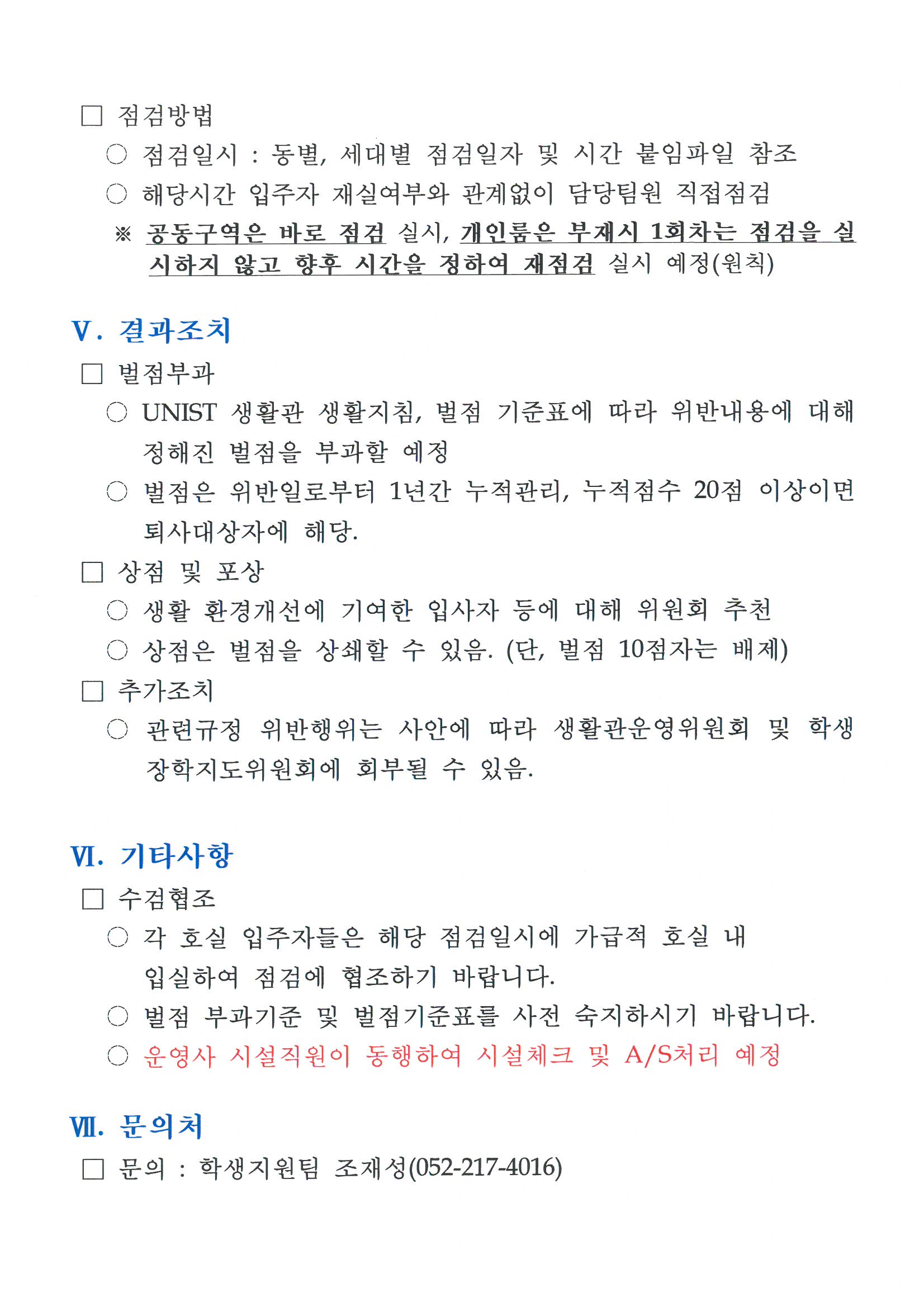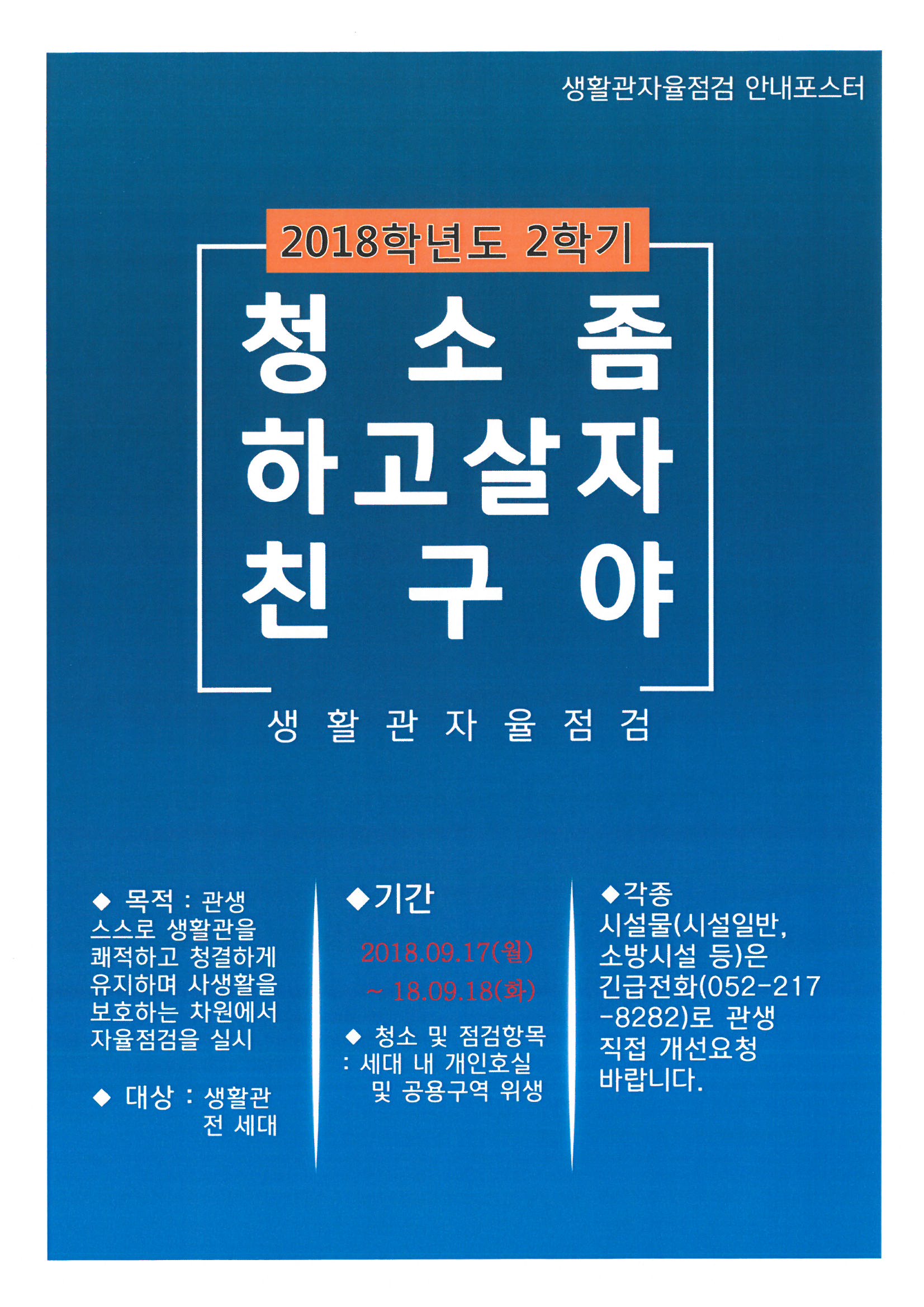 | 85 | (No.2018-64) 생활관 정기점검 및 시설점검 실시(Student Re.. | 2018-11-08 | 2720 |