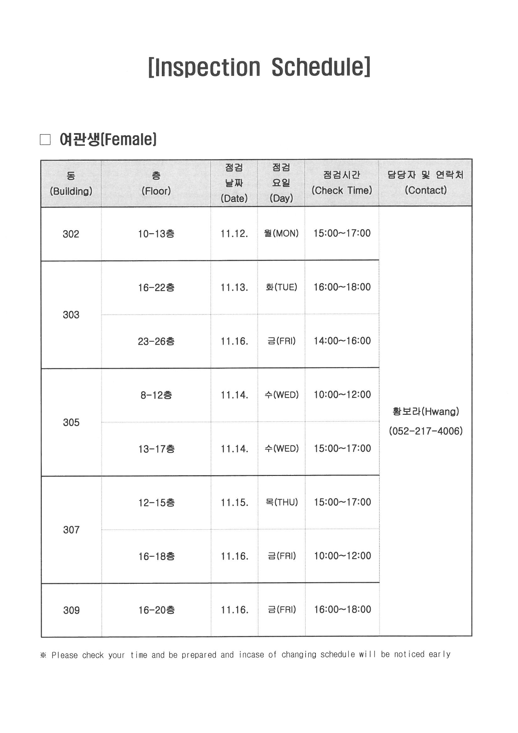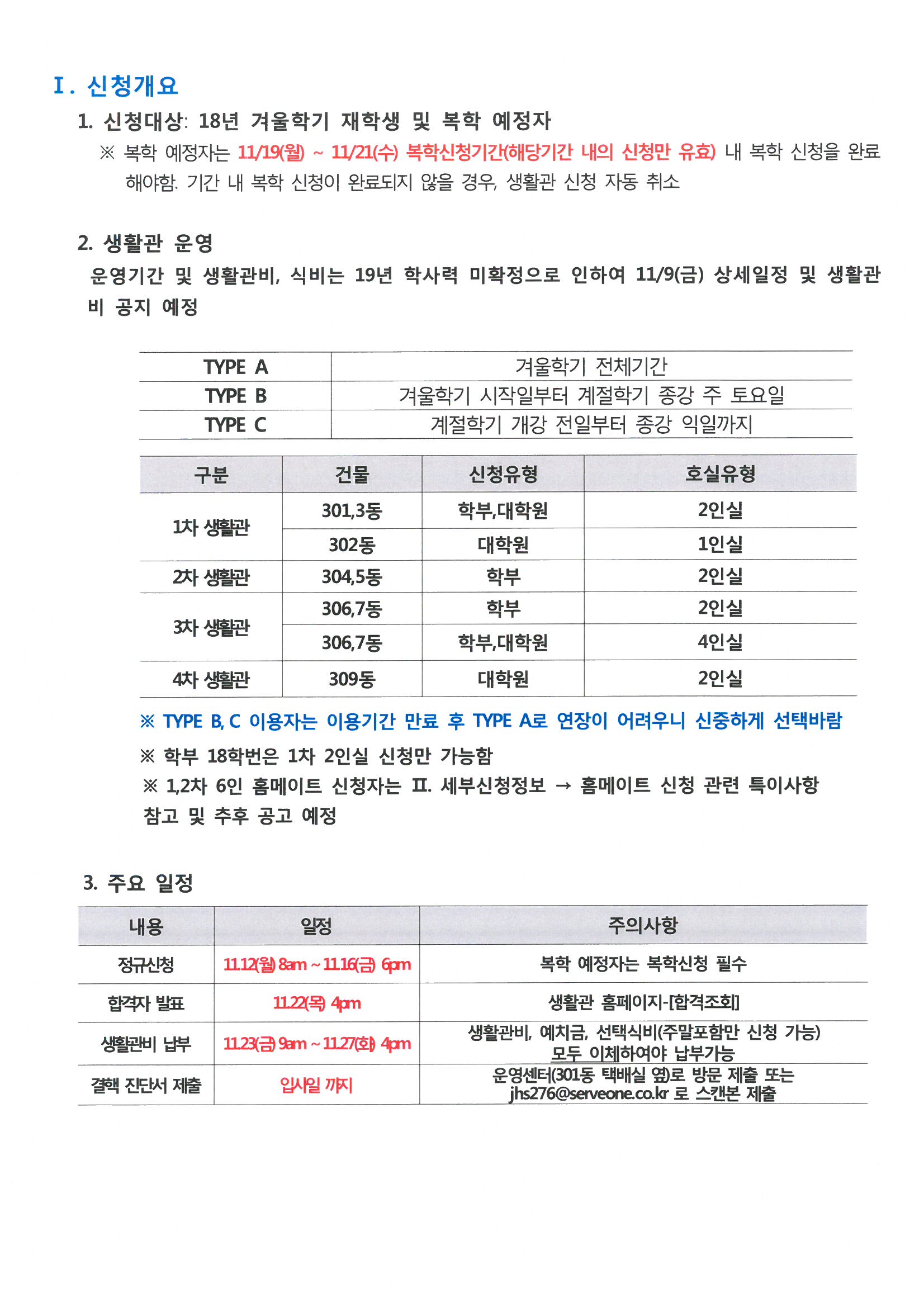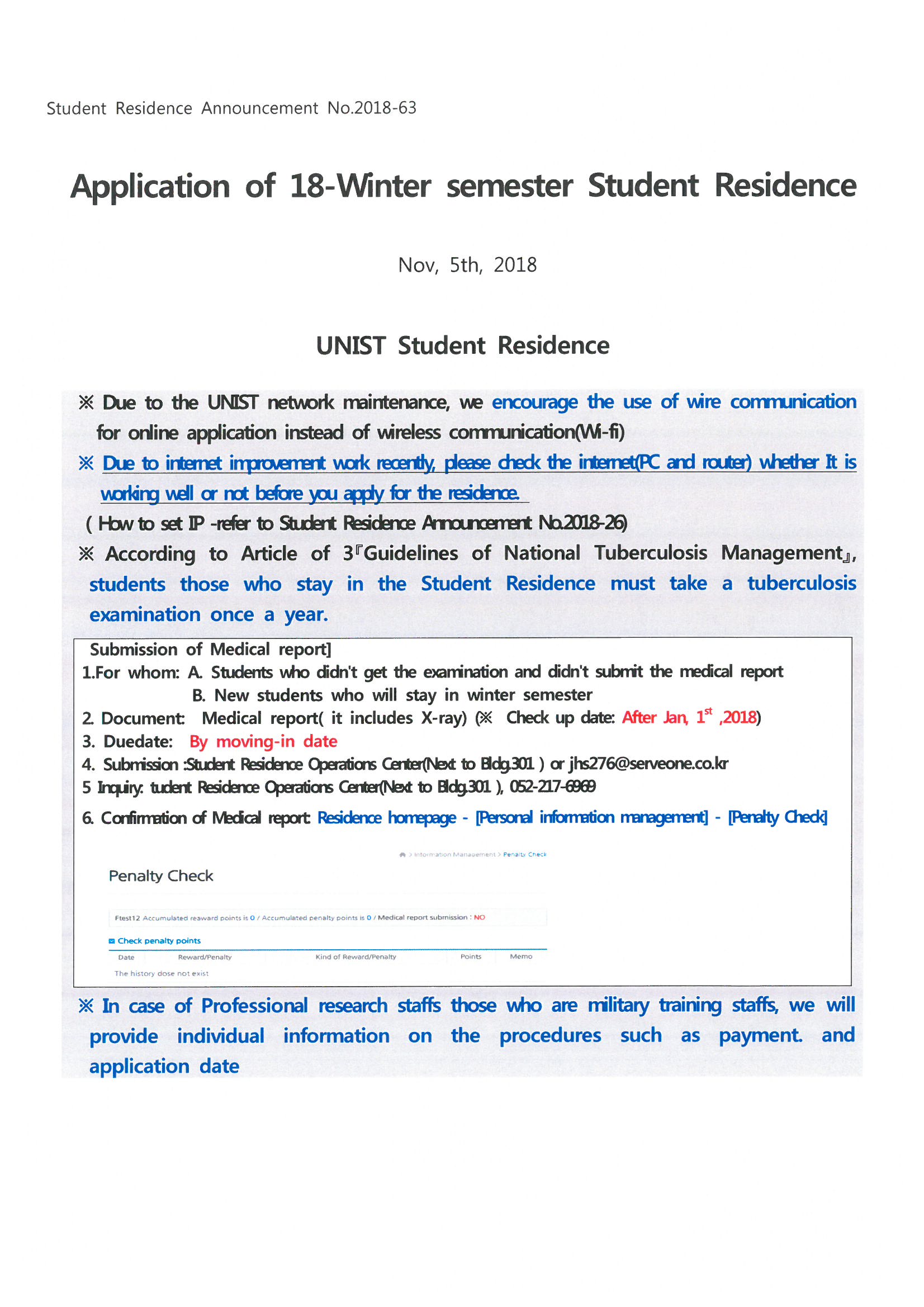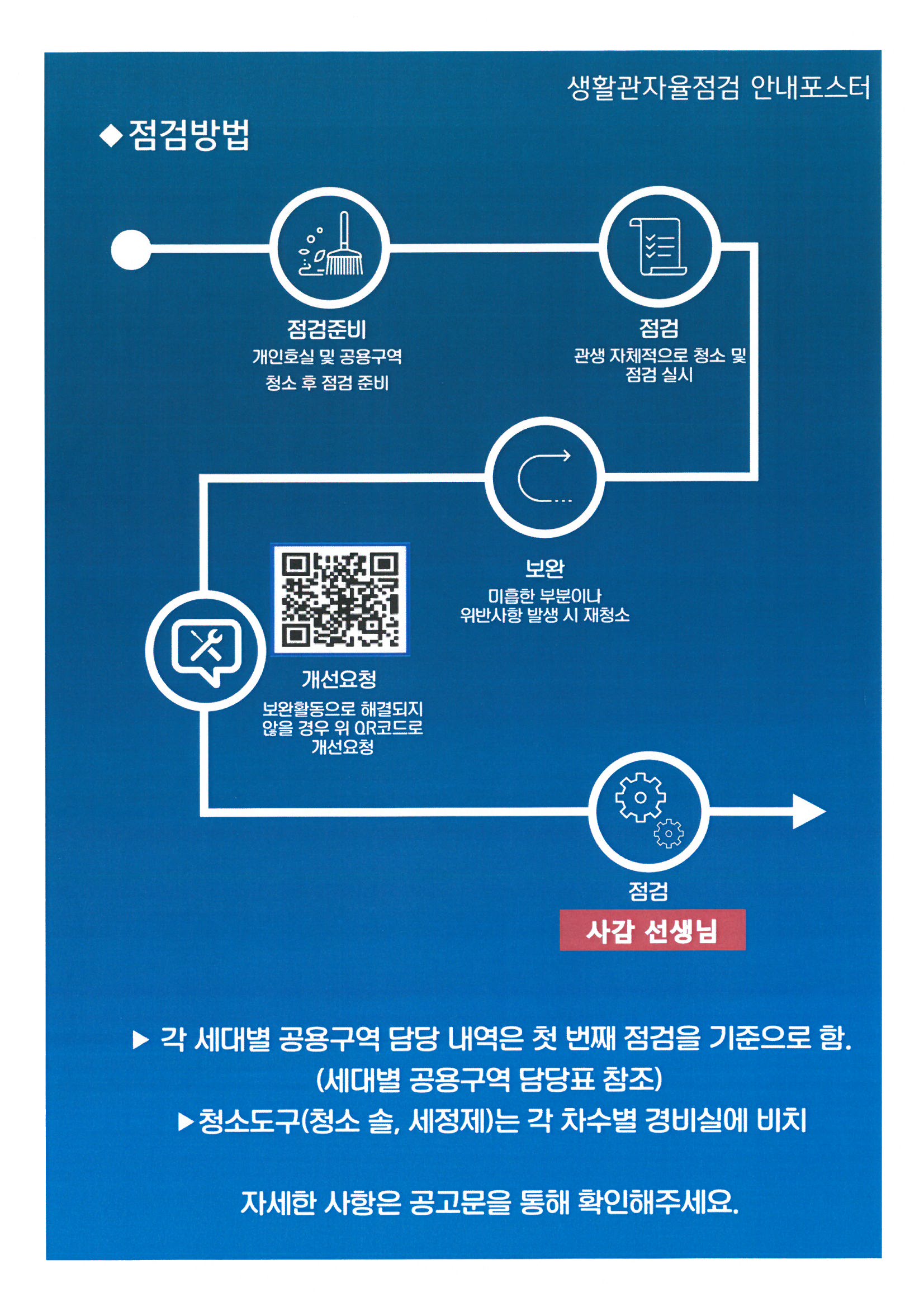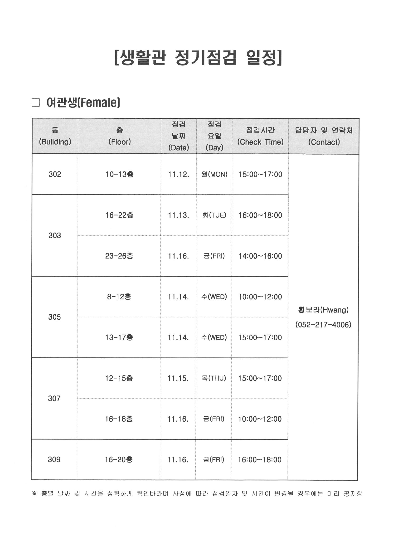 | 85 | (No.2018-64) 생활관 정기점검 및 시설점검 실시(Student Re.. | 2018-11-08 | 2720 |