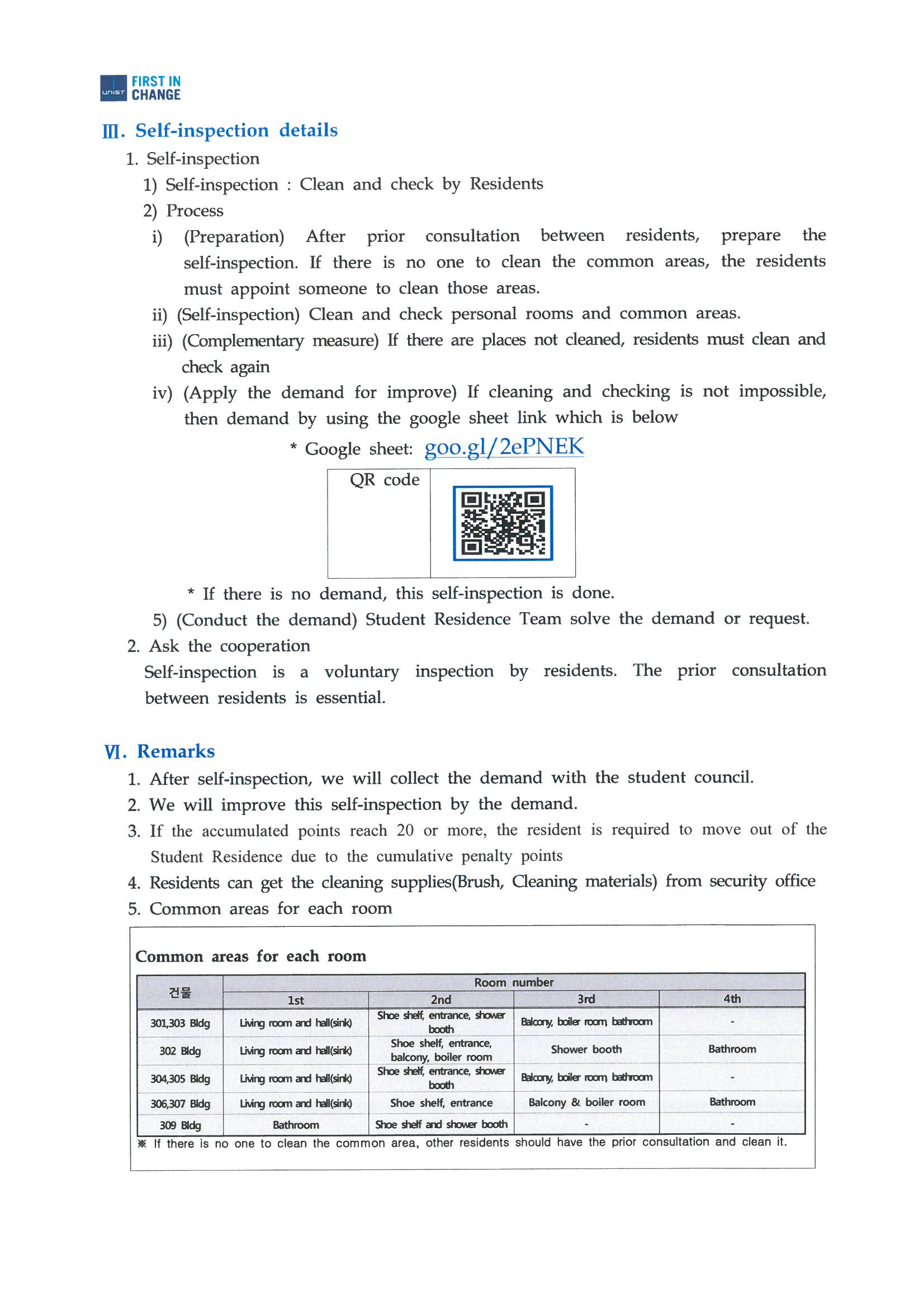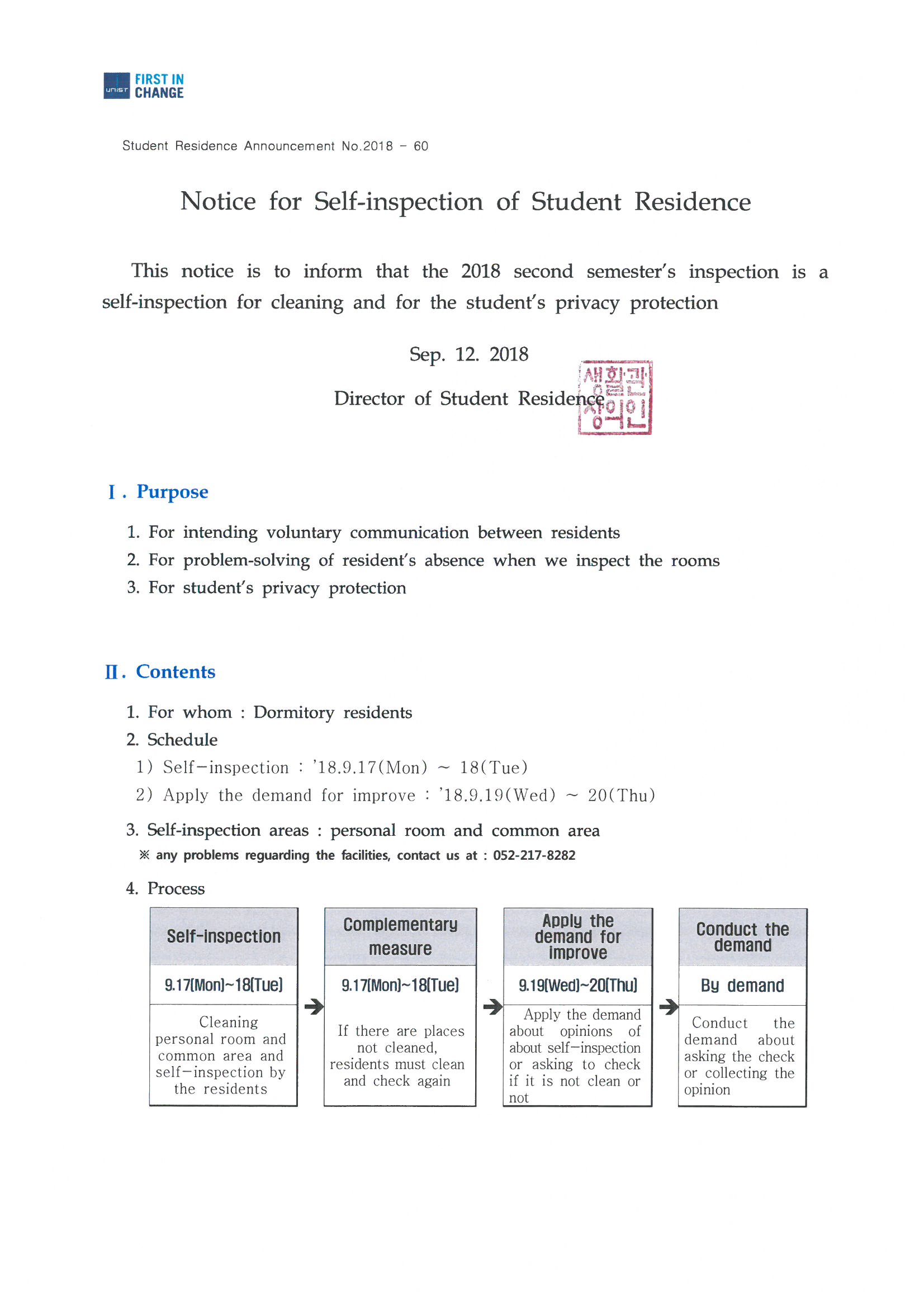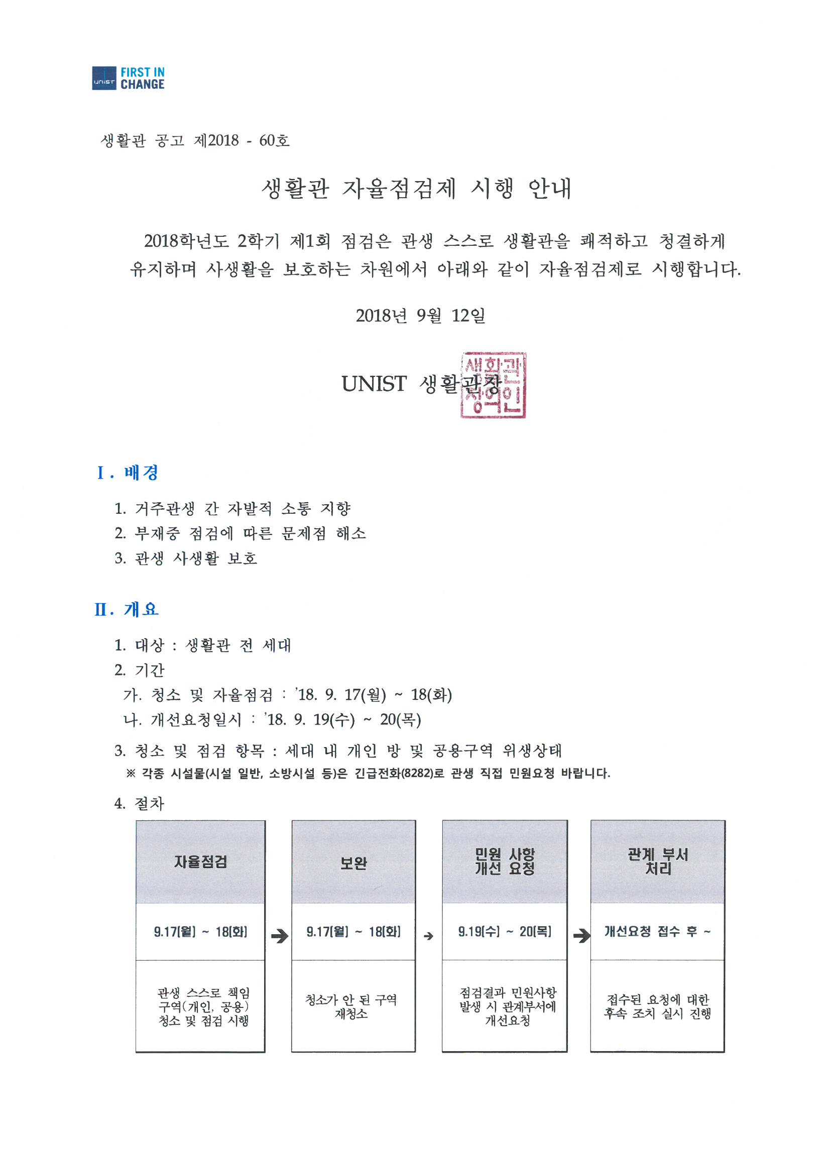 | 78 | (No.2018-60) 생활관 자율점검제 시행 안내(Notice for Self.. | 2018-09-13 | 1607 |