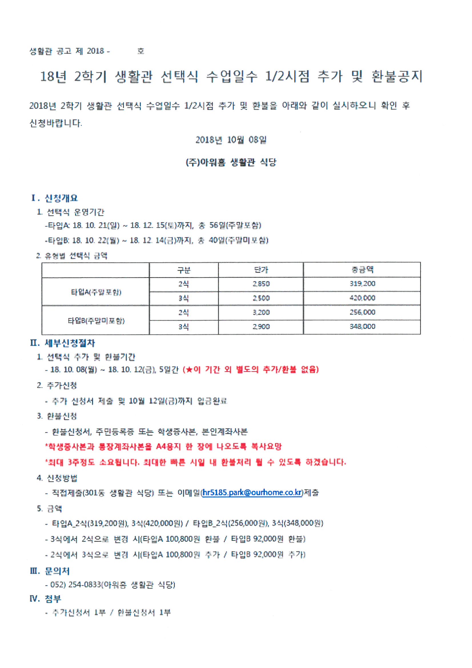 | 81 | (No.2018-62) 18년 2학기 생활관 선택식 수업일수 1/2시점 .. | 2018-10-08 | 1898 |