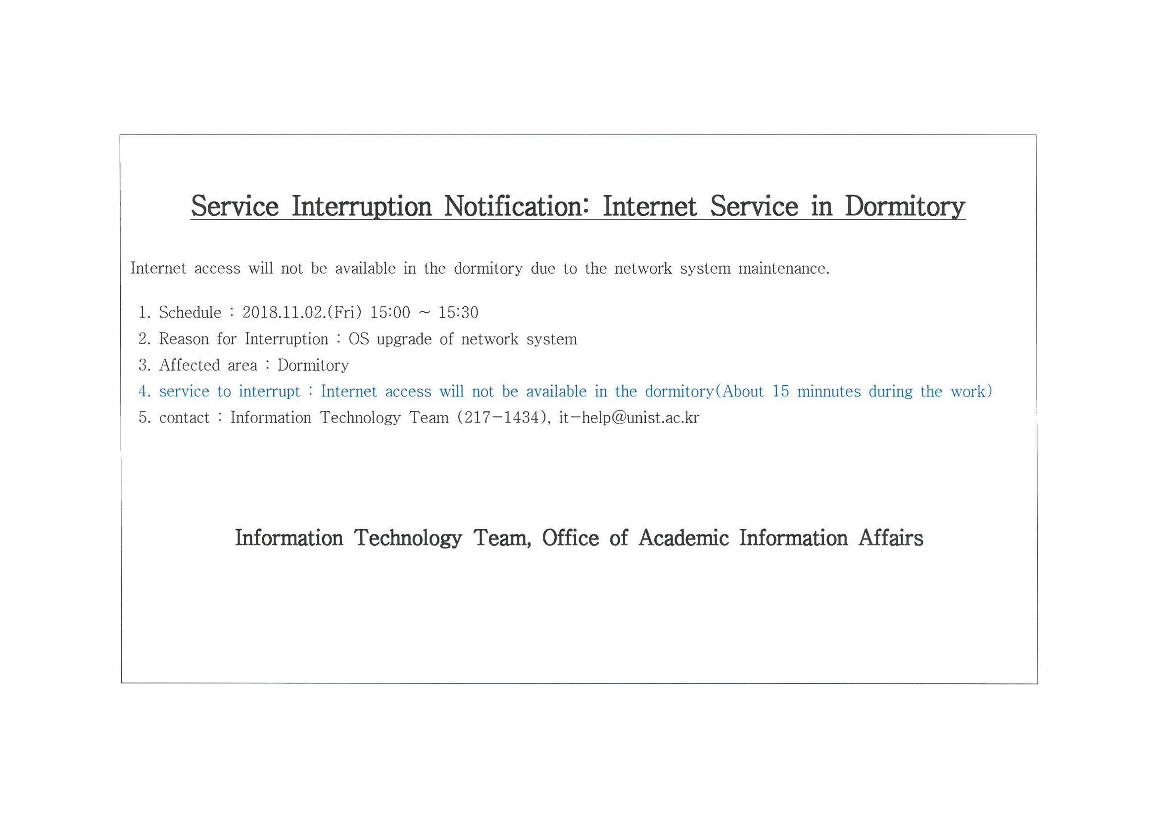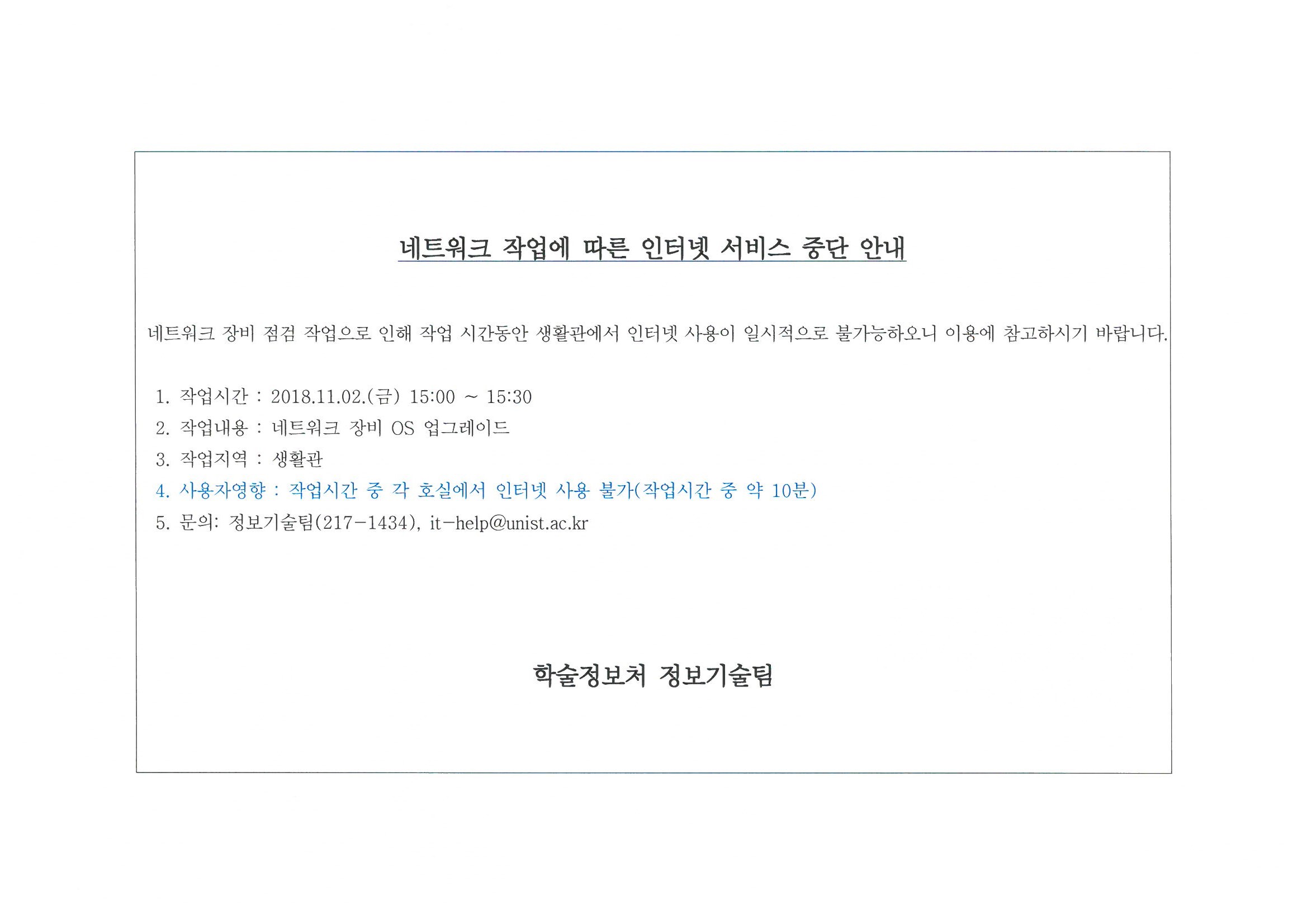 | 82 | 네트워크 작업에 따른 인터넷 서비스 중단 안내(Service Int.. | 2018-10-30 | 1559 |