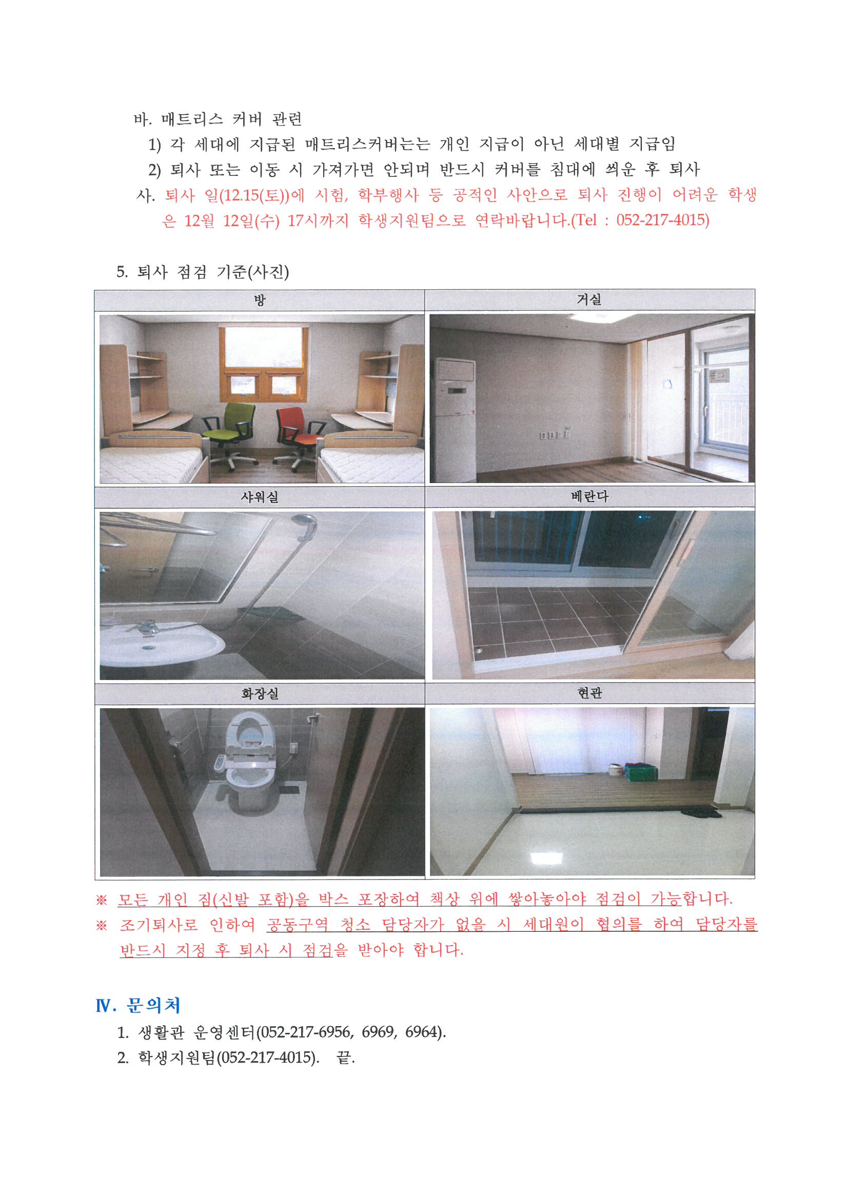 | 100 | (no.2018-74) 18년 2학기 생활관 정규퇴사 및 겨울학기 사용.. | 2018-12-08 | 3873 |