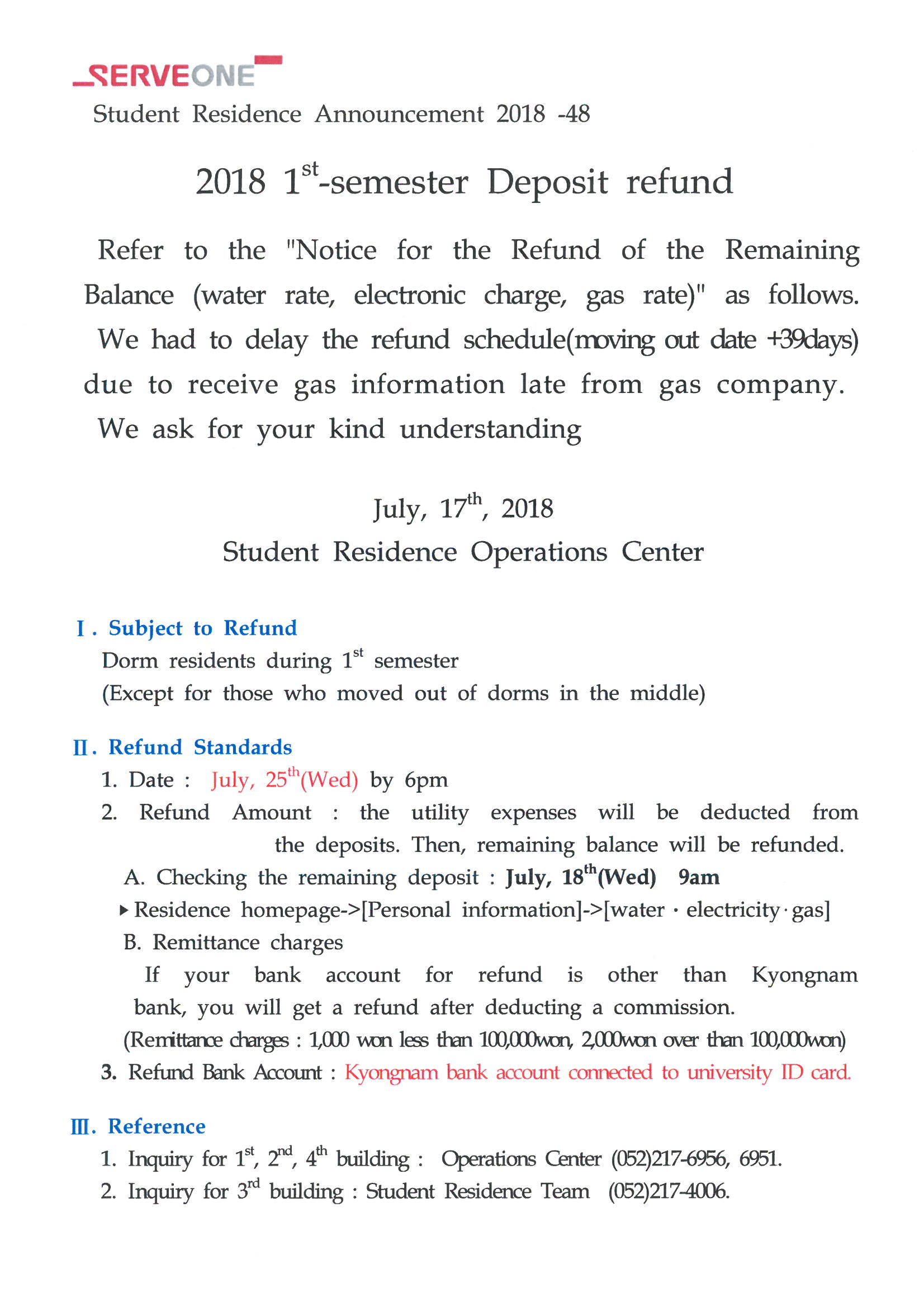 | 58 | (No.2018-48) 18년 1학기 예치금 잔액환불 안내(2018 1st-se.. | 2018-07-17 | 3011 |