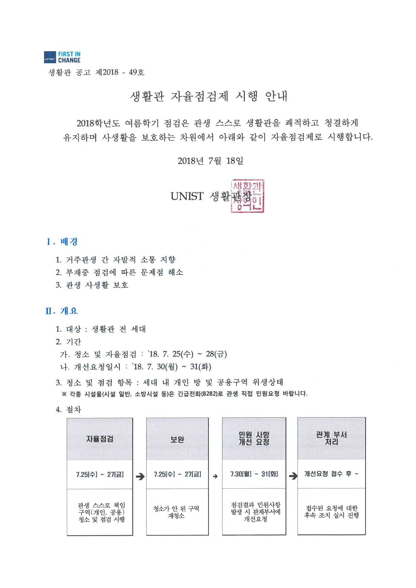 | 59 | (No.2018-49) 생활관 자율점검제 시행 안내(Notice of Self-.. | 2018-07-19 | 1399 |