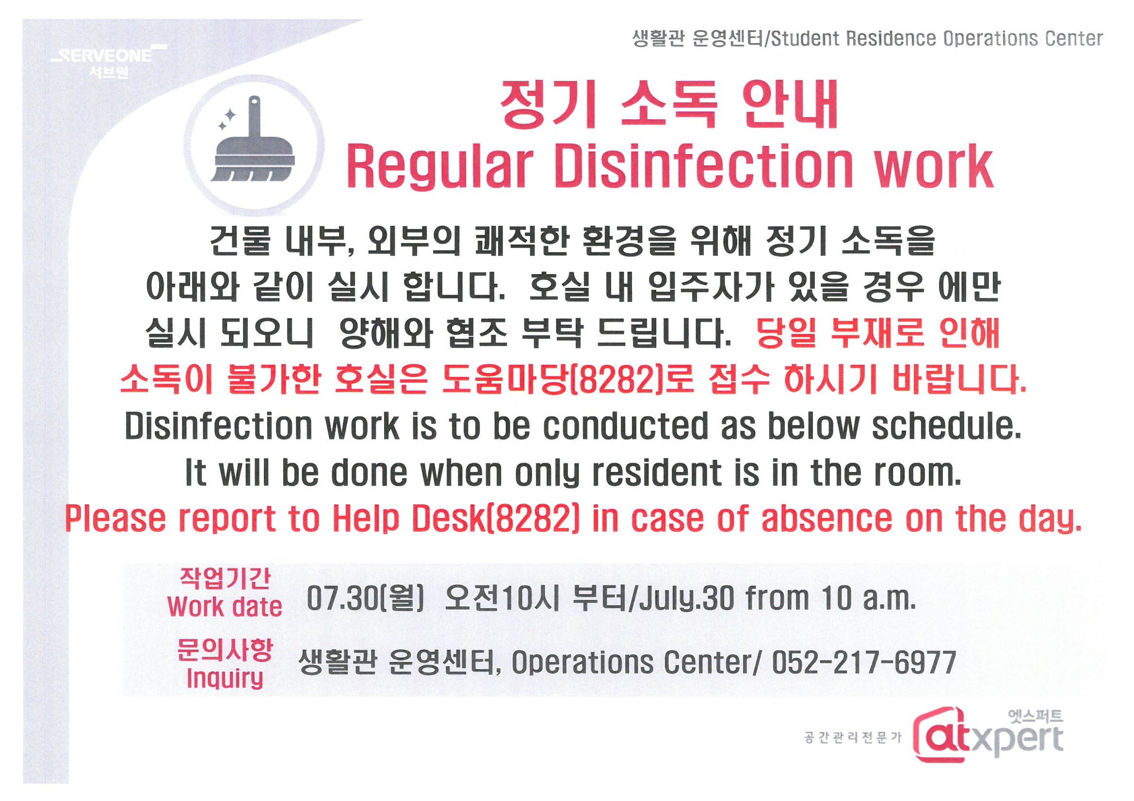 | 62 | 정기 소독 안내(Regular Disinfection work) | 2018-07-27 | 1391 |