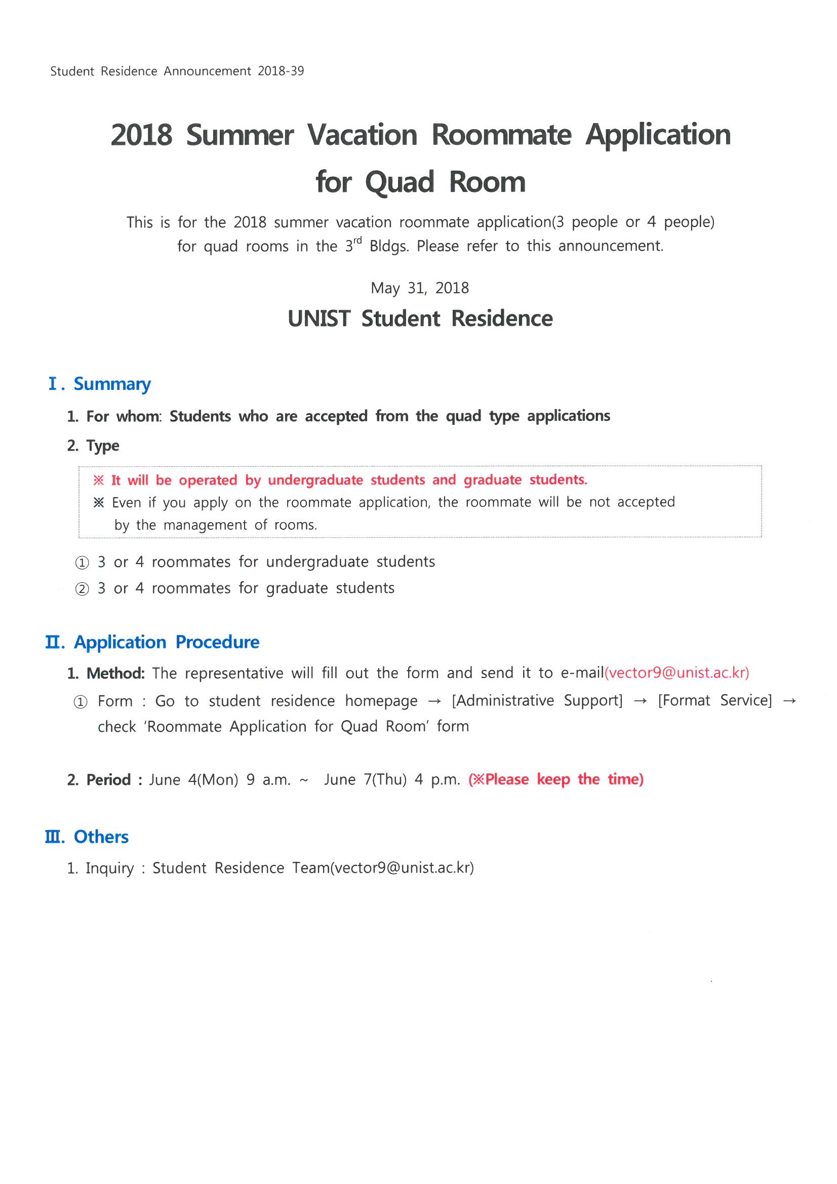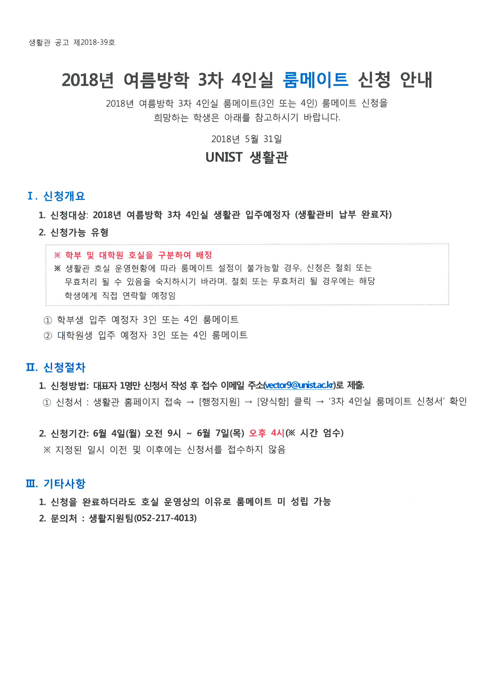 | 46 | (No.2018-39) 2018년 여름방학 3차 4인실 룸메이트 신청안내.. | 2018-06-01 | 1666 |
