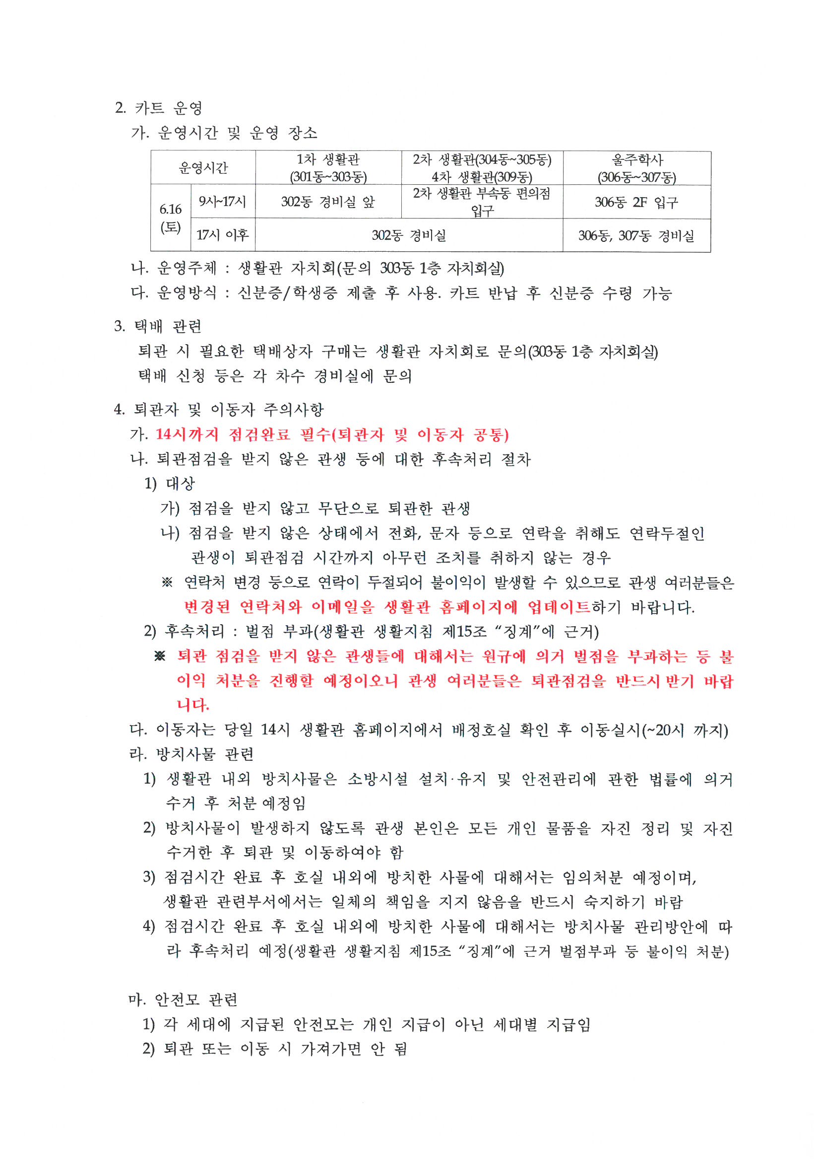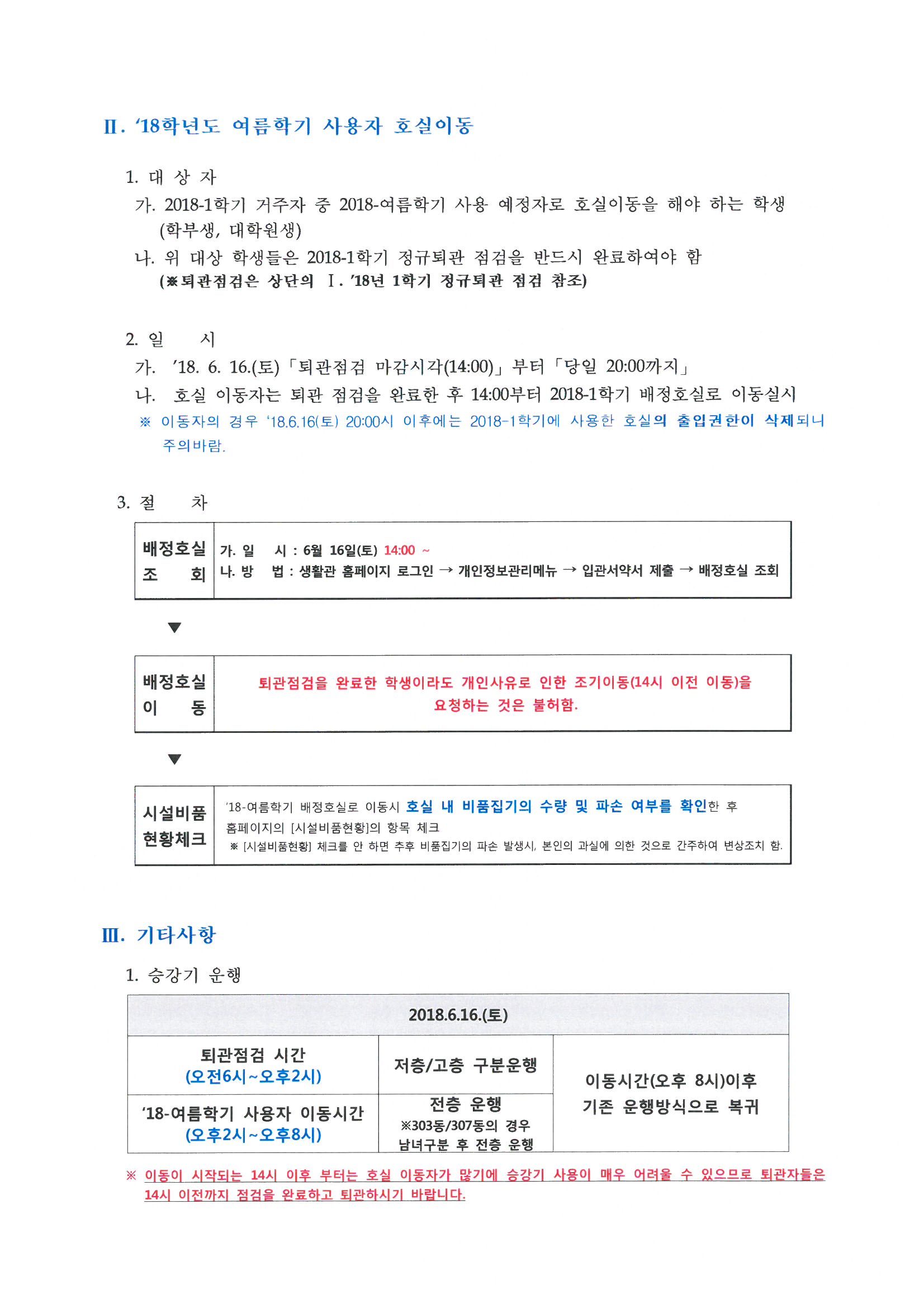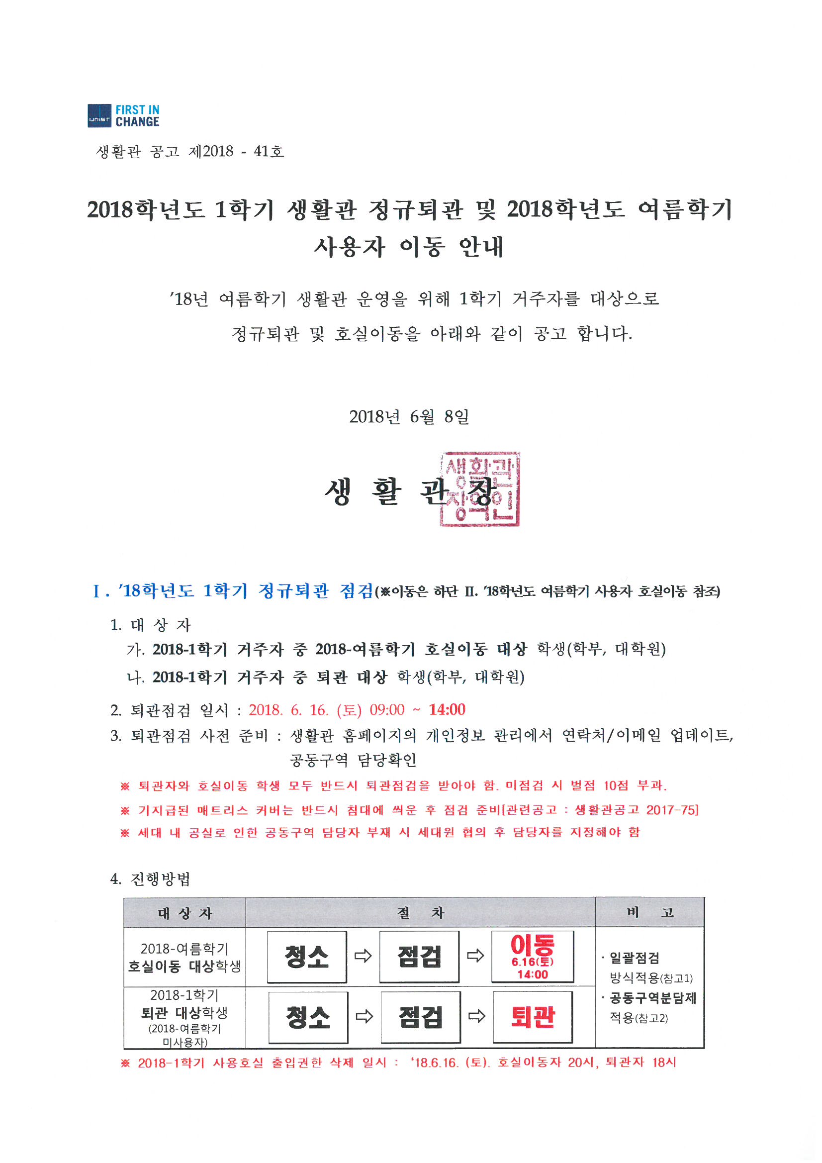 | 48 | (no.2018-41) 18년도1학기 생활관 정규퇴관 및 여름학기 사.. | 2018-06-08 | 3101 |
