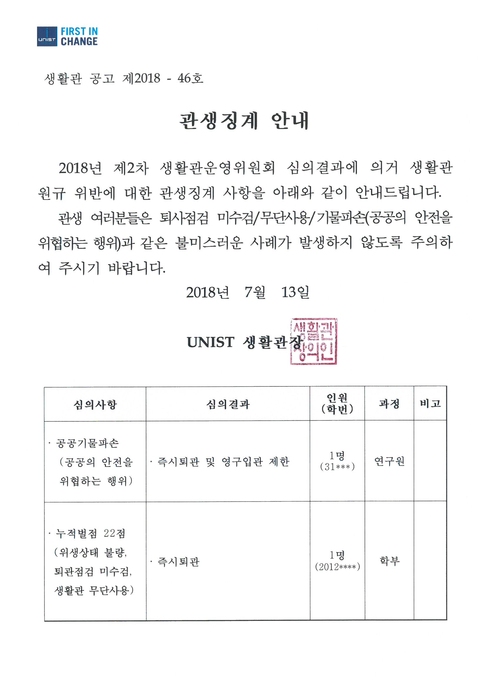 | 55 | (No.2018-46) 관생 징계 안내(Notice of Resident Disciplin.. | 2018-07-13 | 1925 |