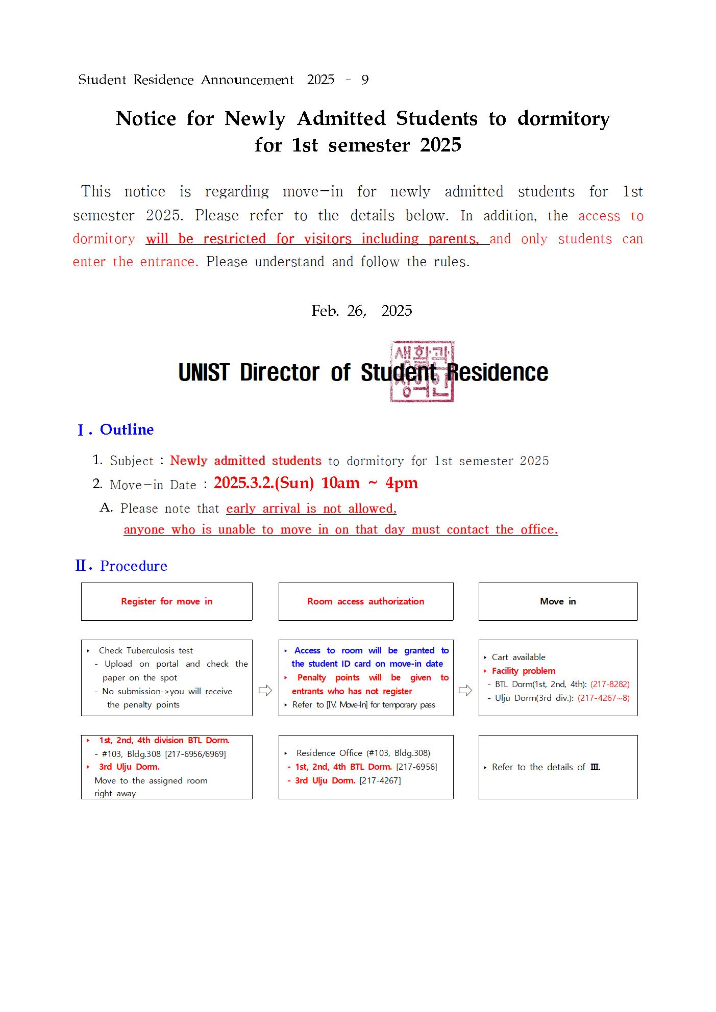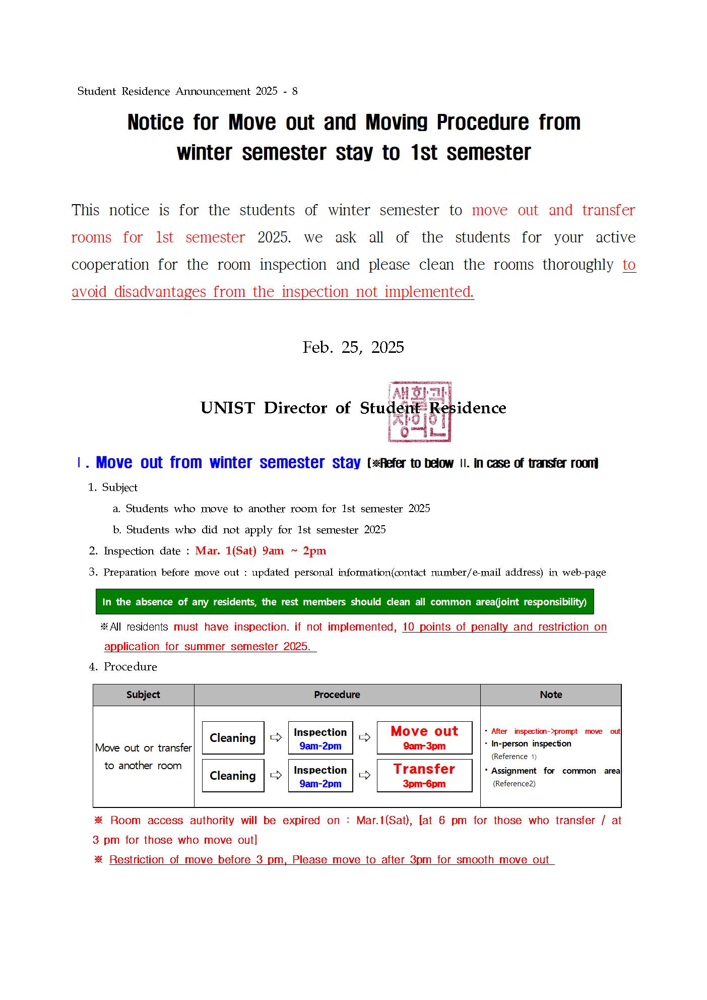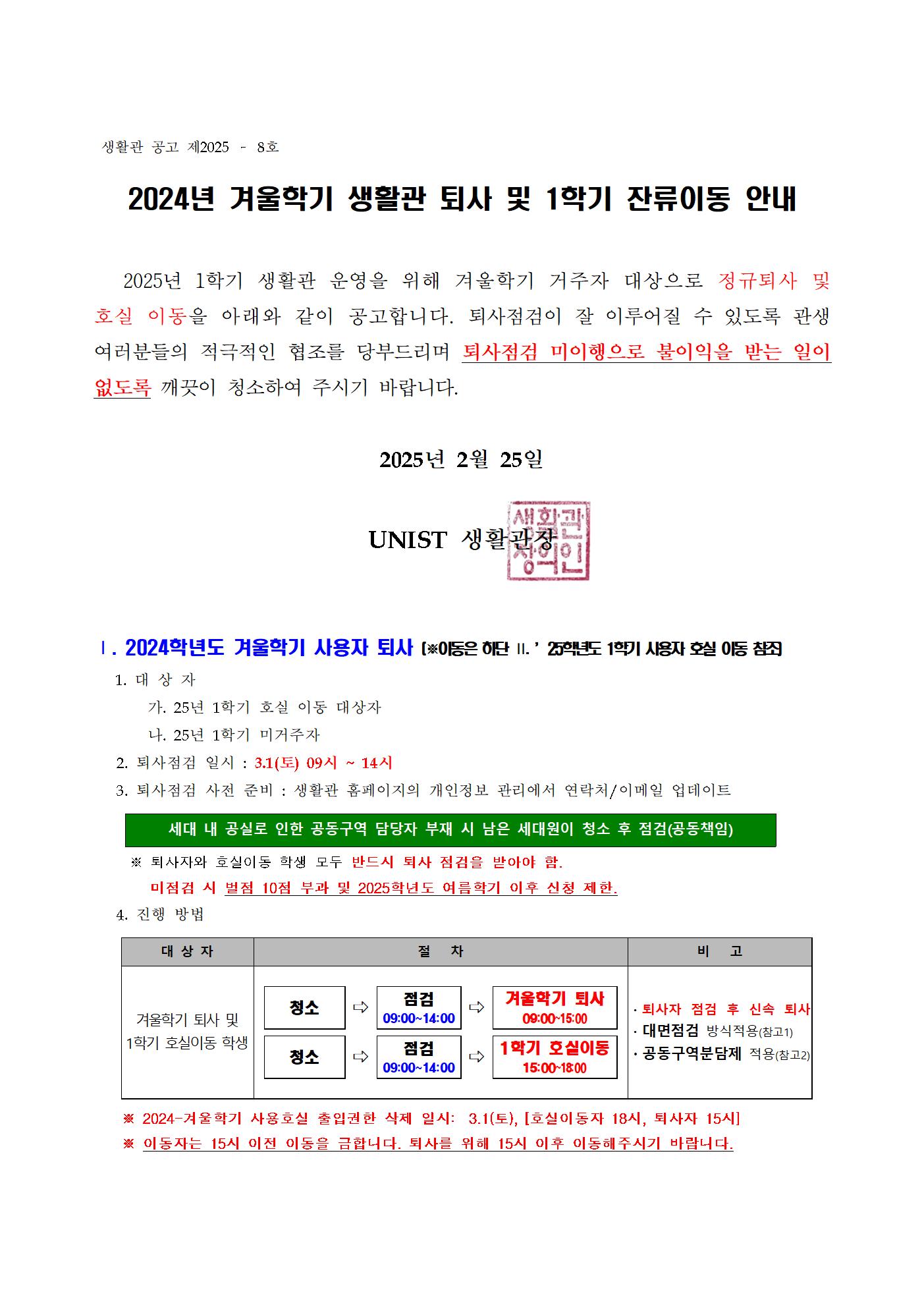 | 999 | [No.2025-09] 2025년 1학기 생활관 신규입사자 안내 (Notice.. | 2025-02-26 | 2506 |