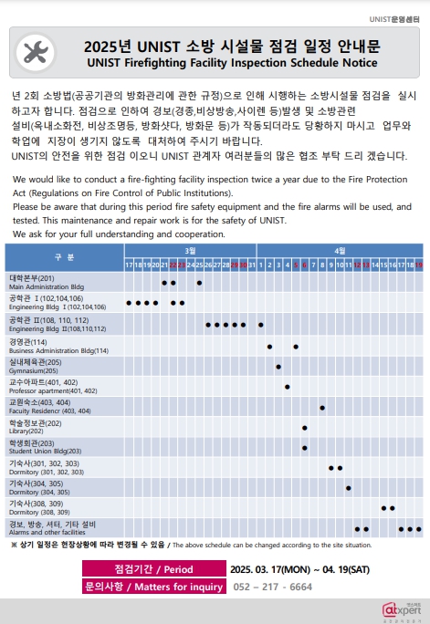 | 1001 | 2025년 UNIST 소방 시설물 자체점검 일정 안내문(UNIST Fire.. | 2025-03-10 | 594 |