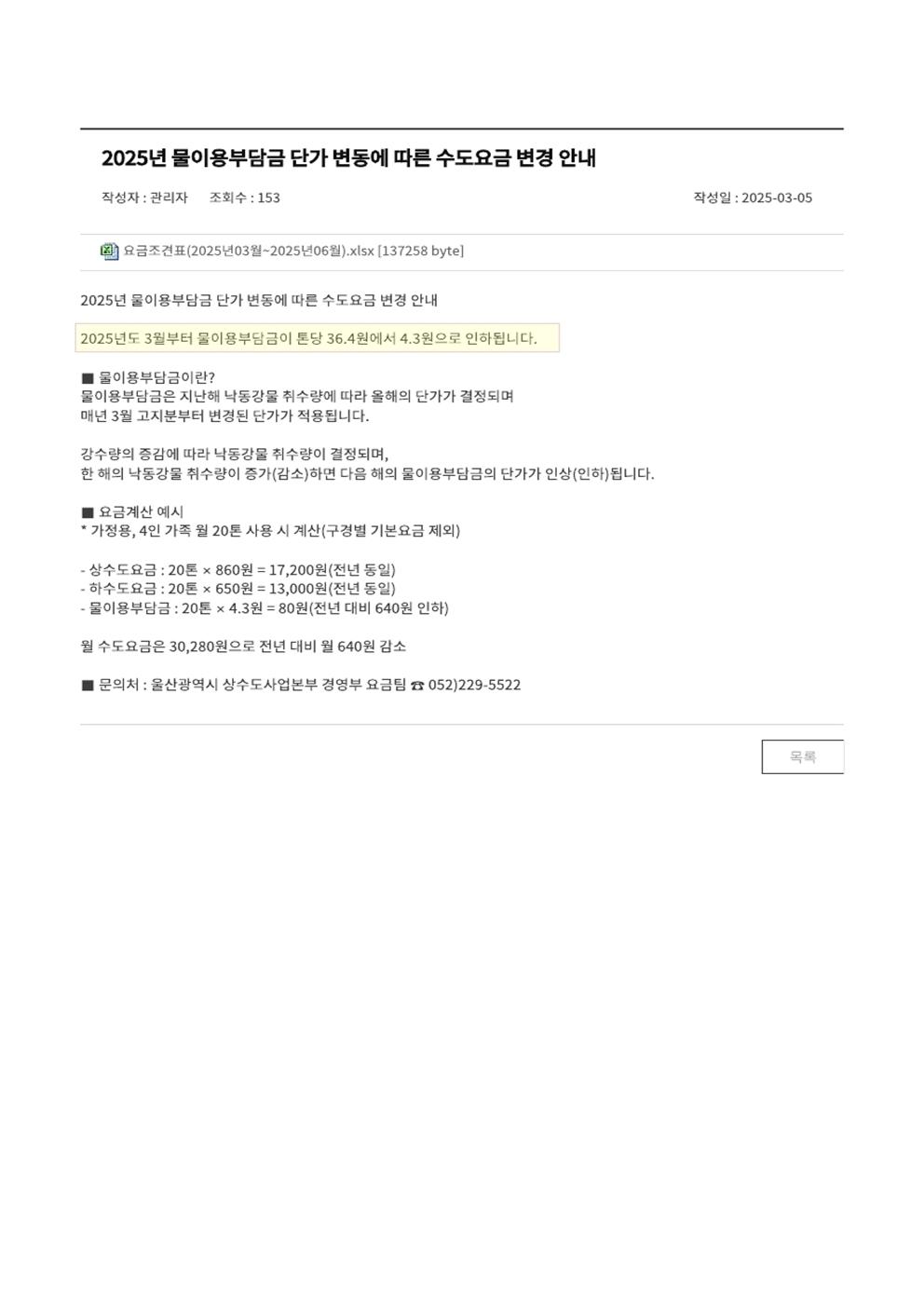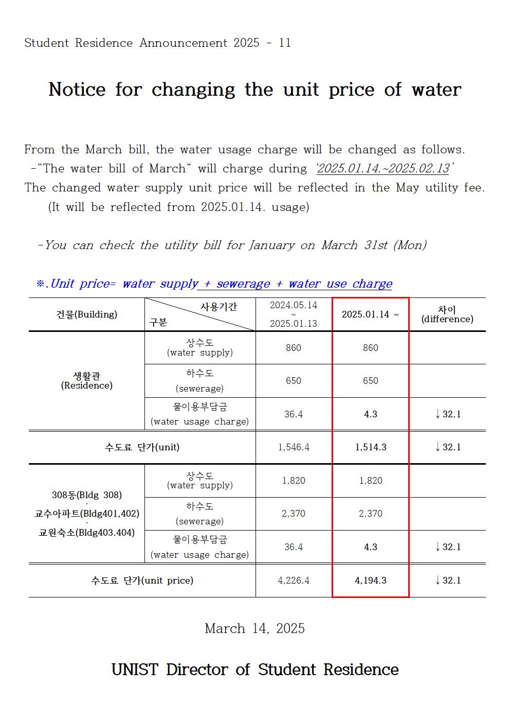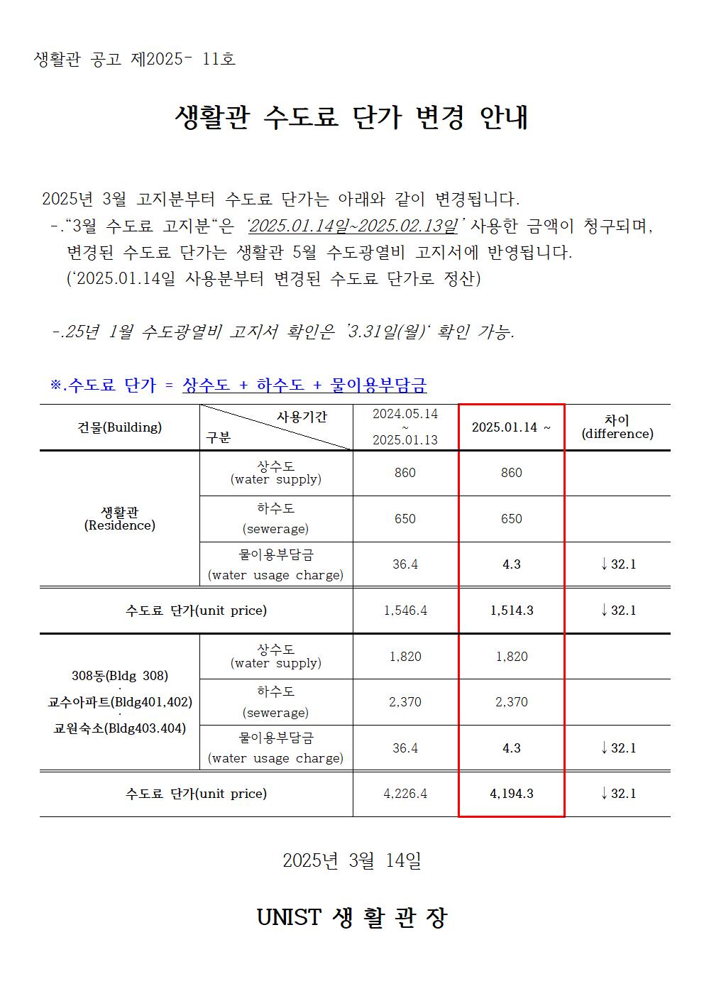 | 1002 | [No.2025-11] 생활관 수도료 단가 변경 안내 (Notice for ch.. | 2025-03-14 | 683 |