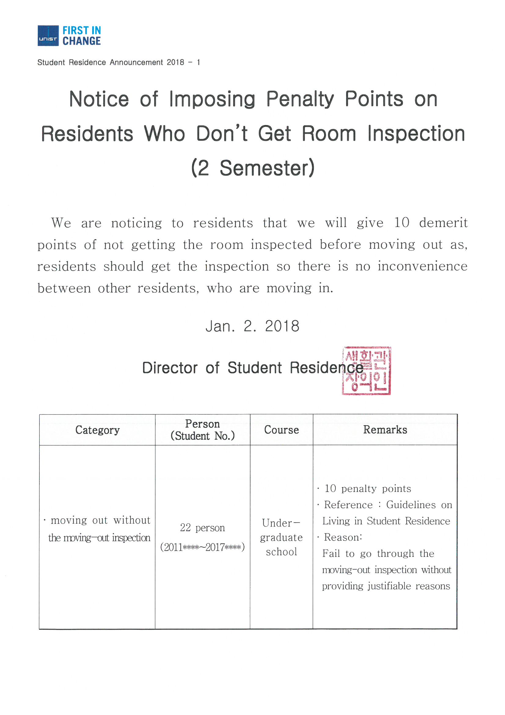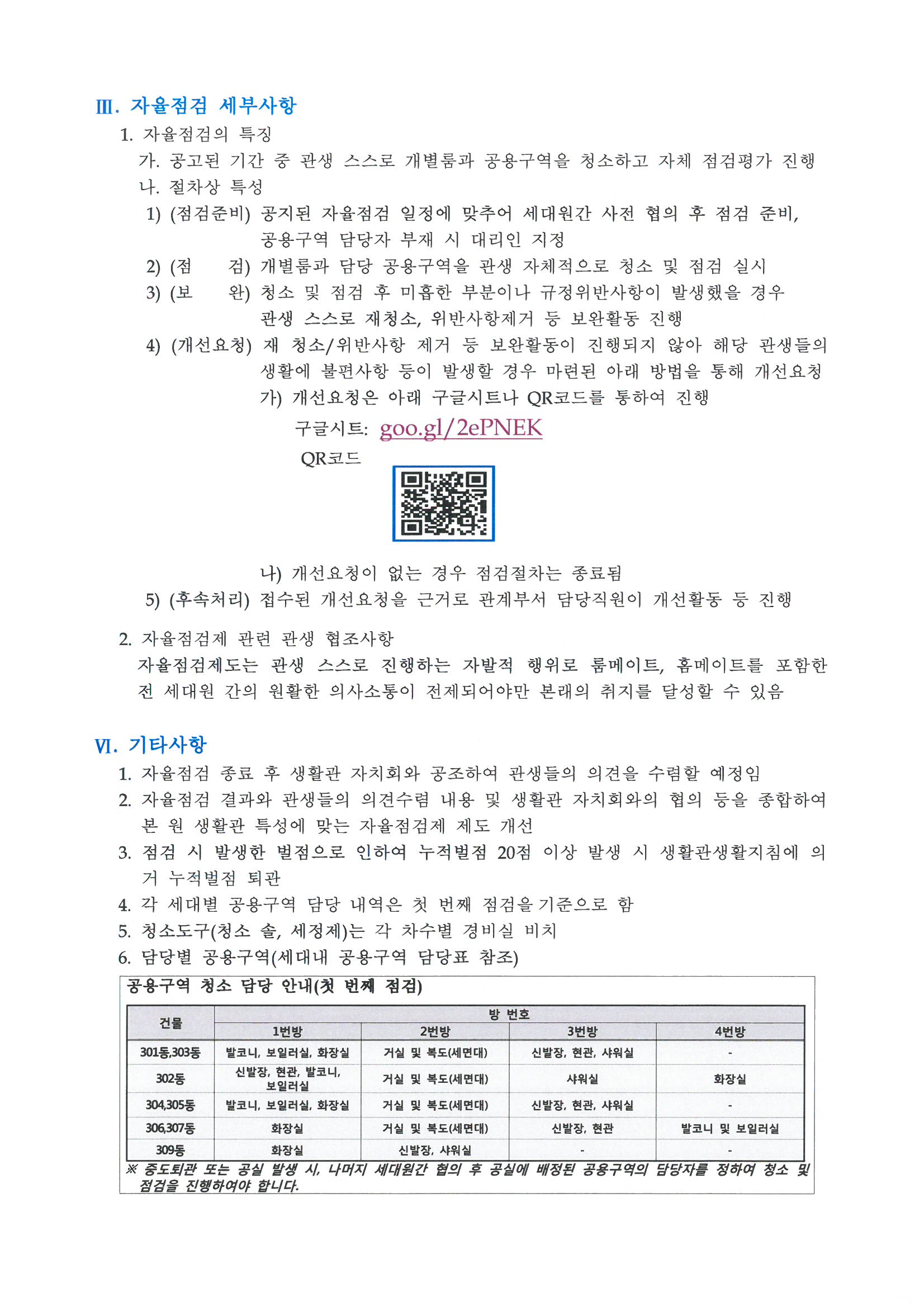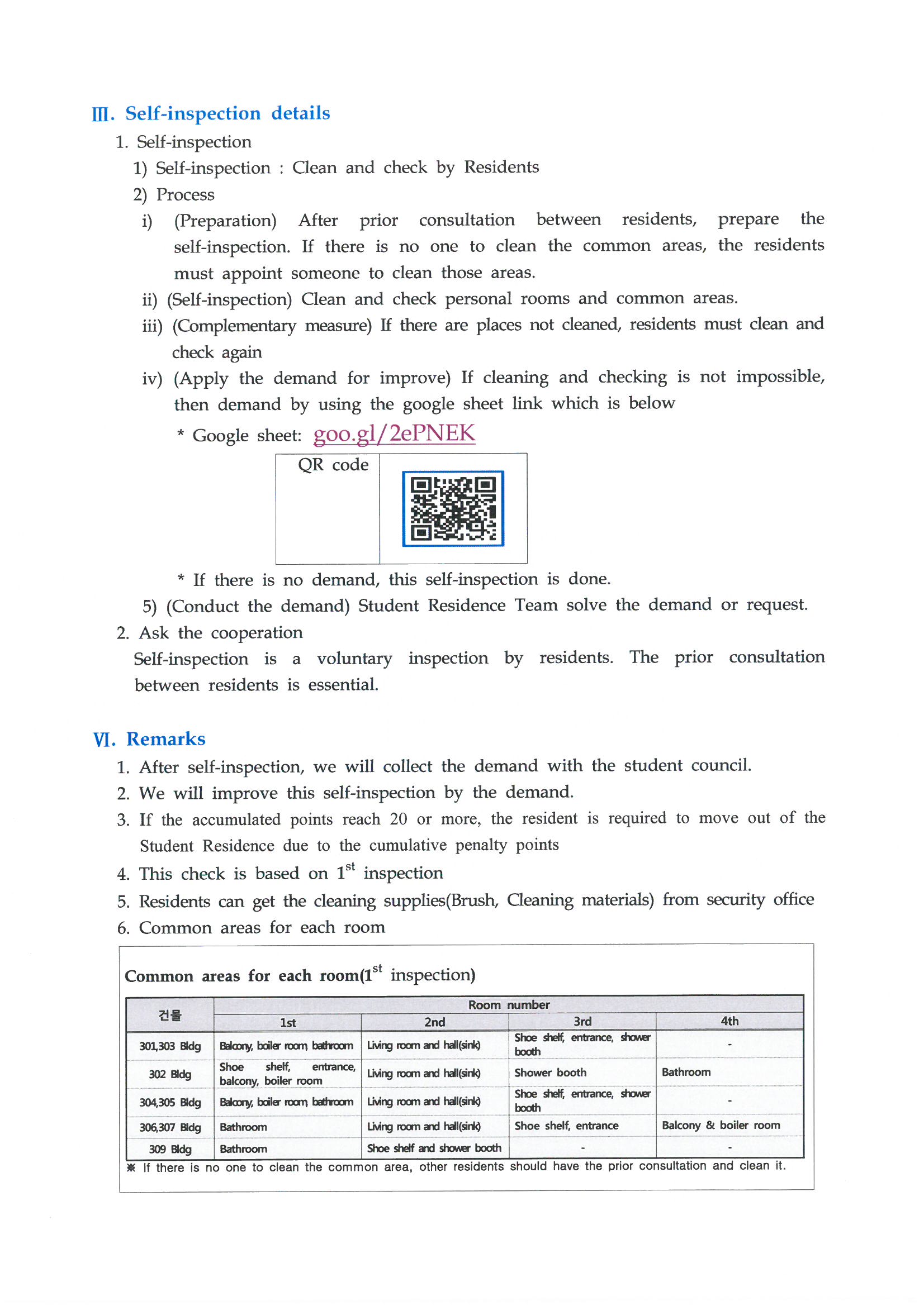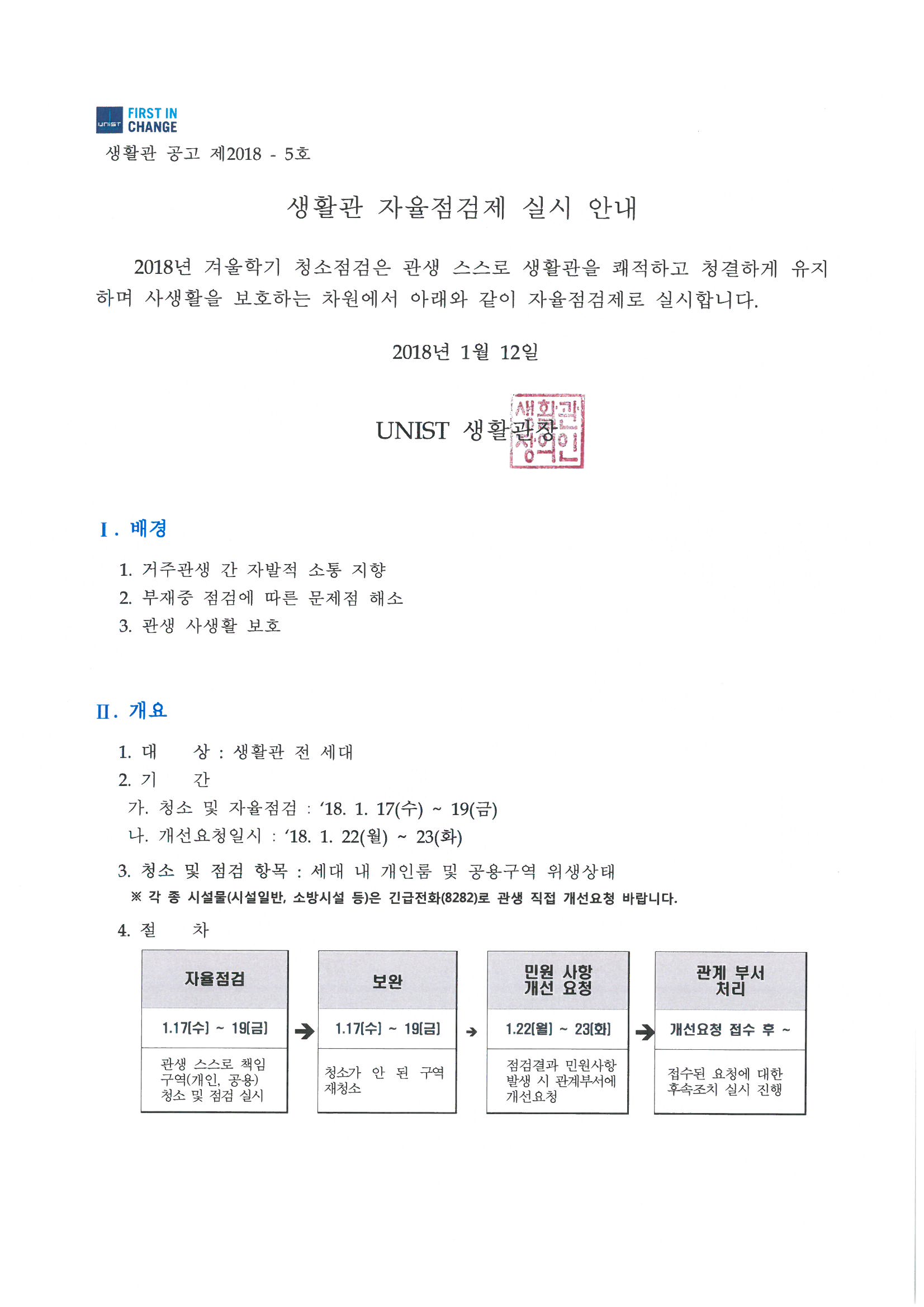 | 5 | (No.2018-05) 생활관 자율점검제 실시 안내 (Notice for Sel.. | 2018-01-13 | 2208 |