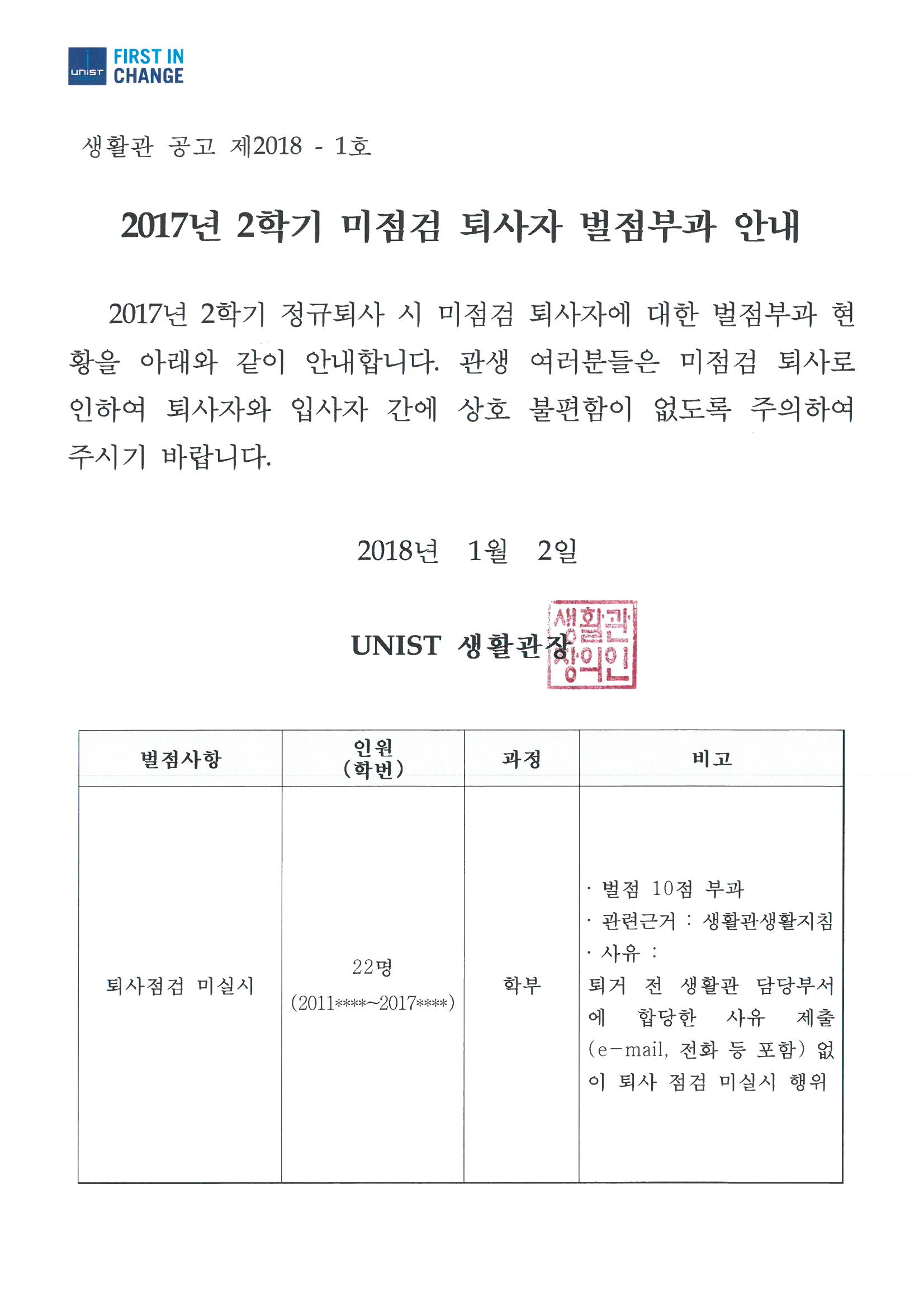 | 1 | (No.2018-01) 2017년 2학기 미점검 퇴사자 벌점부과 안내 (N.. | 2018-01-03 | 4132 |