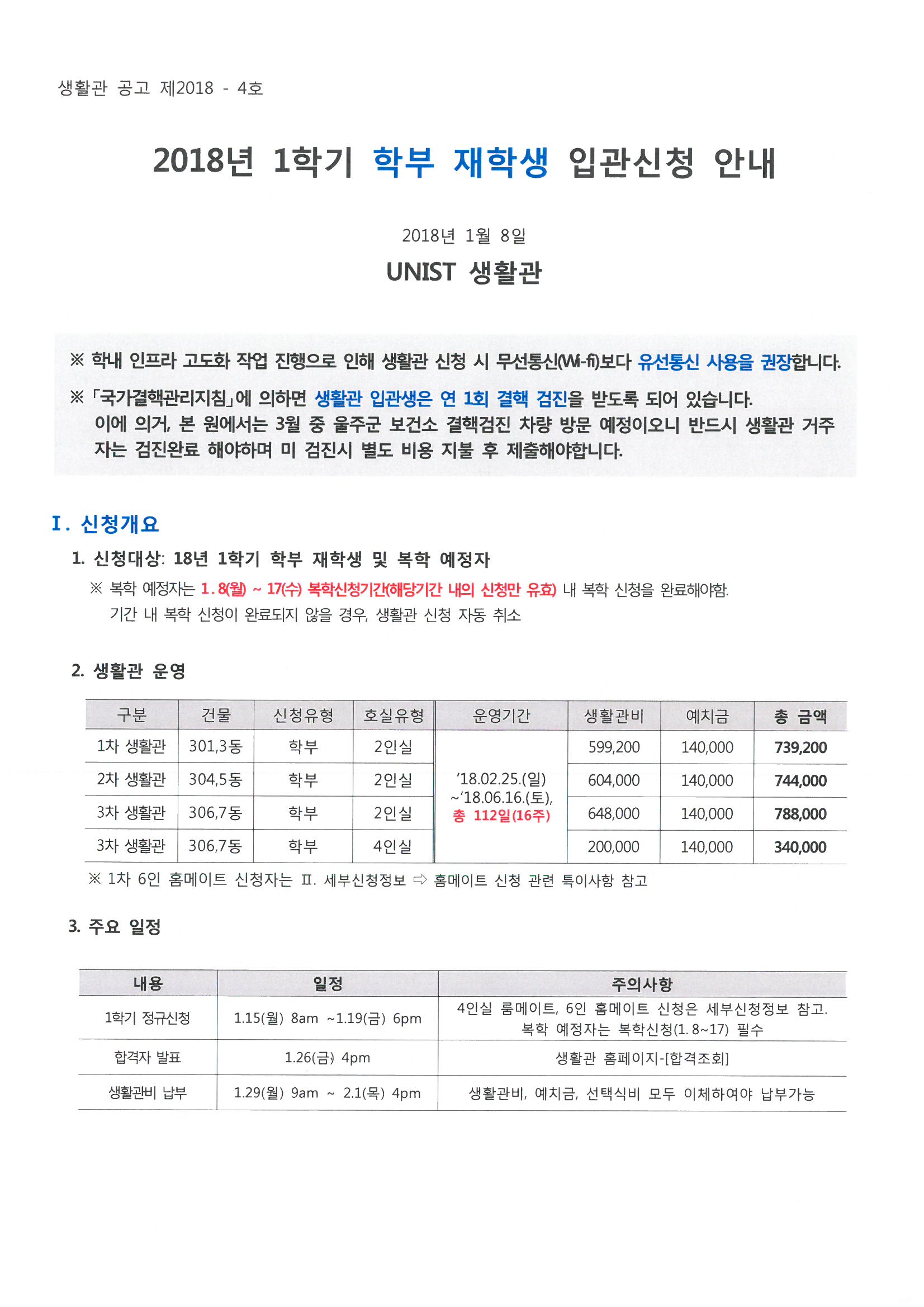 | 4 | (No.2018-04) 2018년1학기 학부 재학생 생활관 입관 신청안.. | 2018-01-09 | 9396 |