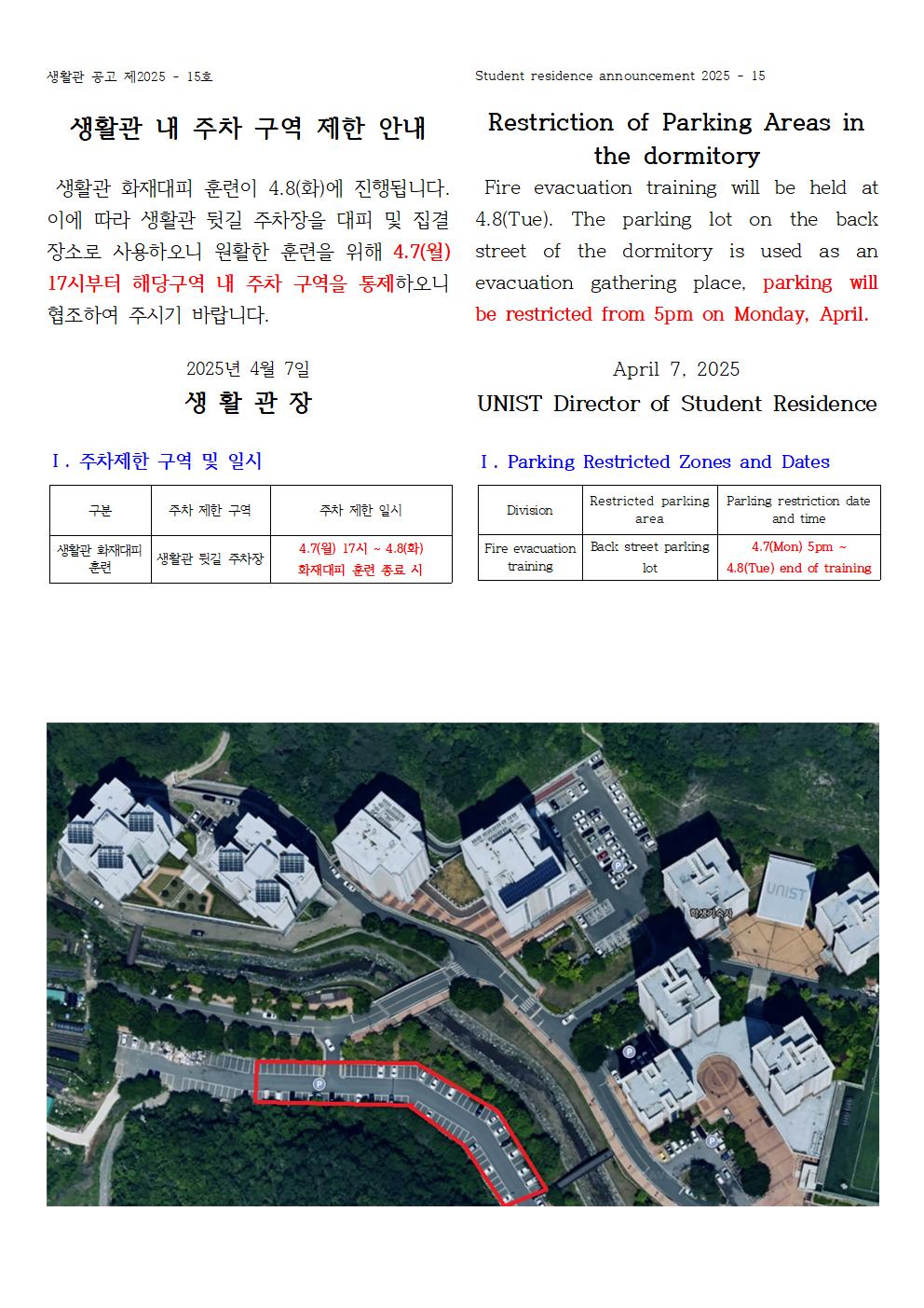 | 1009 | [No. 2025-15] 생활관 내 주차 구역 제한 안내(Restriction .. | 2025-04-07 | 338 |