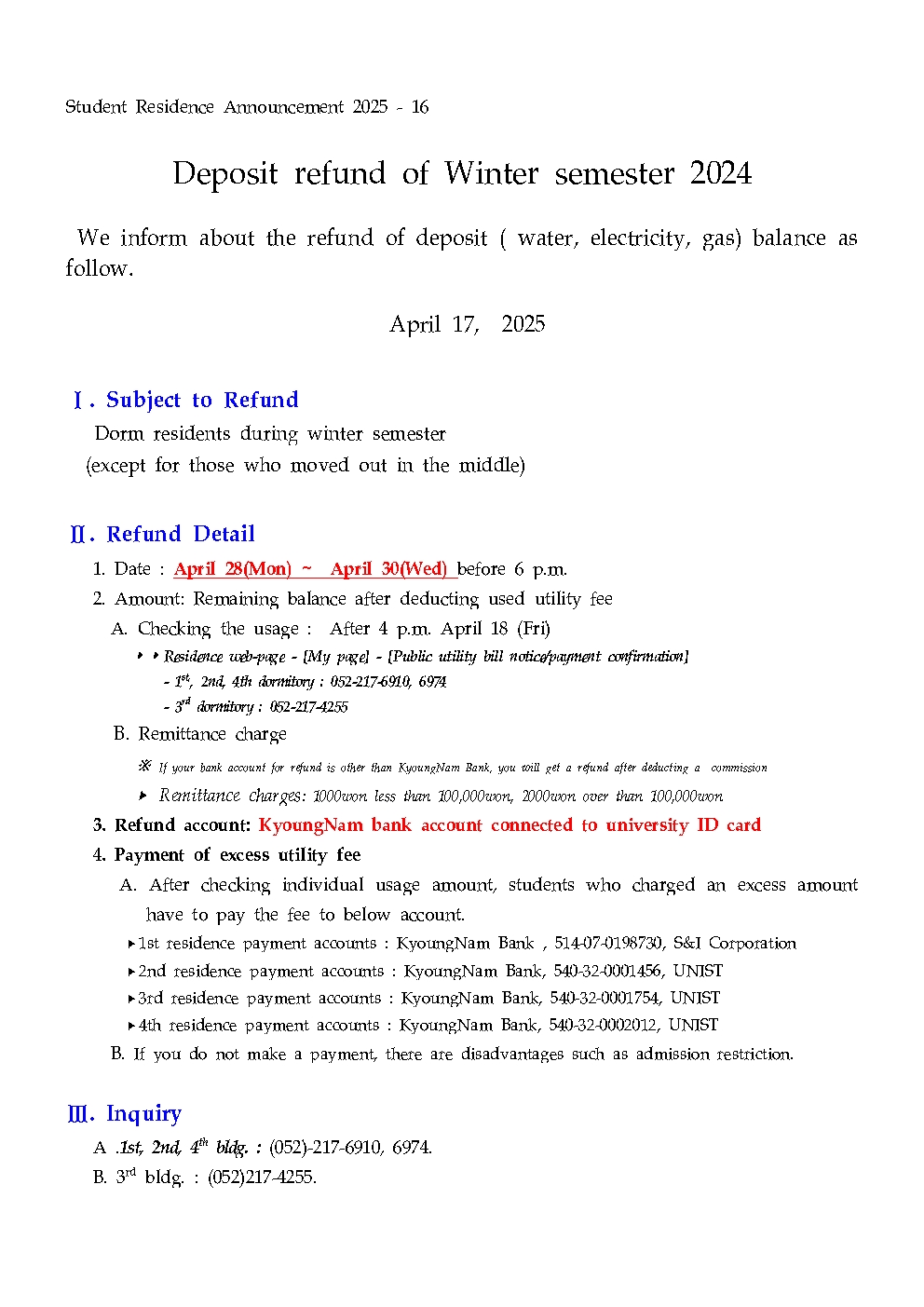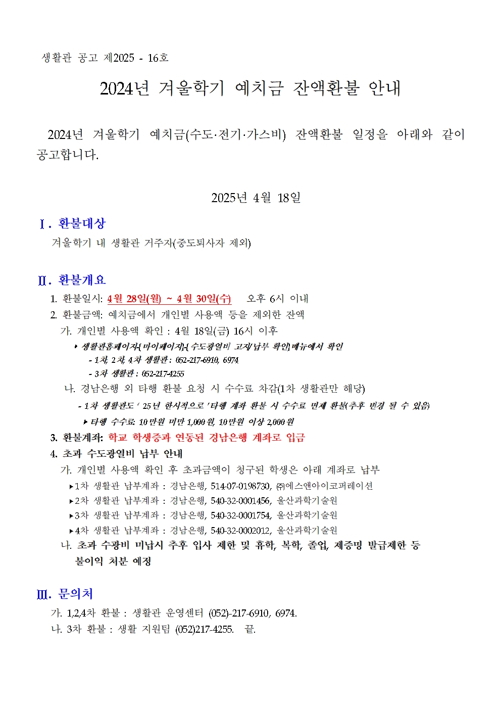 | 1011 | [No.2025-16] 2024년 겨울학기 예치금 잔액환불 안내 (Depos.. | 2025-04-17 | 1019 |
