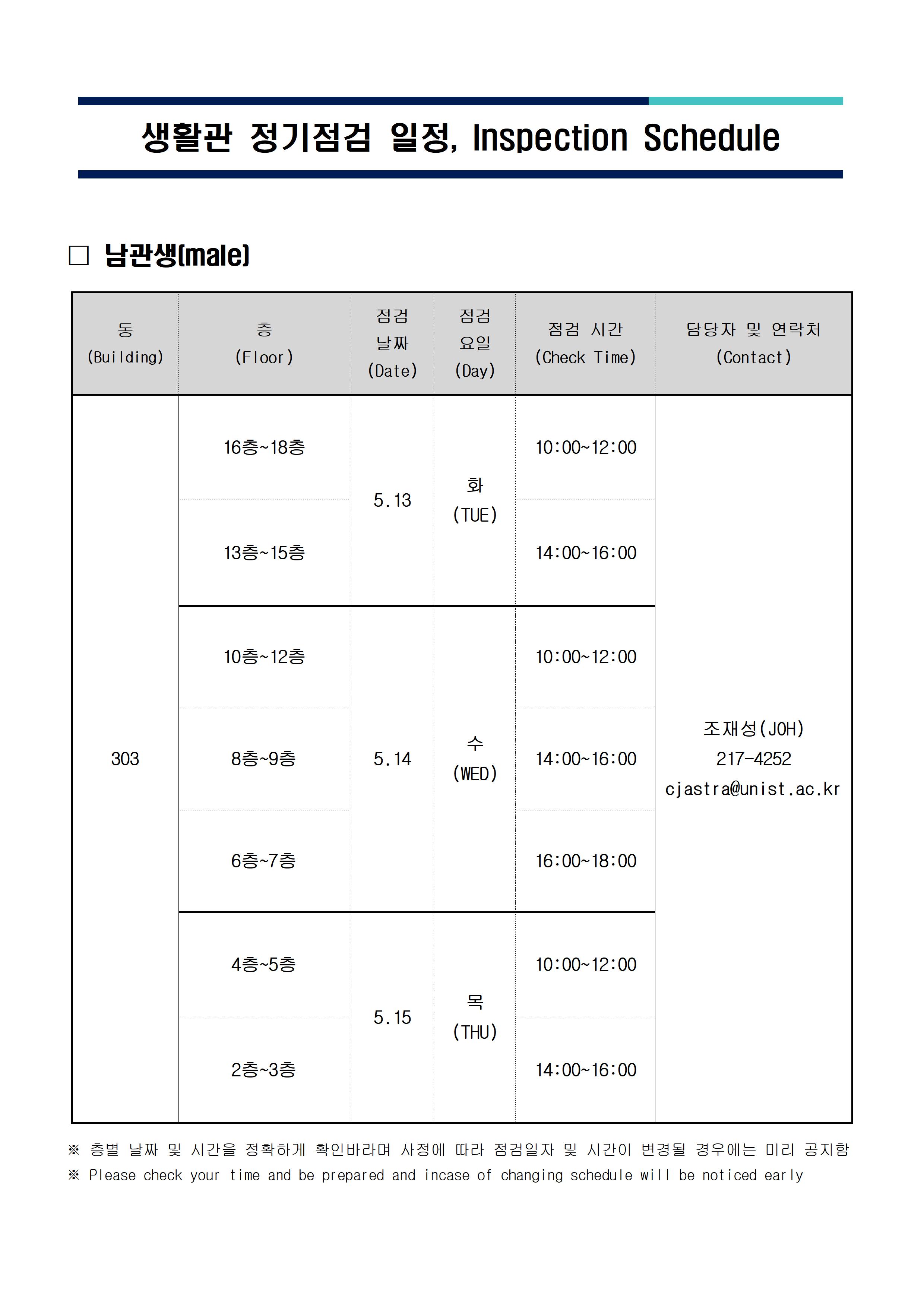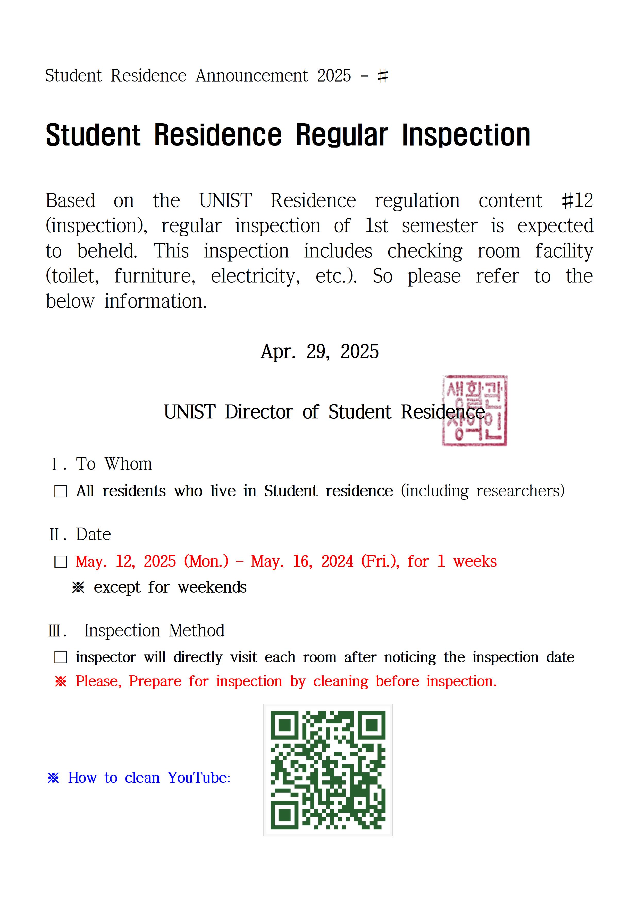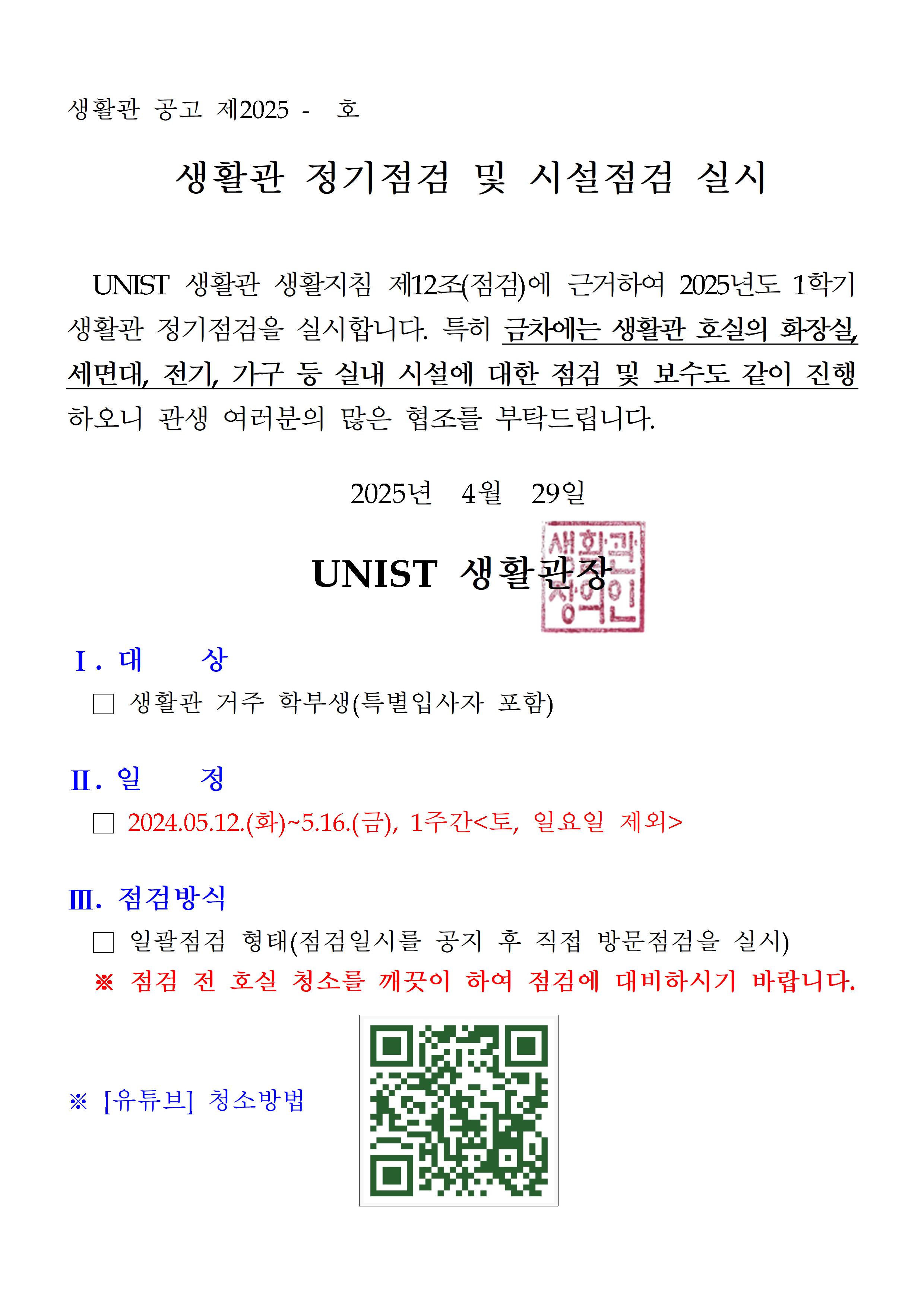 | 1012 | [No.2025-17] 2025년 1학기 생활관 정기점검(regular inspec.. | 2025-04-29 | 6305 |