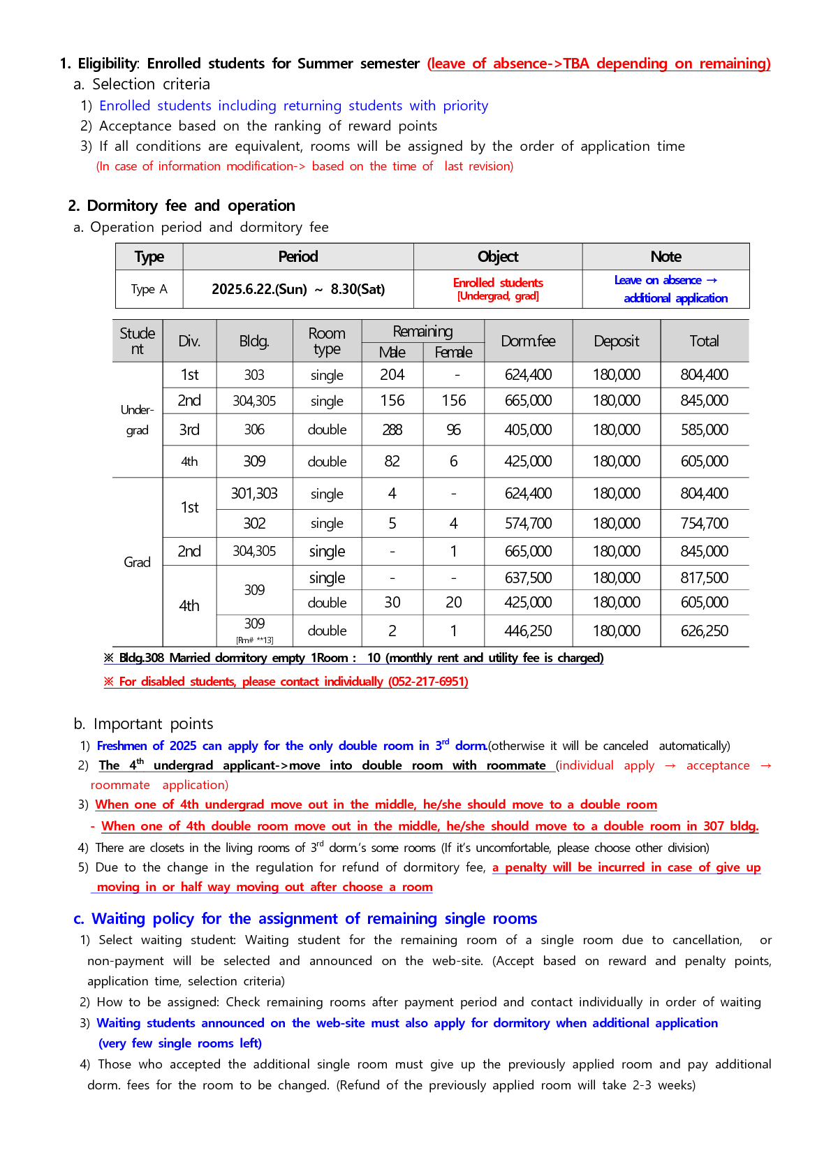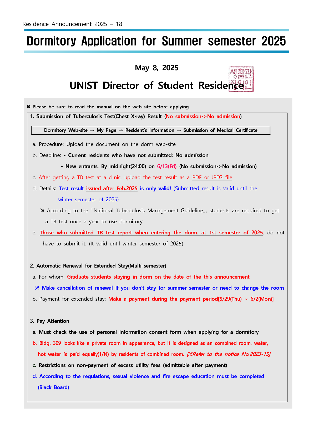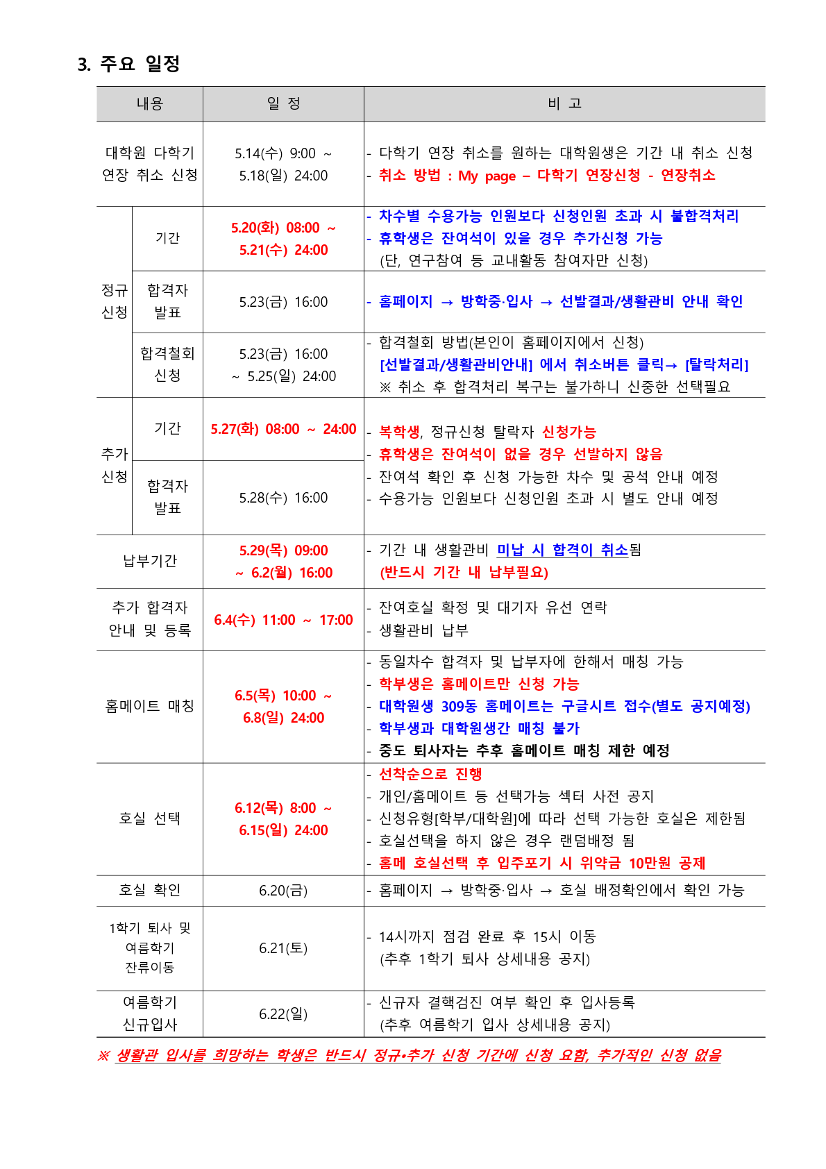 | 1017 | 2025학년도 1학기 연장 거주 신청 안내 | Notice for Dormit.. | 2025-05-23 | 1503 | |