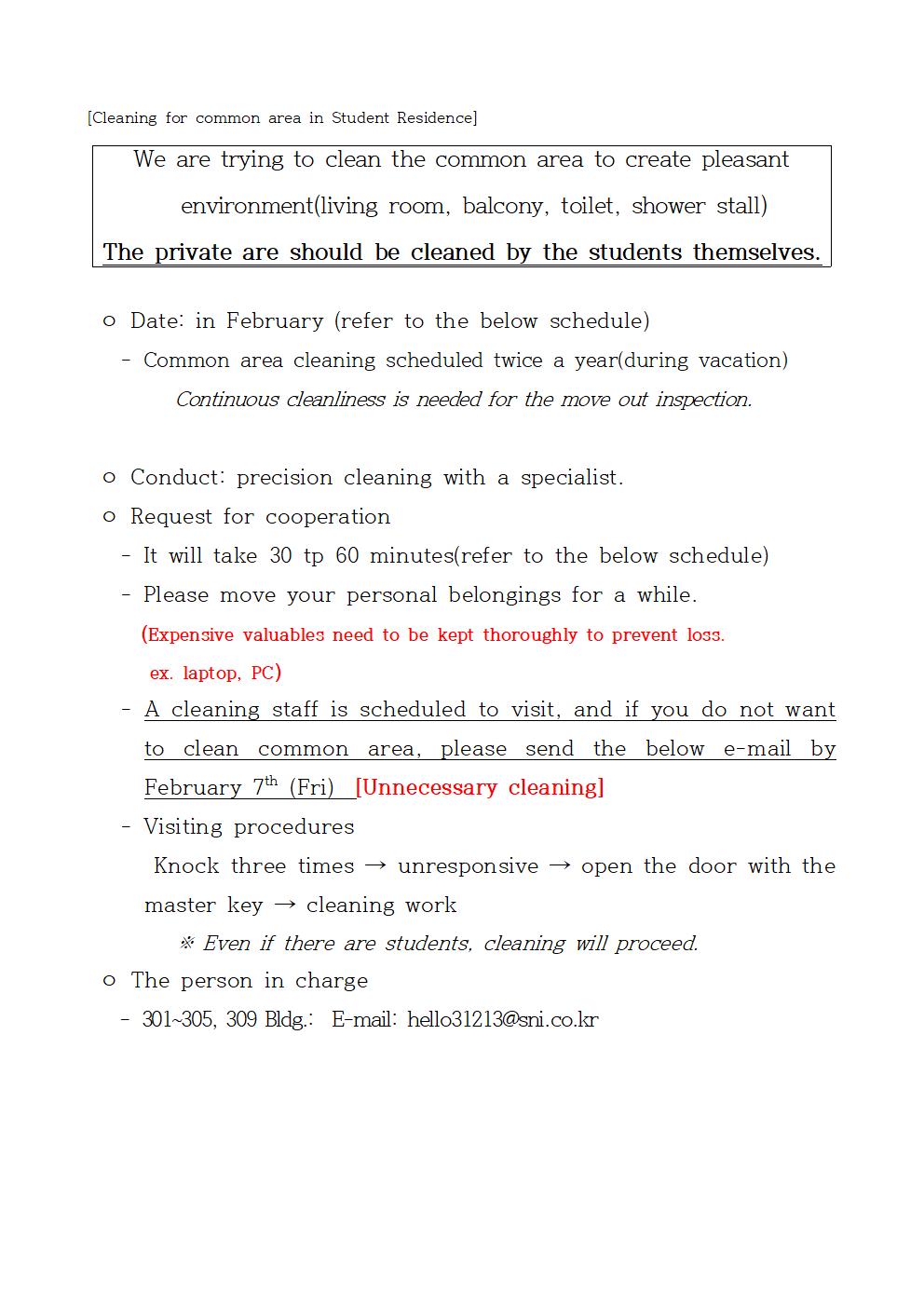 | 985 | 생활관 호실 내 공용구역 청소공지 (Cleaning for common ar.. | 2025-02-05 | 1305 |