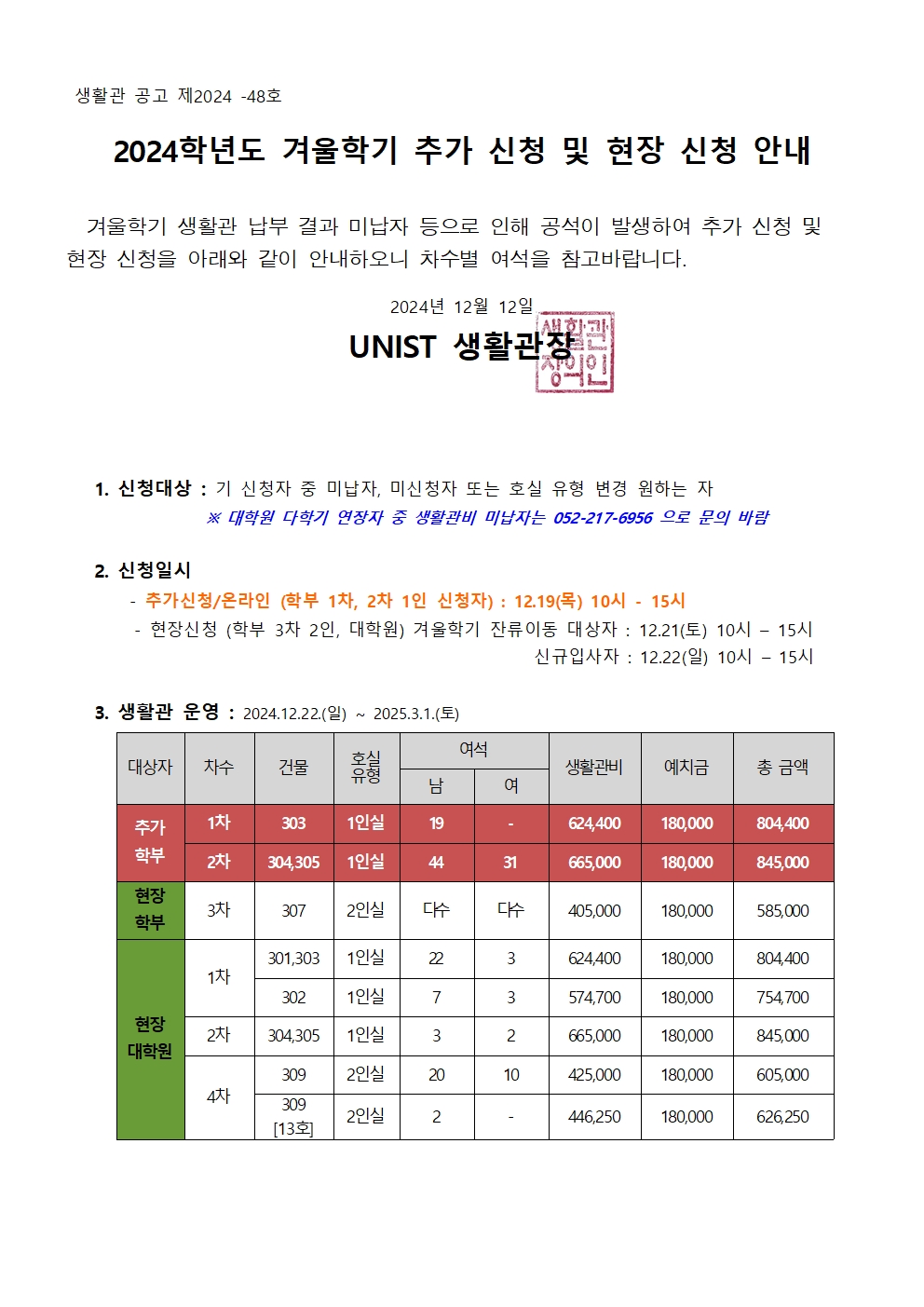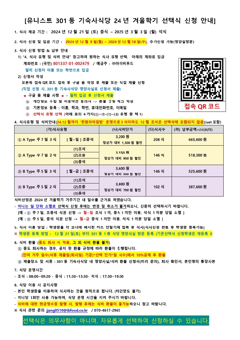 | 968 | 유니스트 301동 기숙사식당 24년 겨울학기 선택식 신청 안내 | 2024-12-06 | 757 |