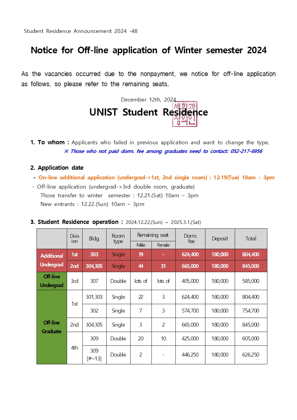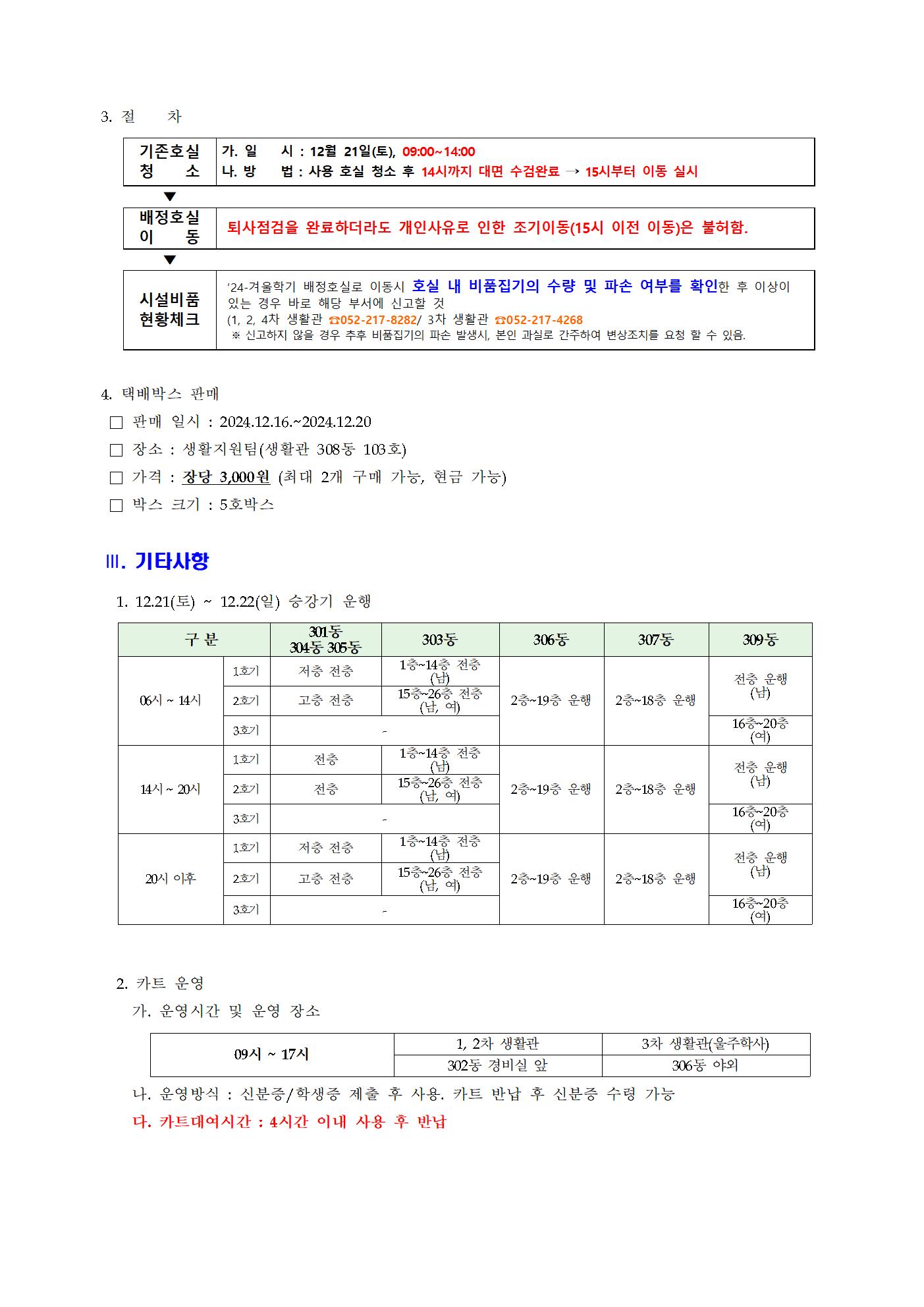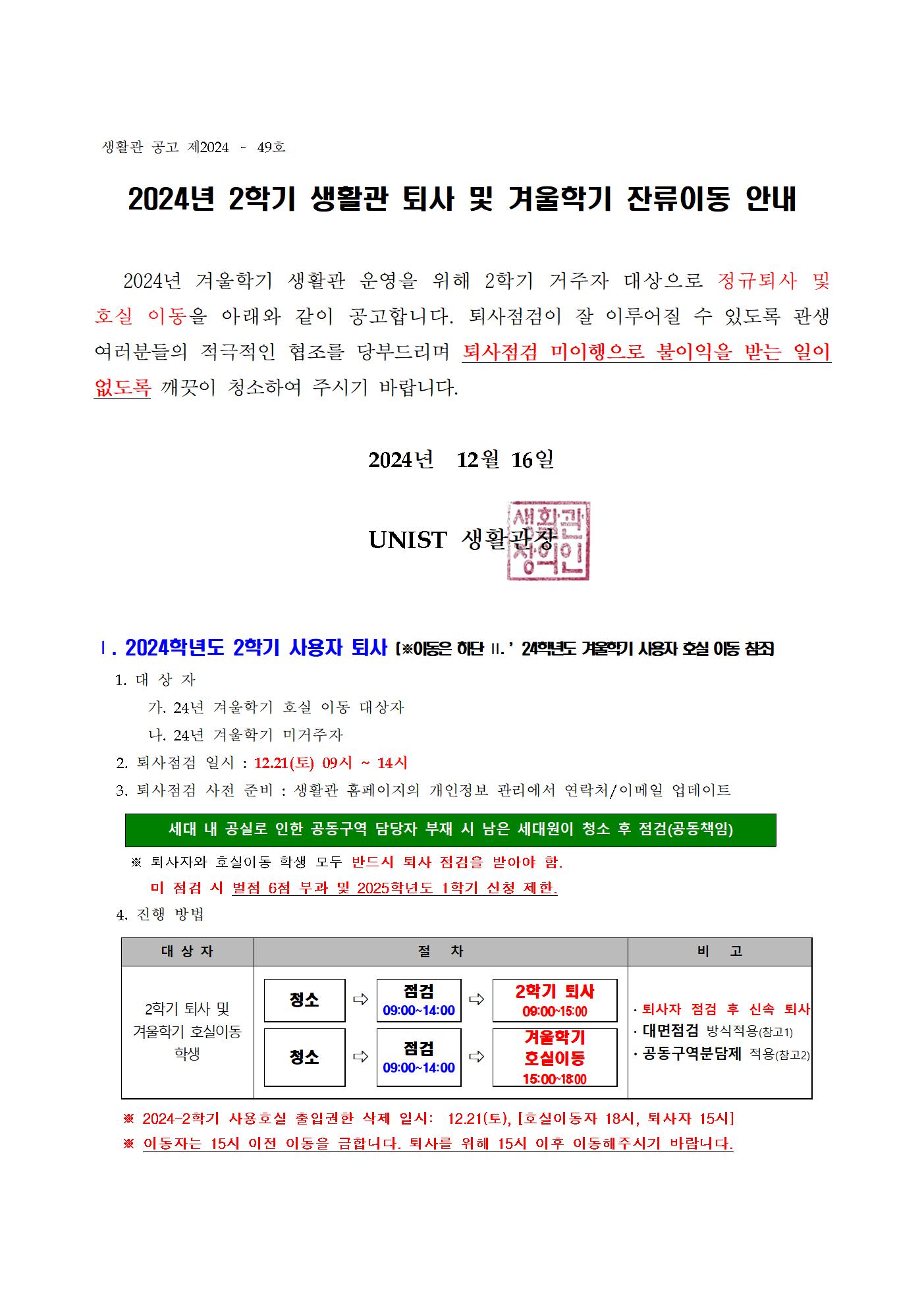 | 970 | [No.2024-49] 2024년 2학기 생활관 퇴사 및 겨울학기 잔류이.. | 2024-12-16 | 2912 |