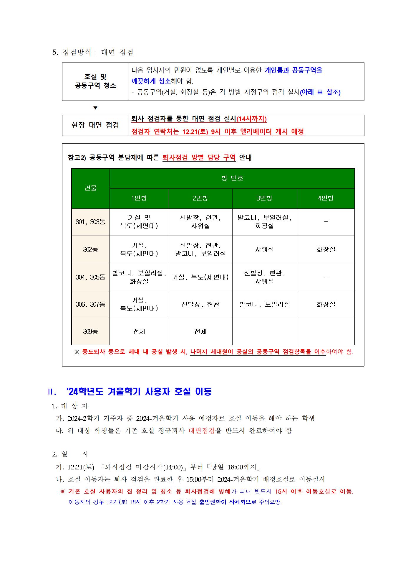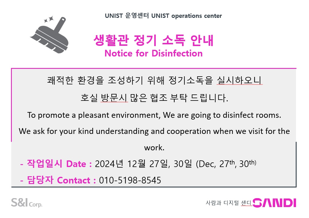 | 972 | 생활관 정기소독 안내(Notice for Disinfection) | 2024-12-23 | 470 |