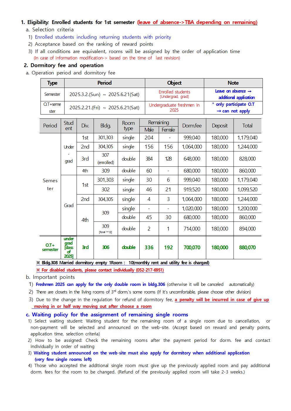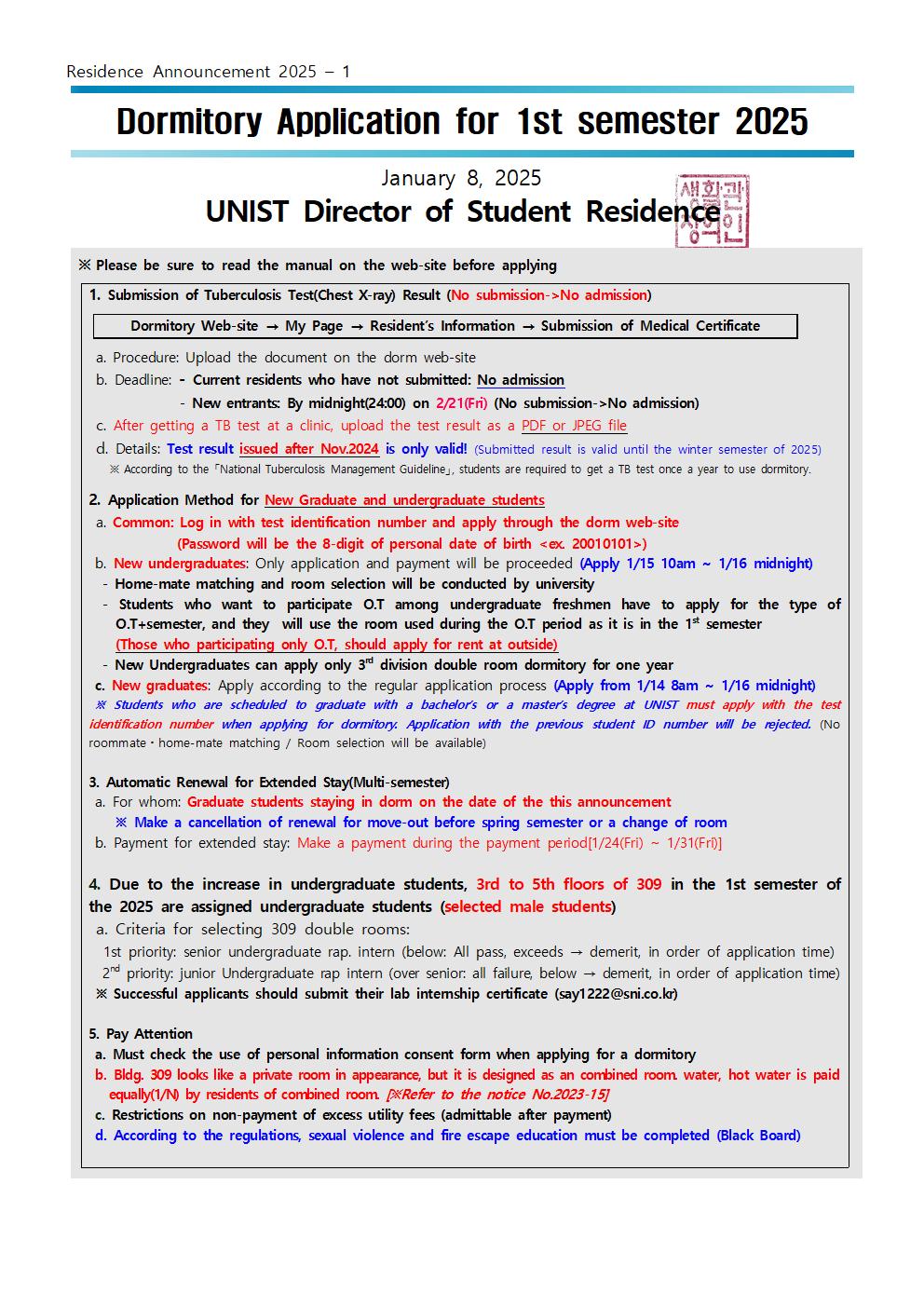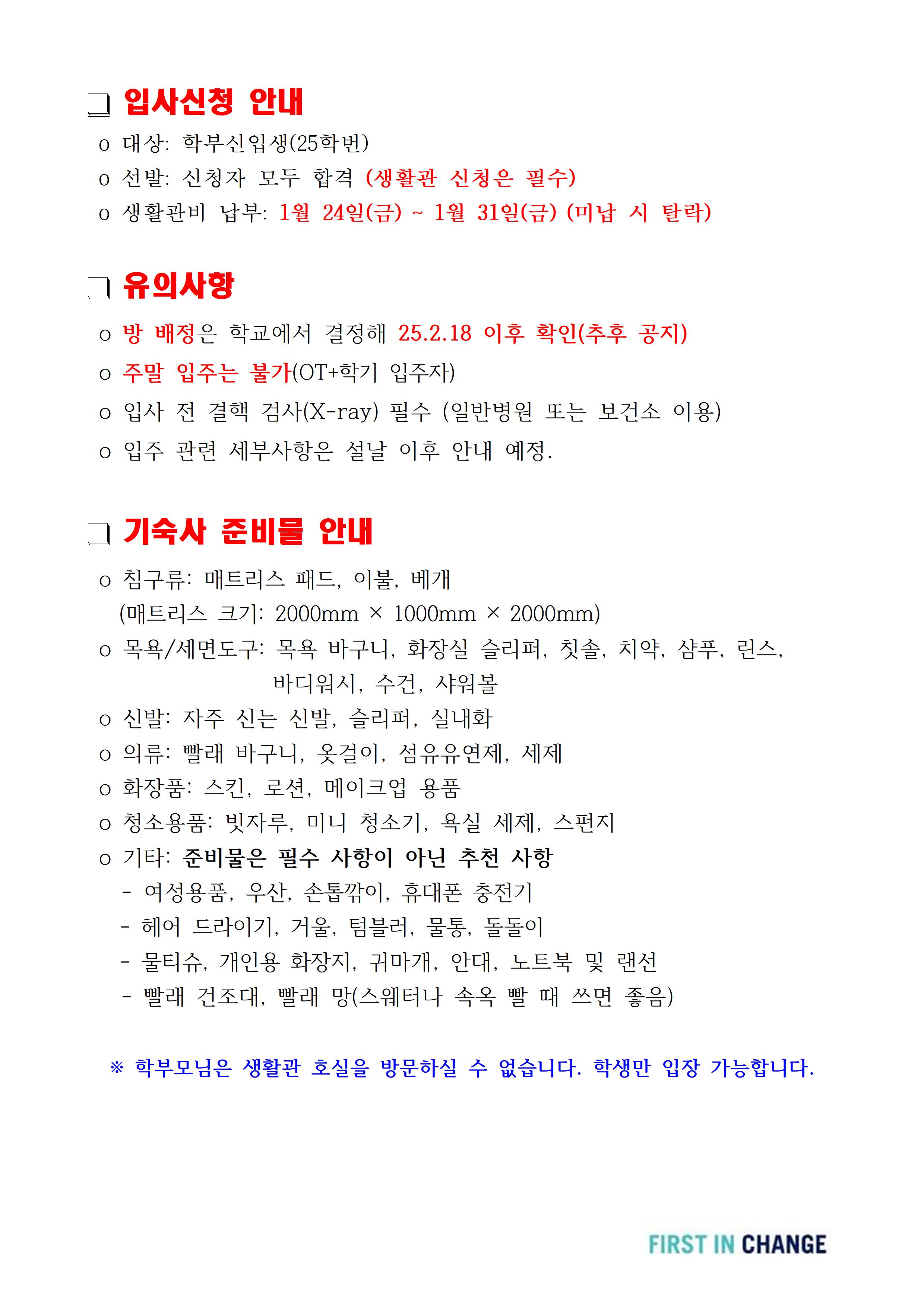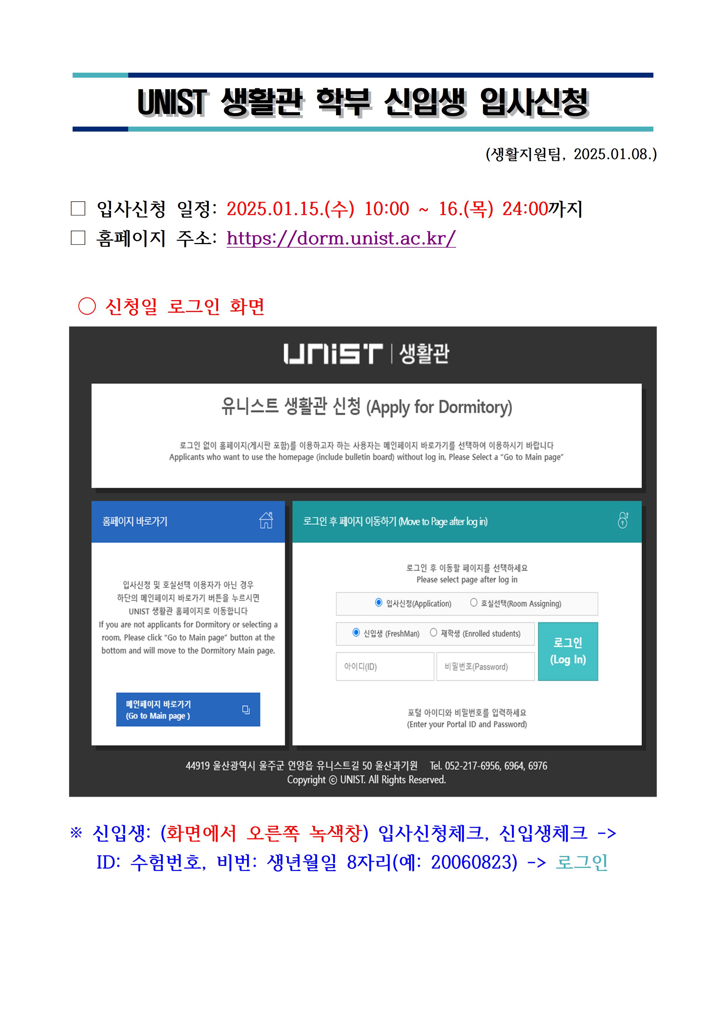 | 976 | 2025학년도 1학기 학부신입생 생활관 신청(Application for .. | 2025-01-08 | 7808 |