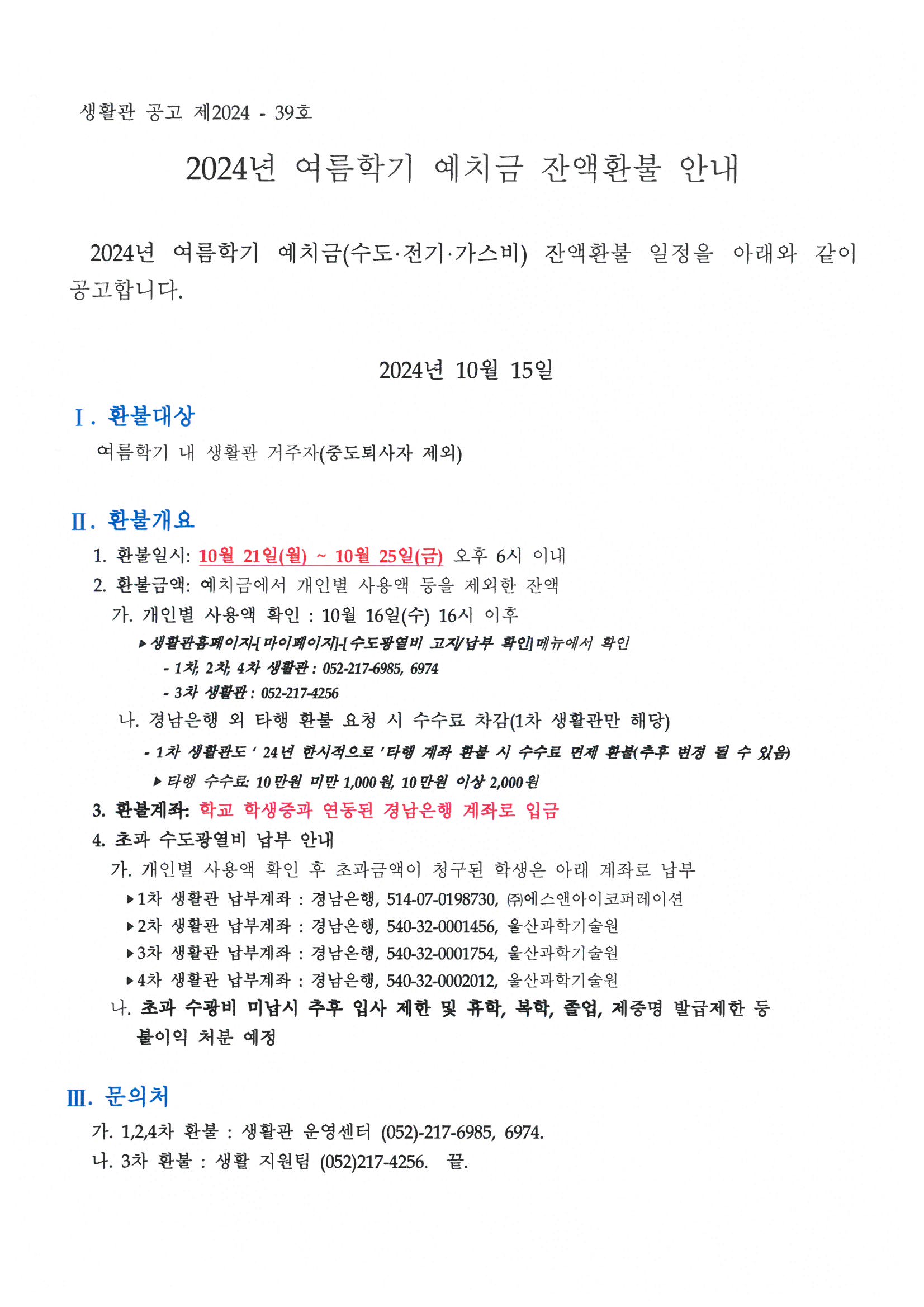 | 953 | [No.2024-39] 2024년 여름학기 예치금 잔액환불 안내(Deposi.. | 2024-10-15 | 944 |