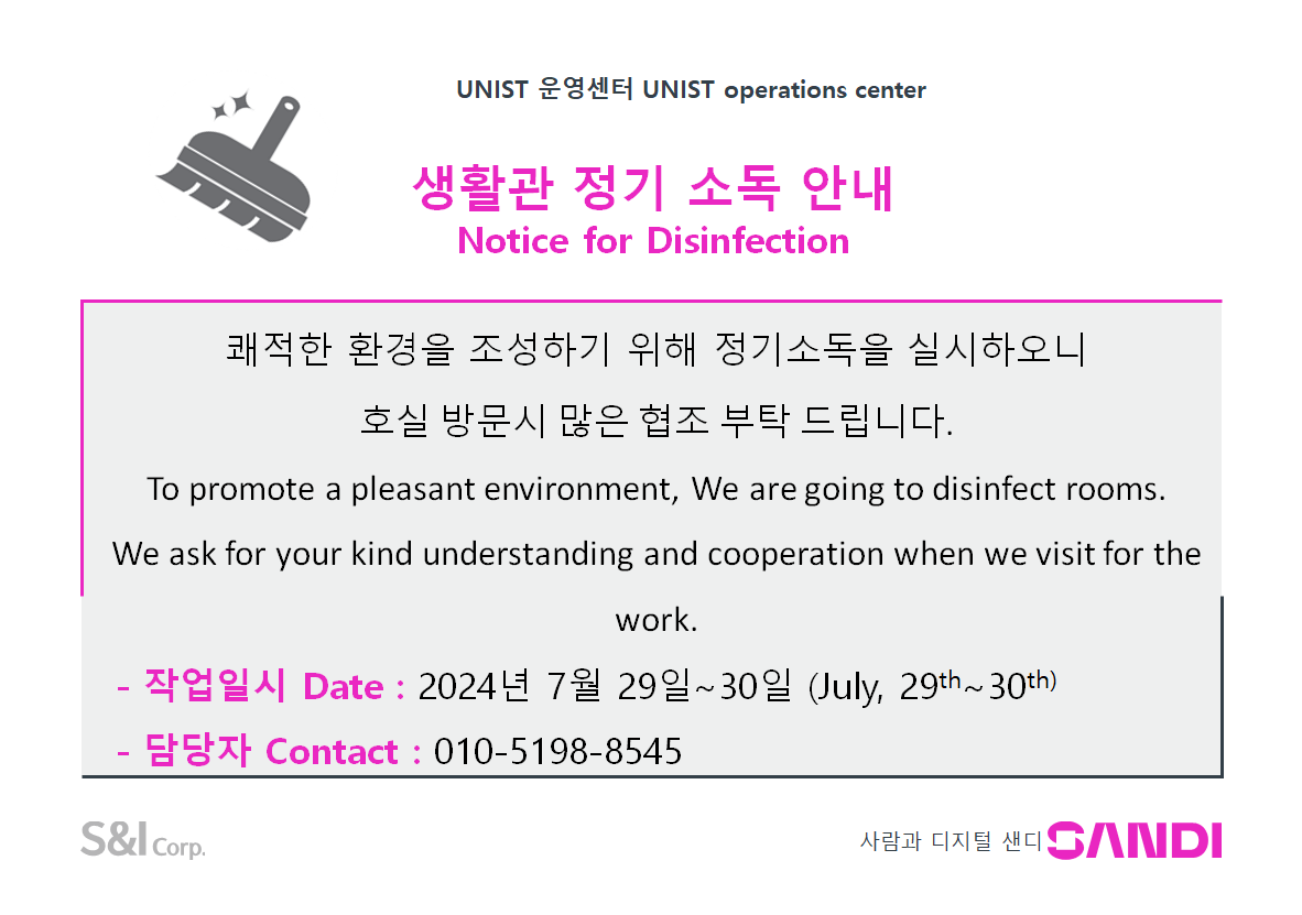 | 929 | 정기소독안내(Notice for Disinfection) | 2024-07-24 | 837 |