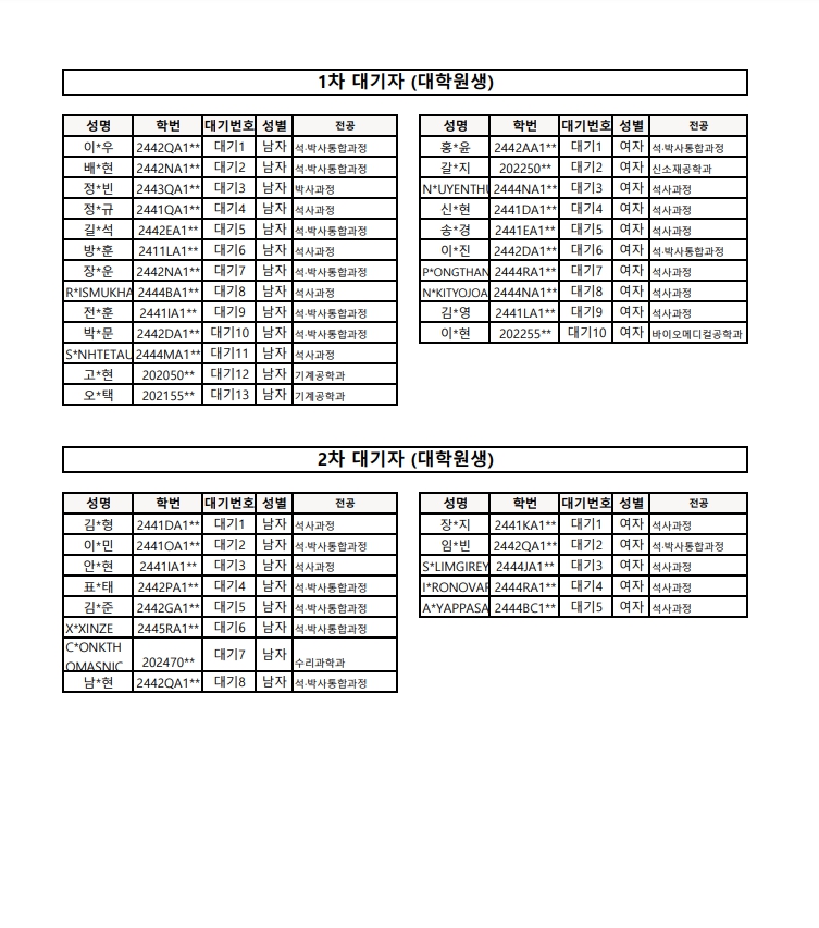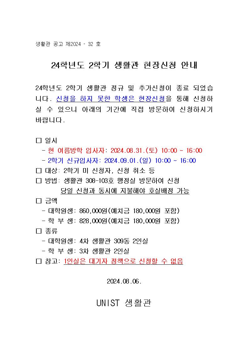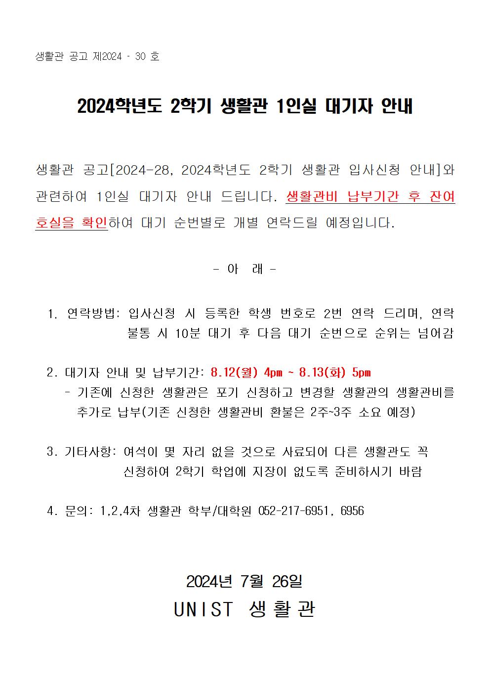 | 930 | 2024학년도 2학기 1인실 대기자 안내 (Notice for waiting p.. | 2024-07-26 | 3475 |