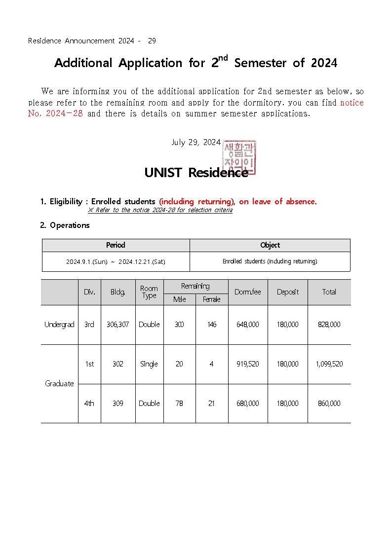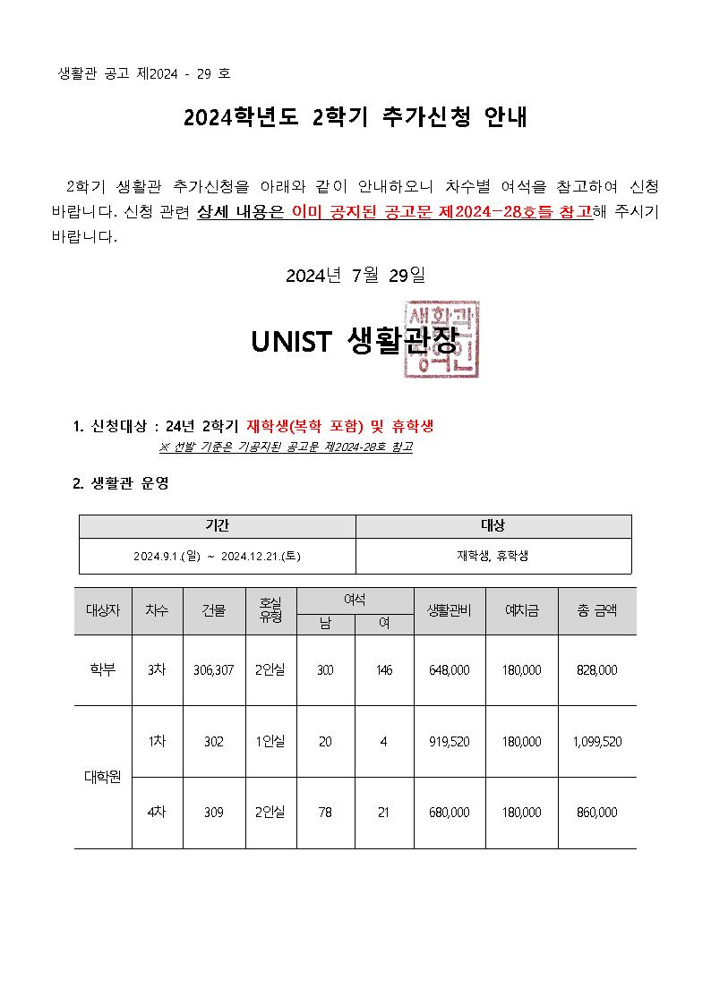 | 931 | [No.2024-29]2024학년도 2학기 생활관 추가신청 안내(Additi.. | 2024-07-29 | 3461 |