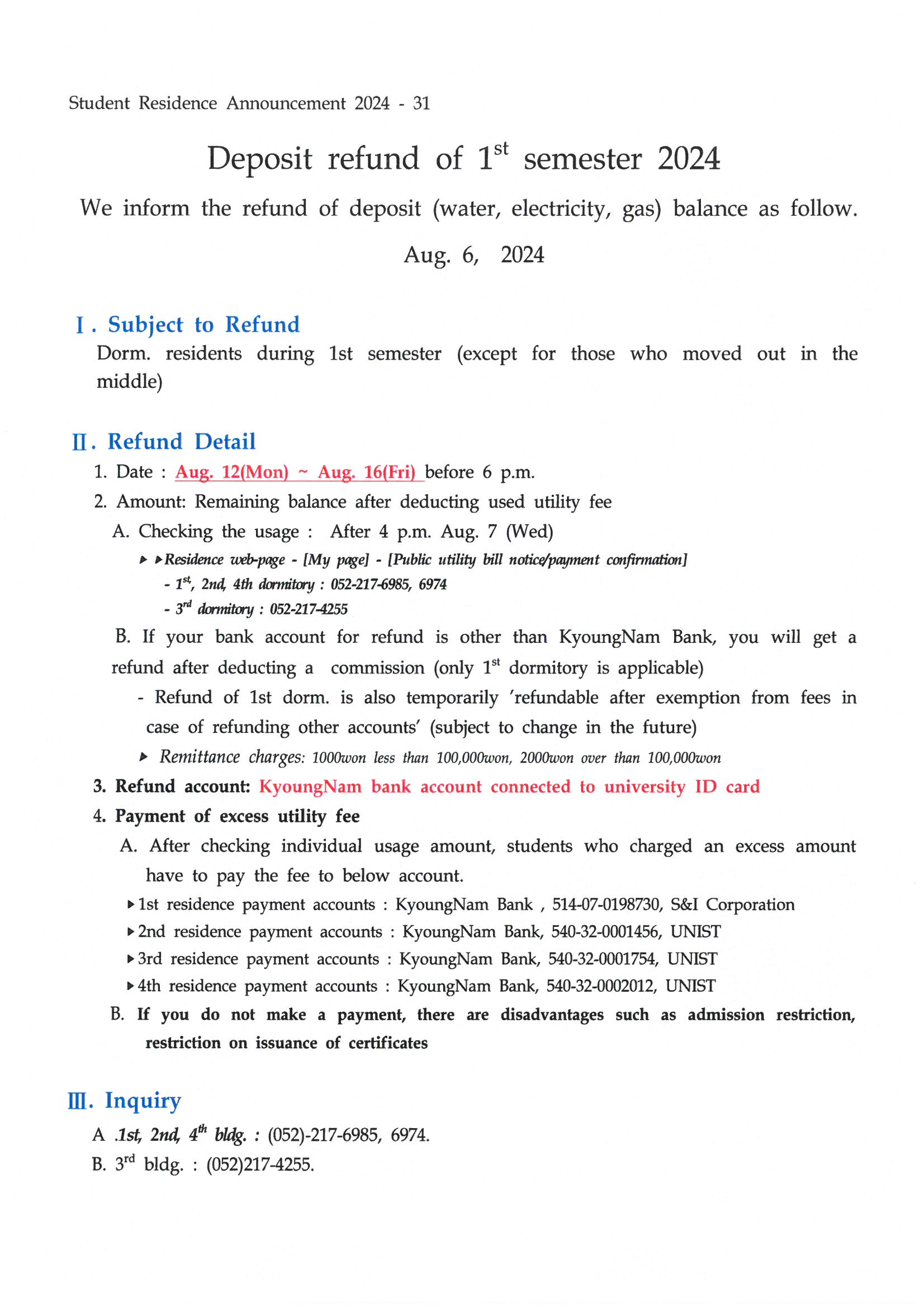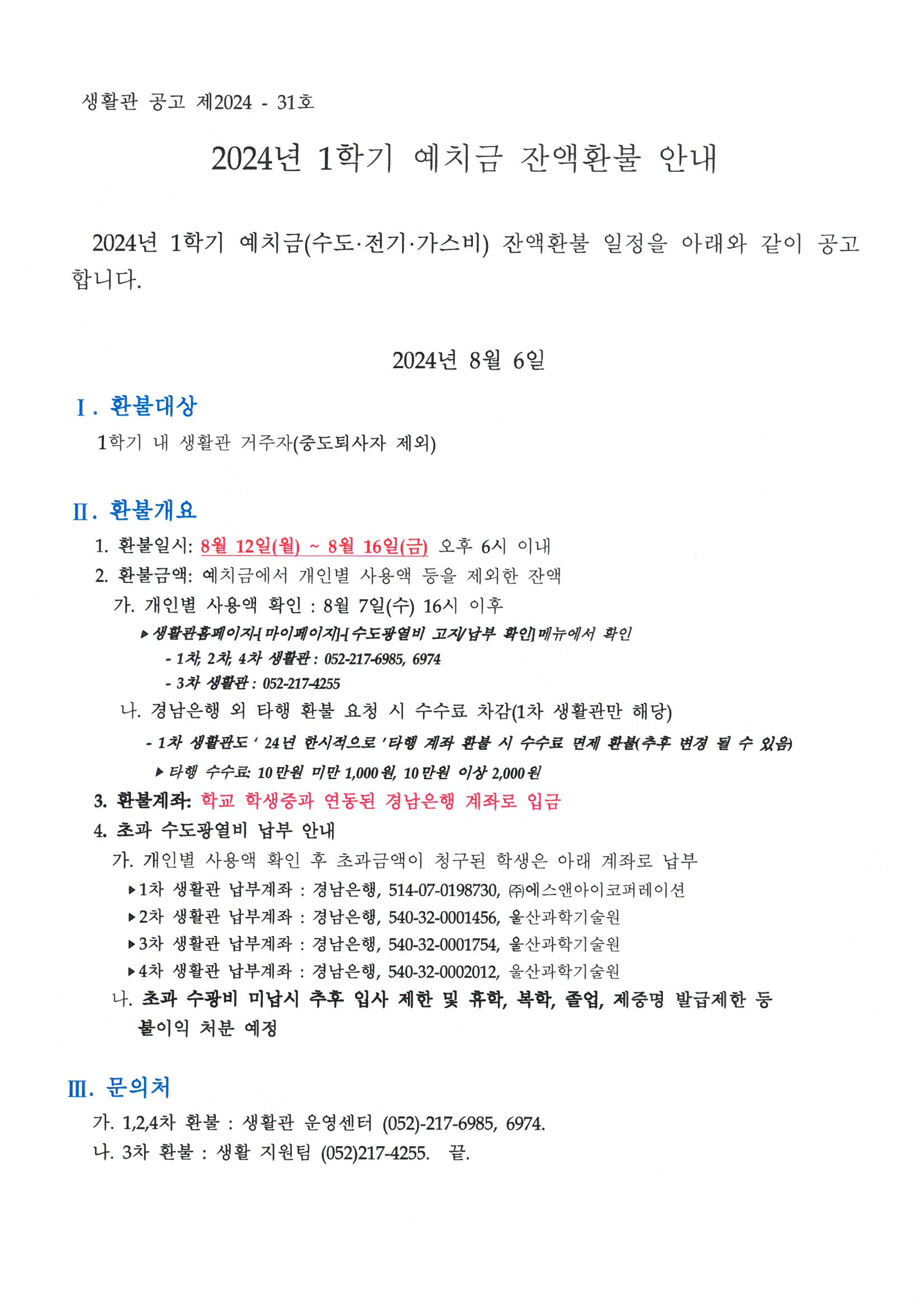 | 933 | [No.2024-31]2024년 1학기 예치금 잔액환불 안내(Notice for.. | 2024-08-06 | 2216 |