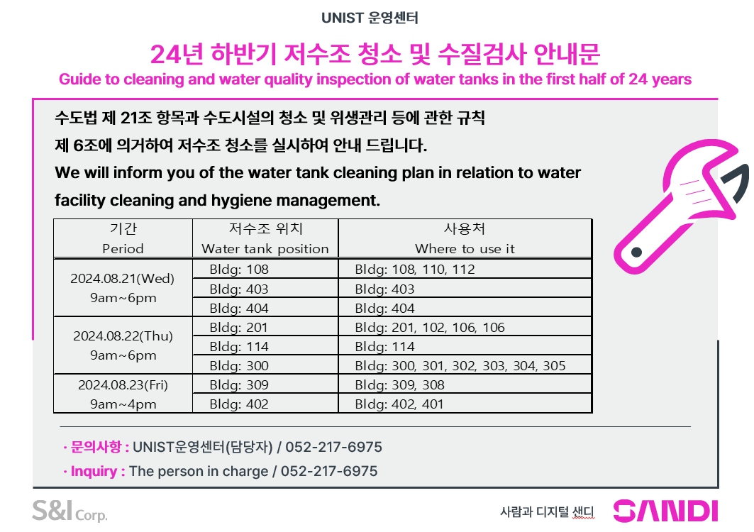 | 937 | 24년 하반기 저수조청소 및 수질검사 안내문(Guide to clean.. | 2024-08-13 | 546 |