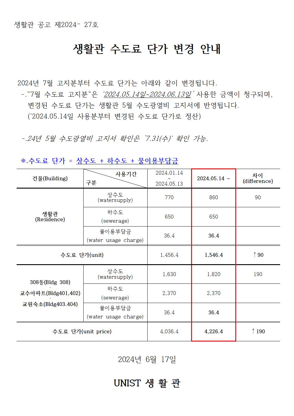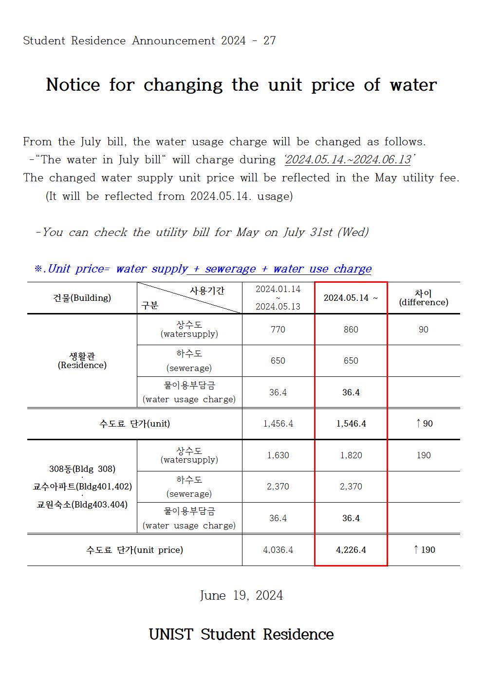 | 919 | [No.2024-27] 2024년 생활관 수도료 단가 변경 안내(Notice .. | 2024-06-19 | 822 |